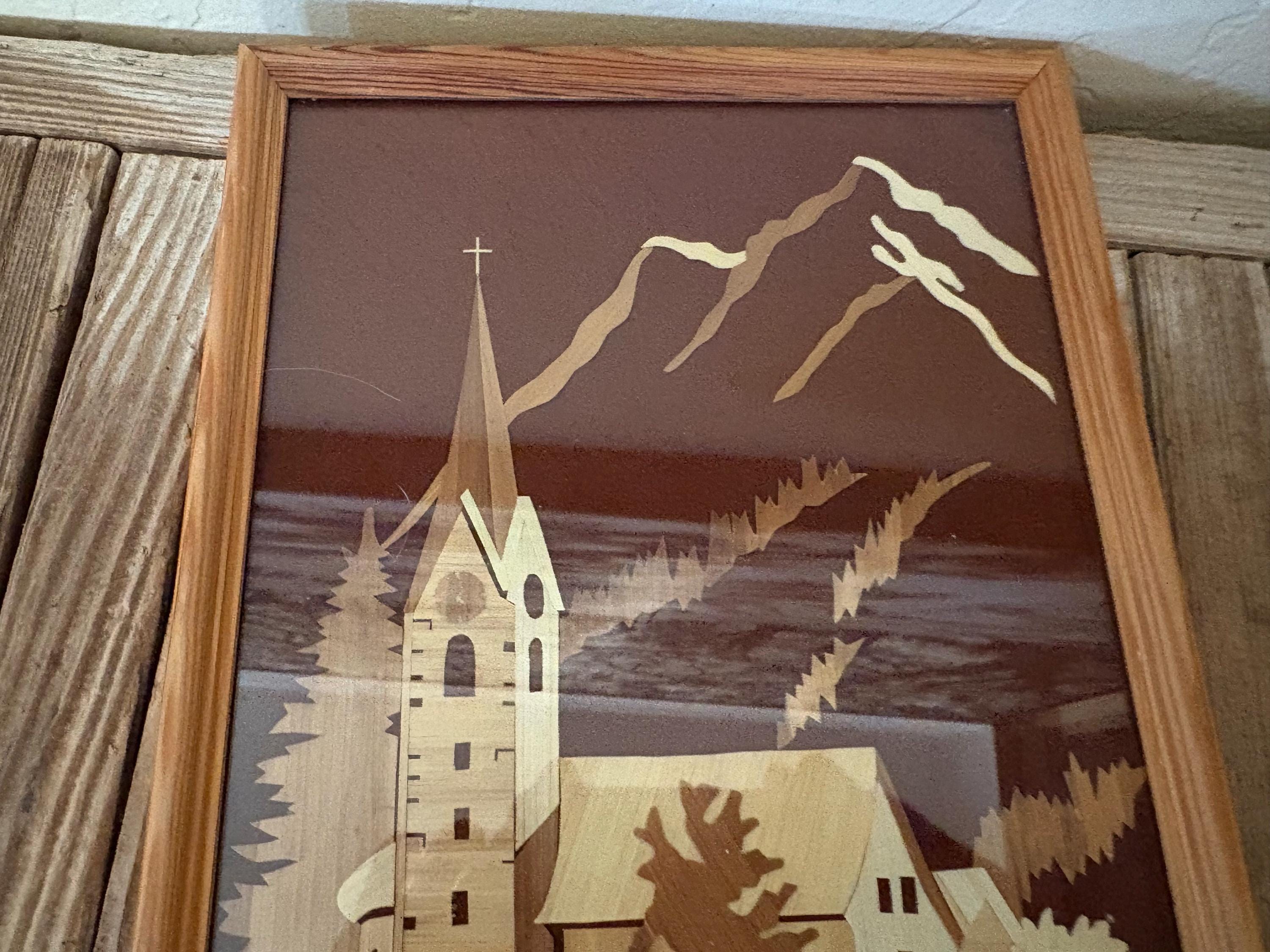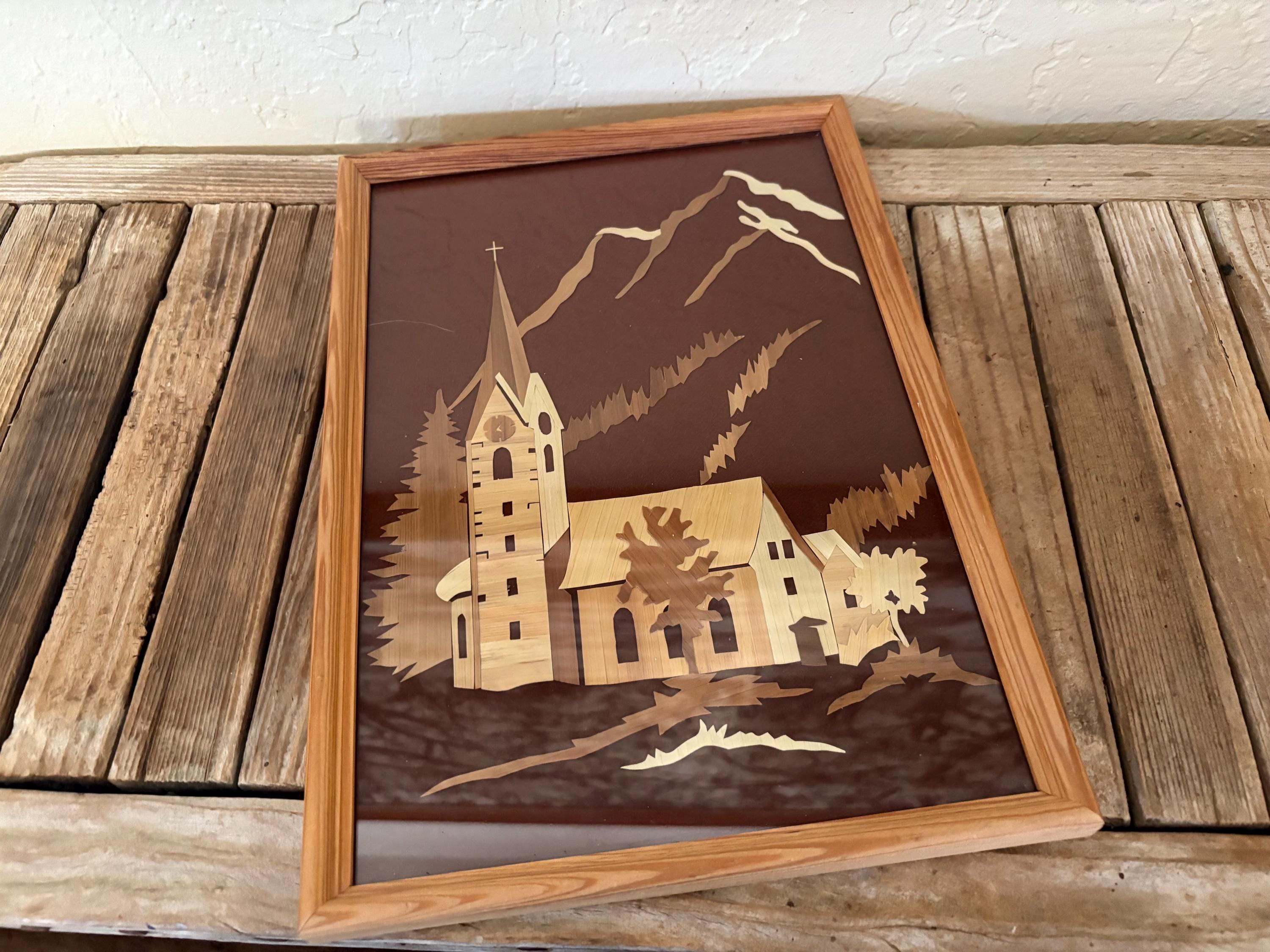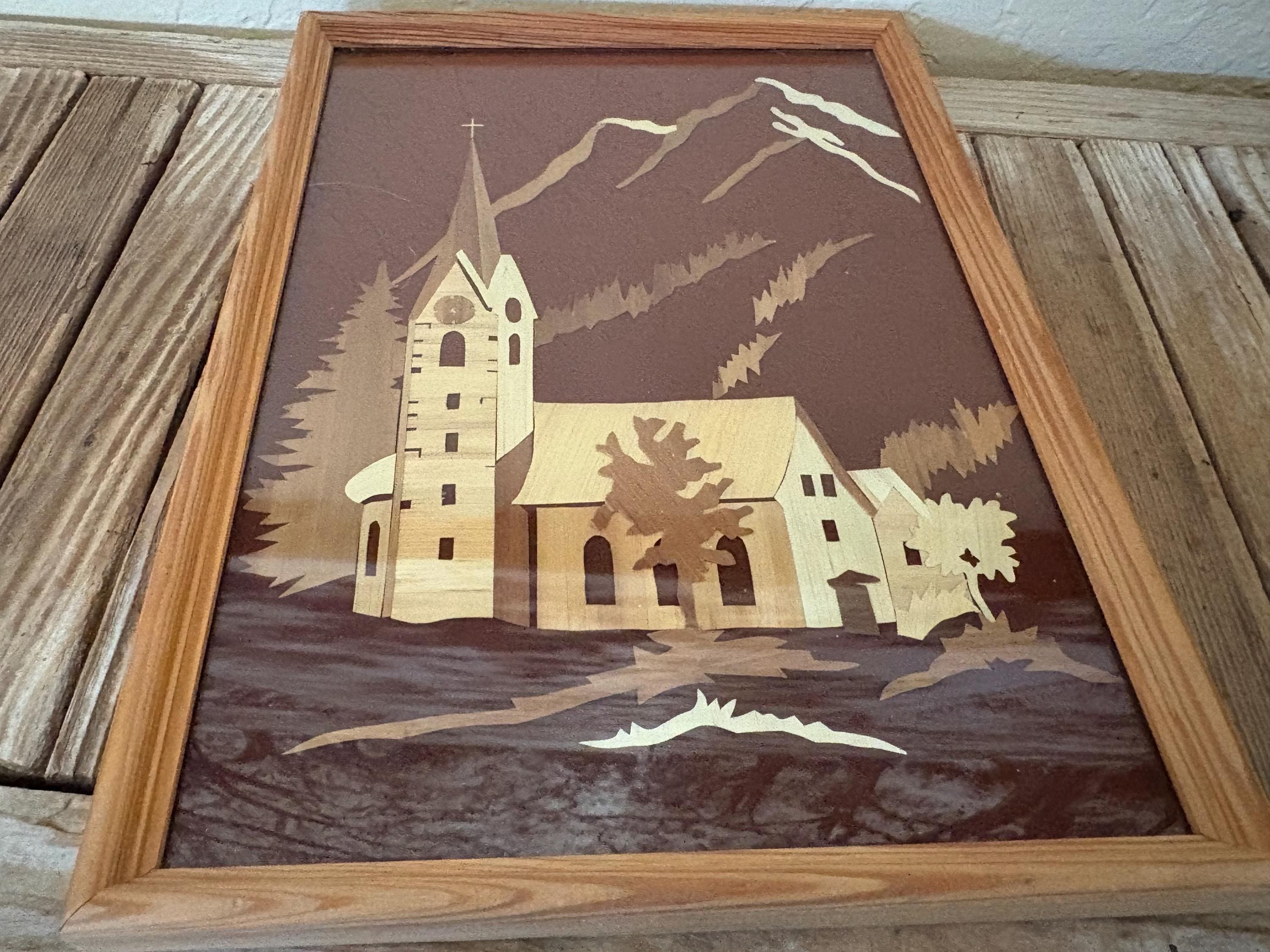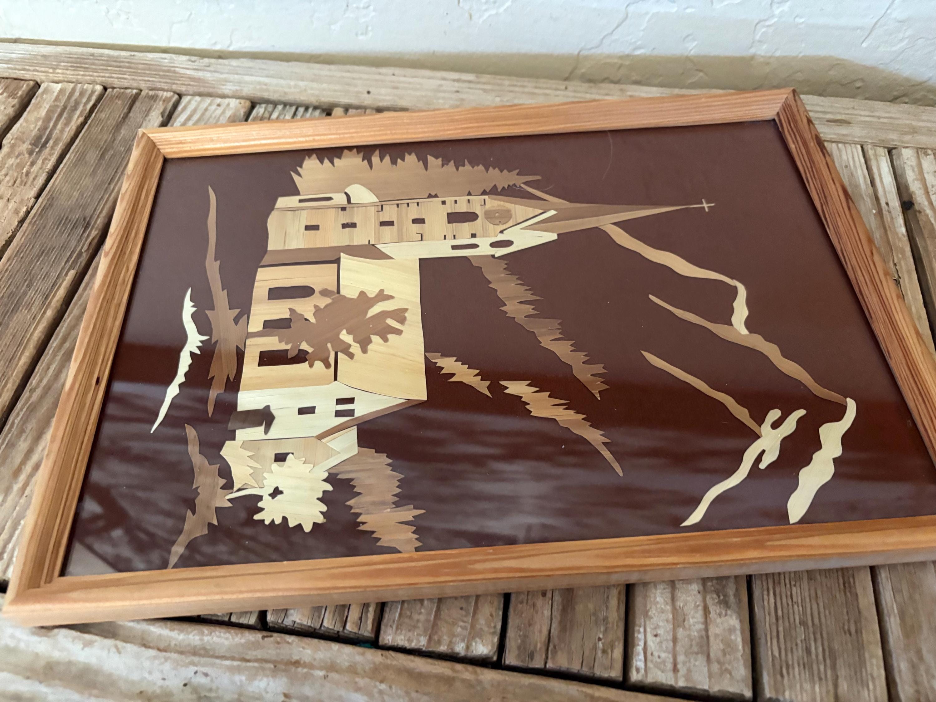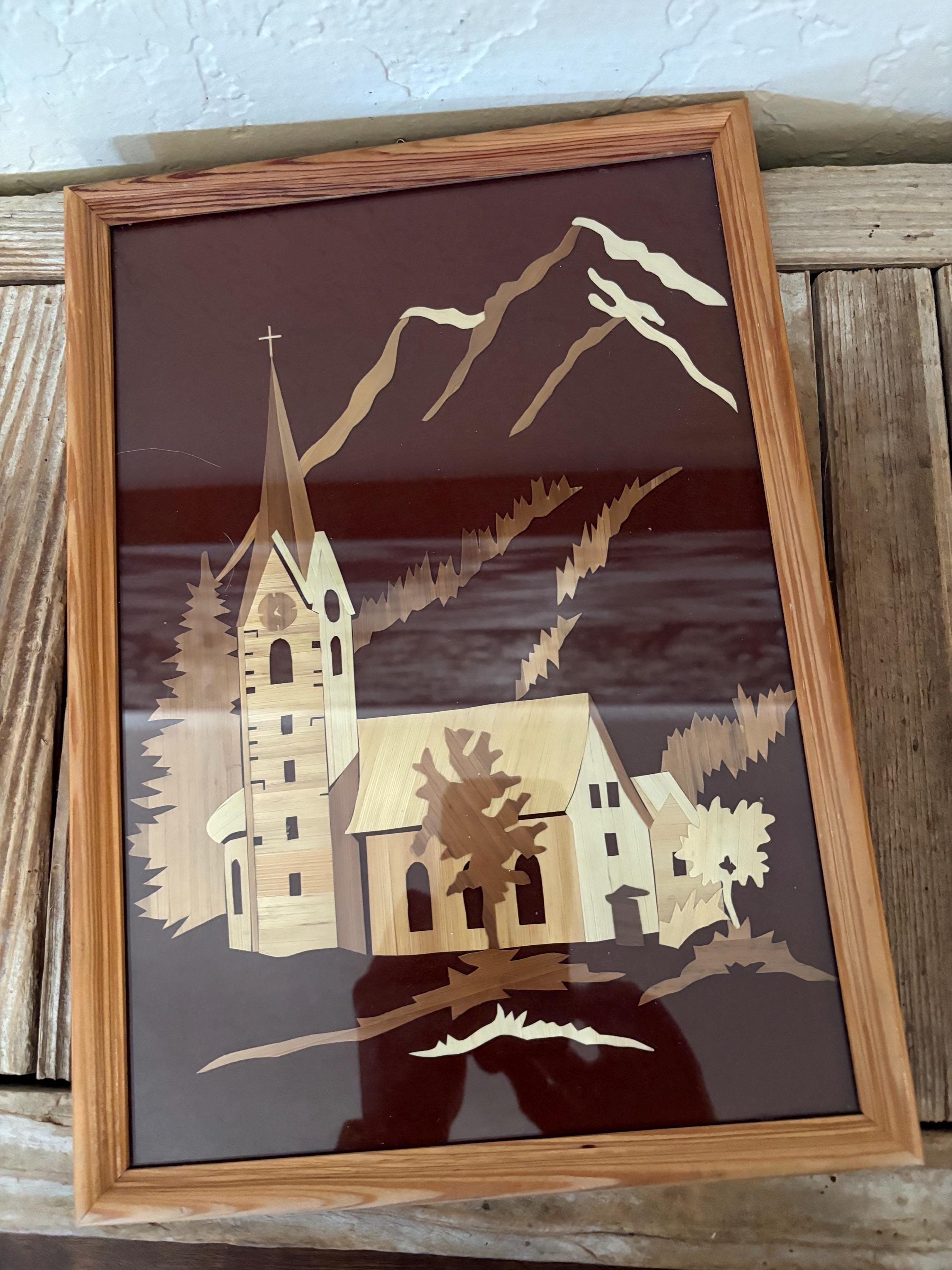 Vintage church print in wood frame. In great condition, normal wear due to age and use. The frame has some slight surface scrapes, near perfect, please see pictures. I believe that this handmade with some type of wood, looks like Balsa wood but not marked as such. A beautiful, unique piece to add to your home or give as a gift.