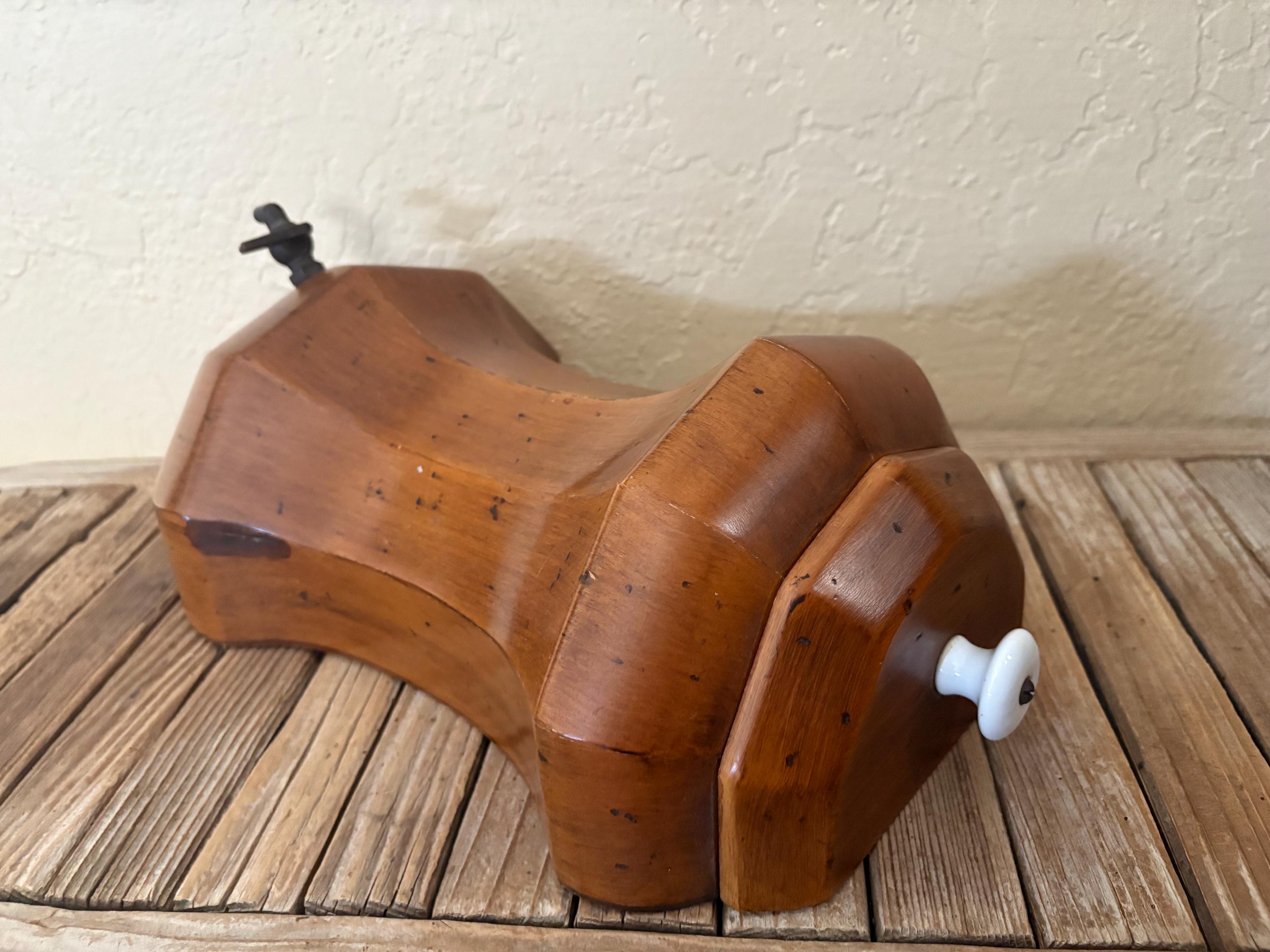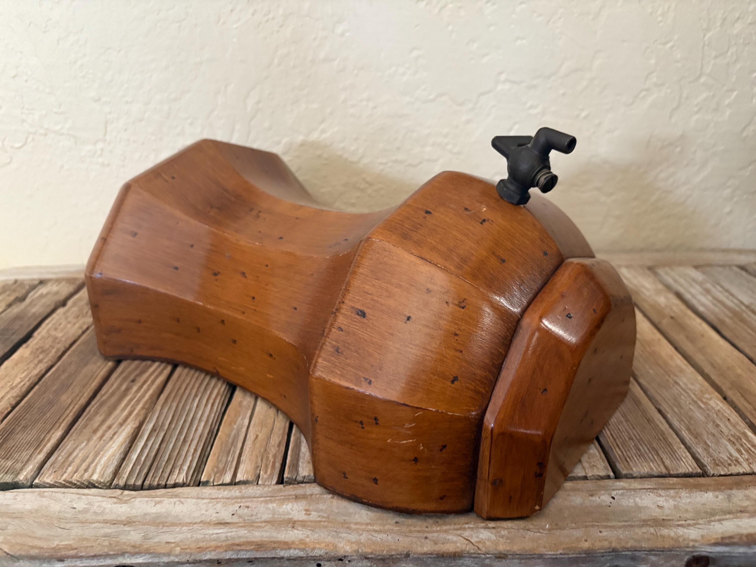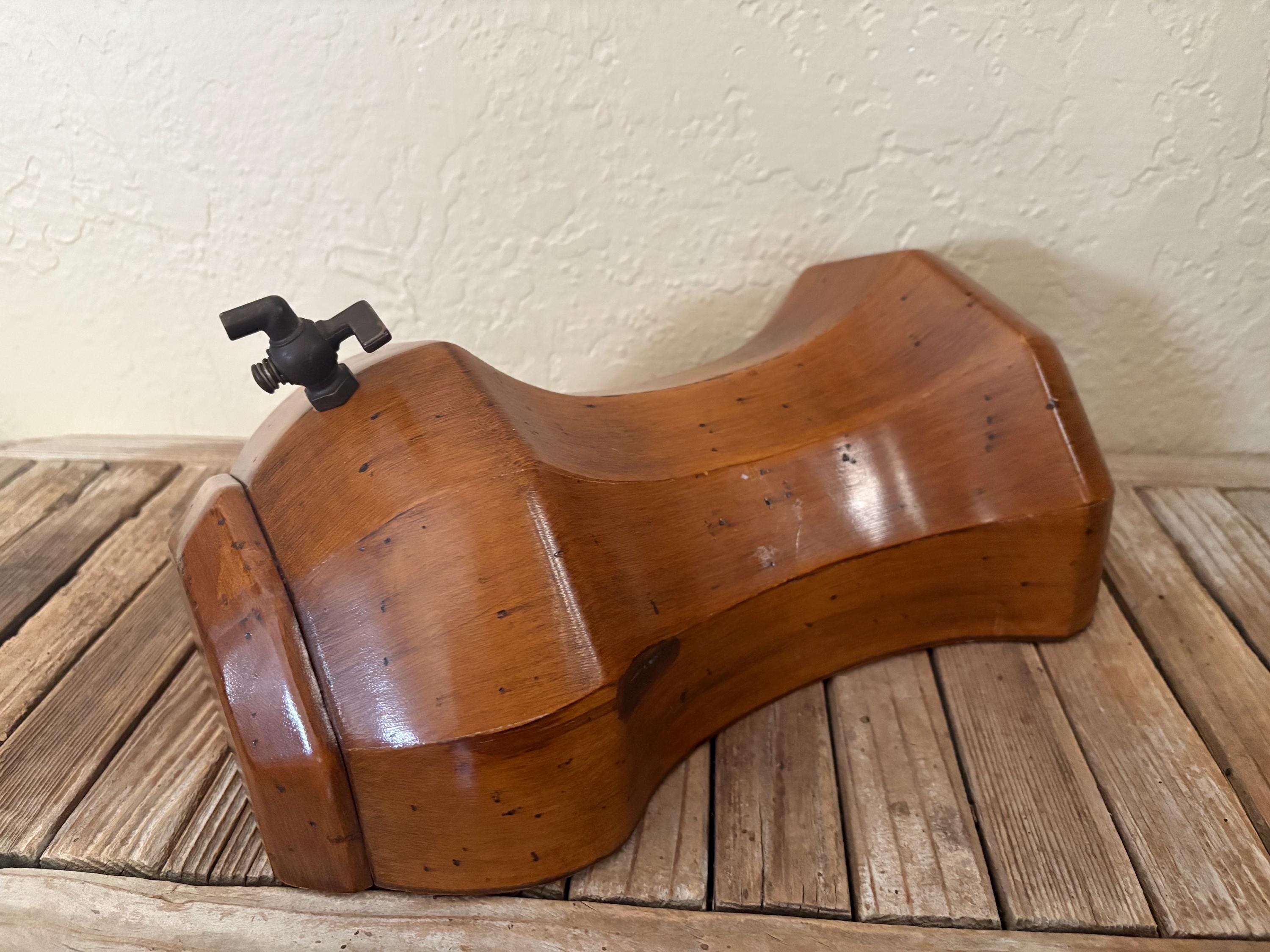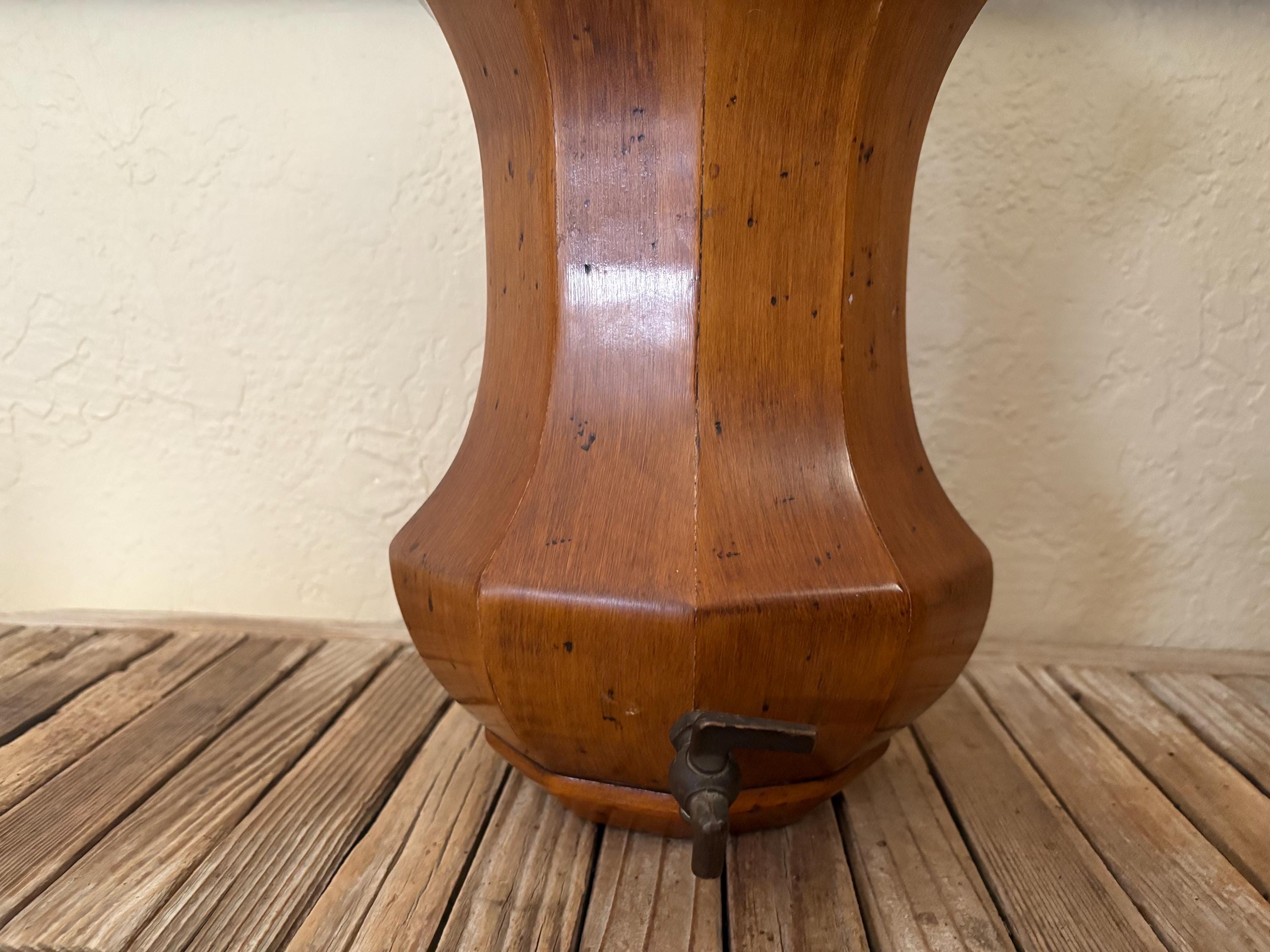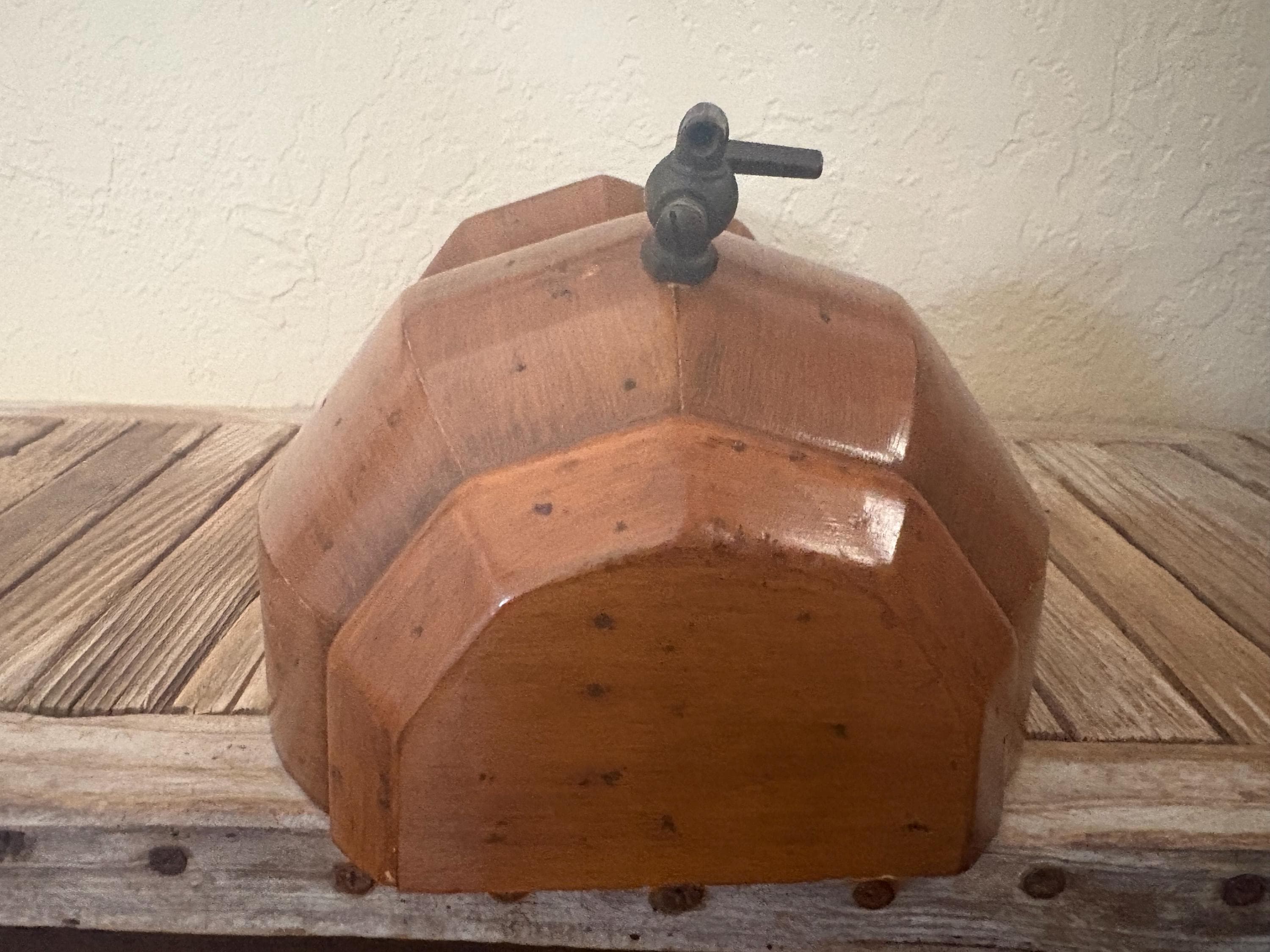 Vintage wood wall mounted faux dispenser. In good condition, normal wear due to age and use. There is some surface scrapes and markings to the wood, please see pictures. The spout shows some discolorations and markings,this is not functional and mostly for decorative purposes. A unique piece to add to your kitchen.