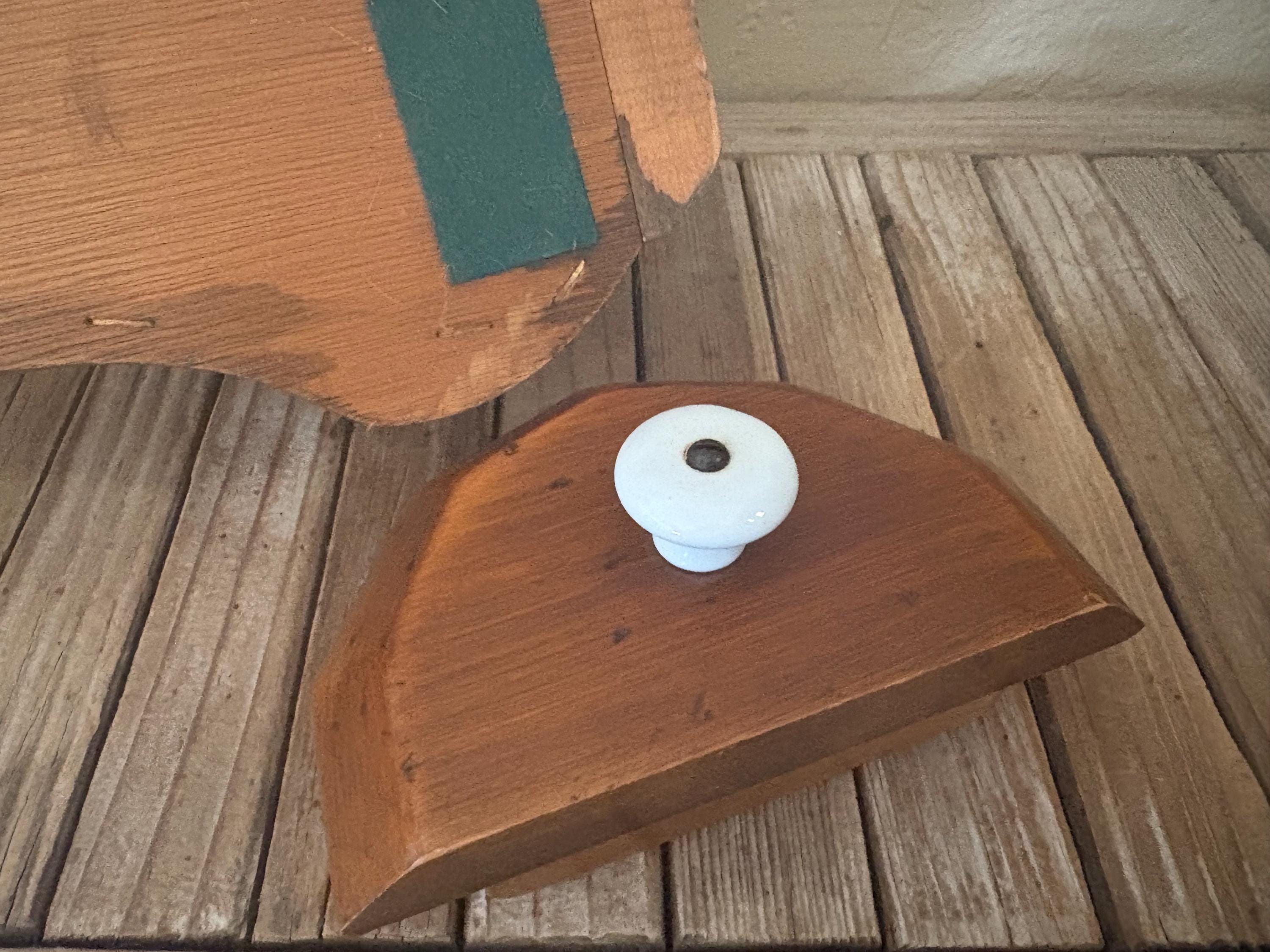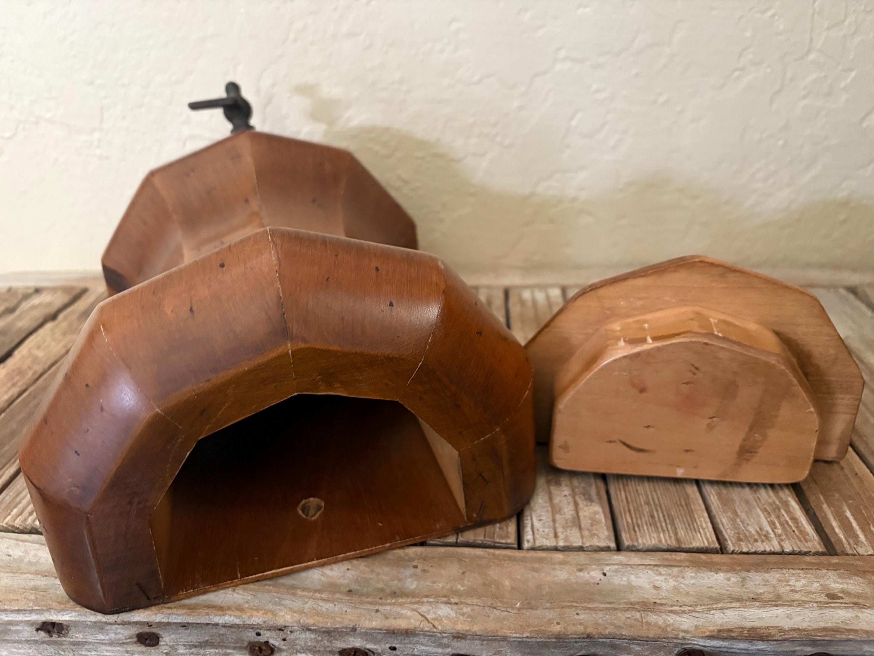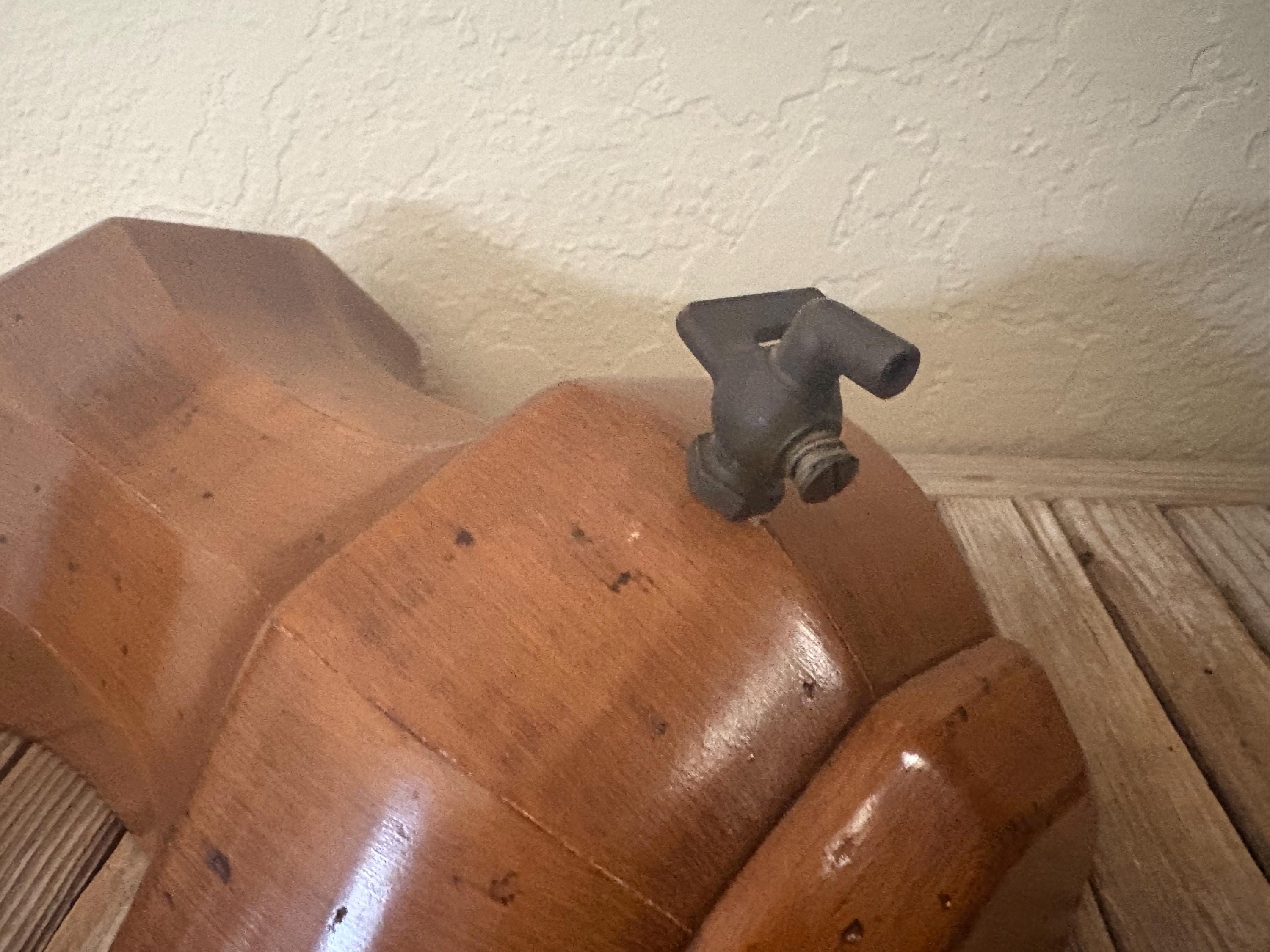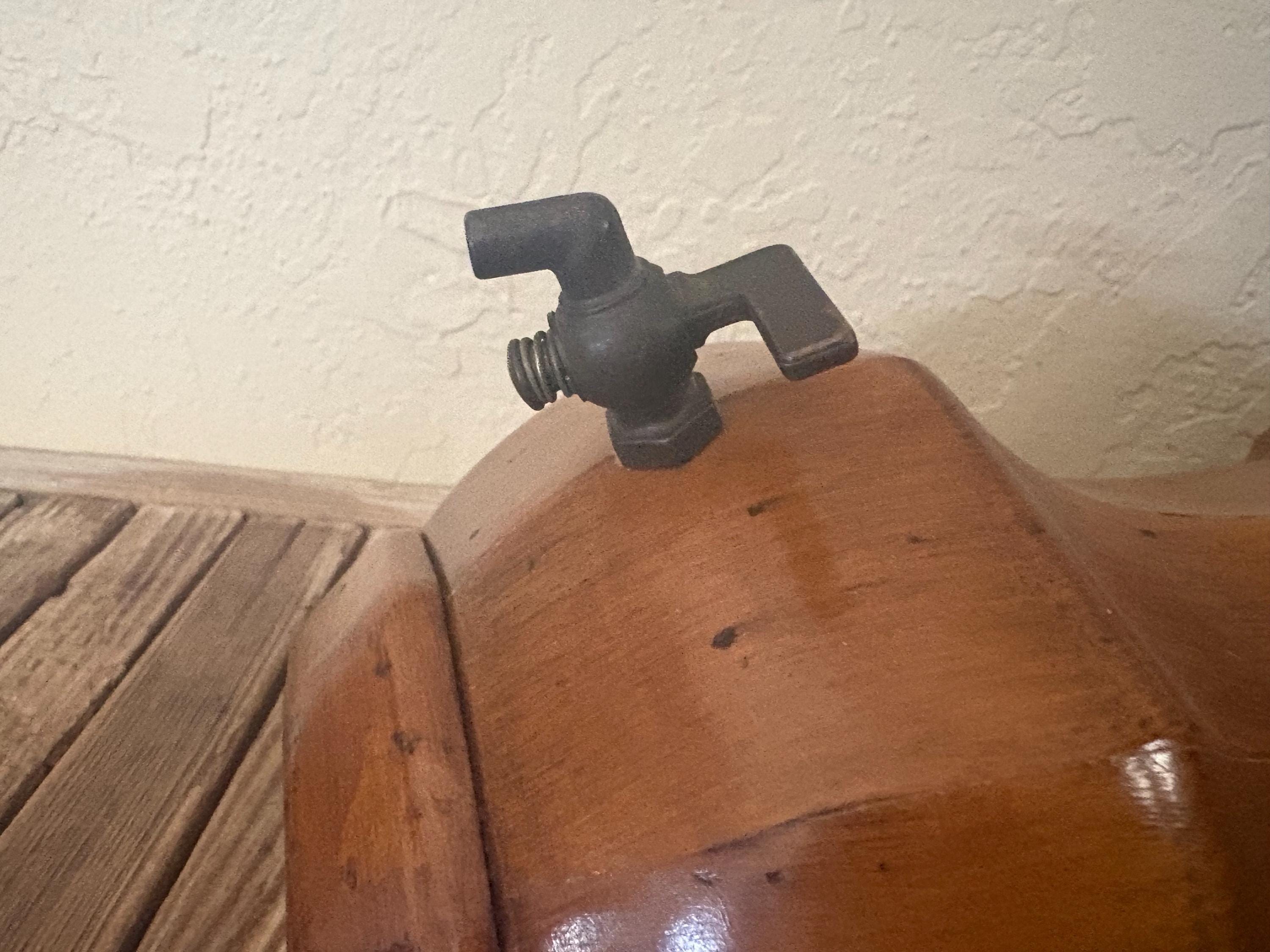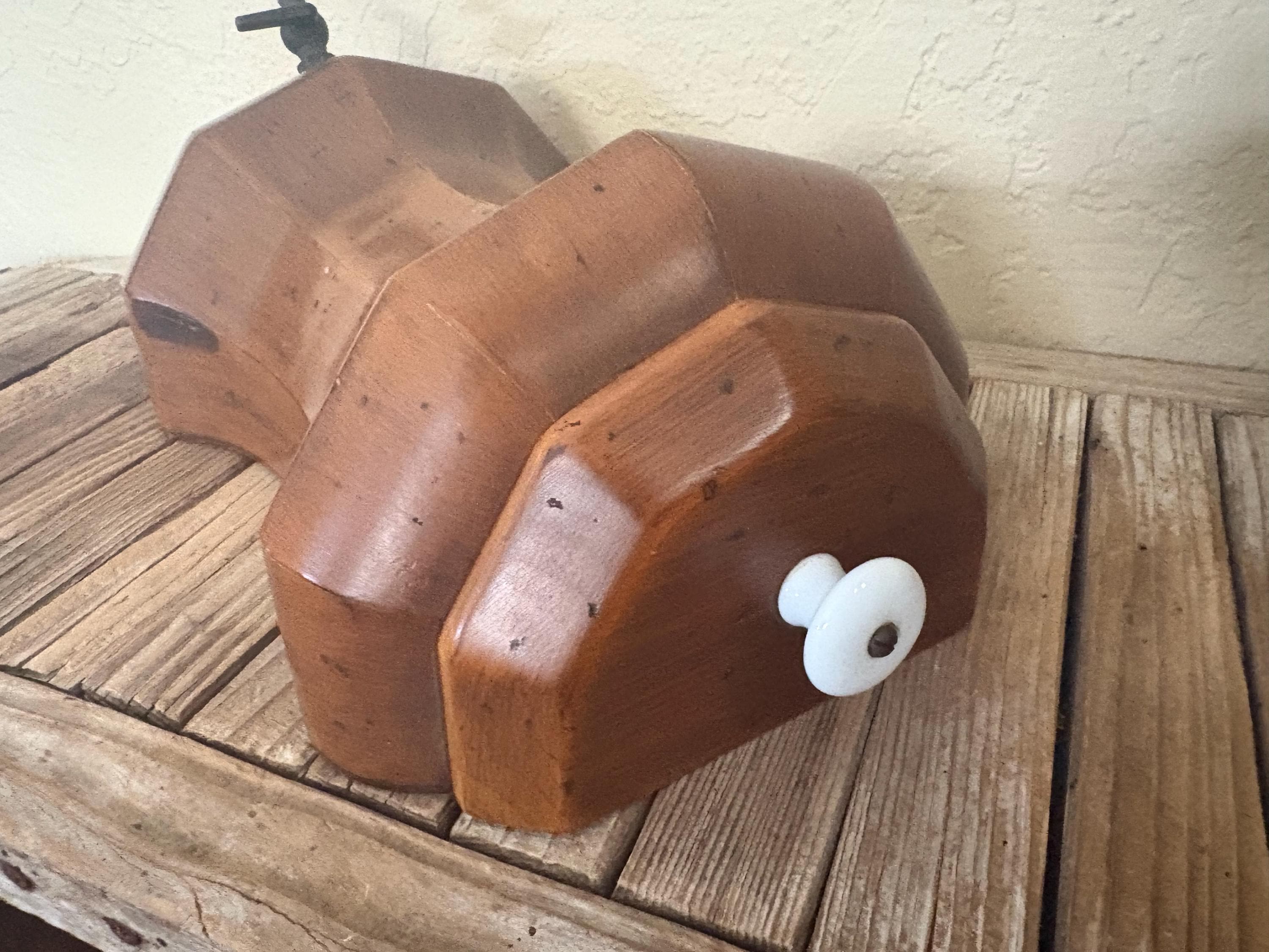 Vintage wood wall mounted faux dispenser. In good condition, normal wear due to age and use. There is some surface scrapes and markings to the wood, please see pictures. The spout shows some discolorations and markings,this is not functional and mostly for decorative purposes. A unique piece to add to your kitchen.