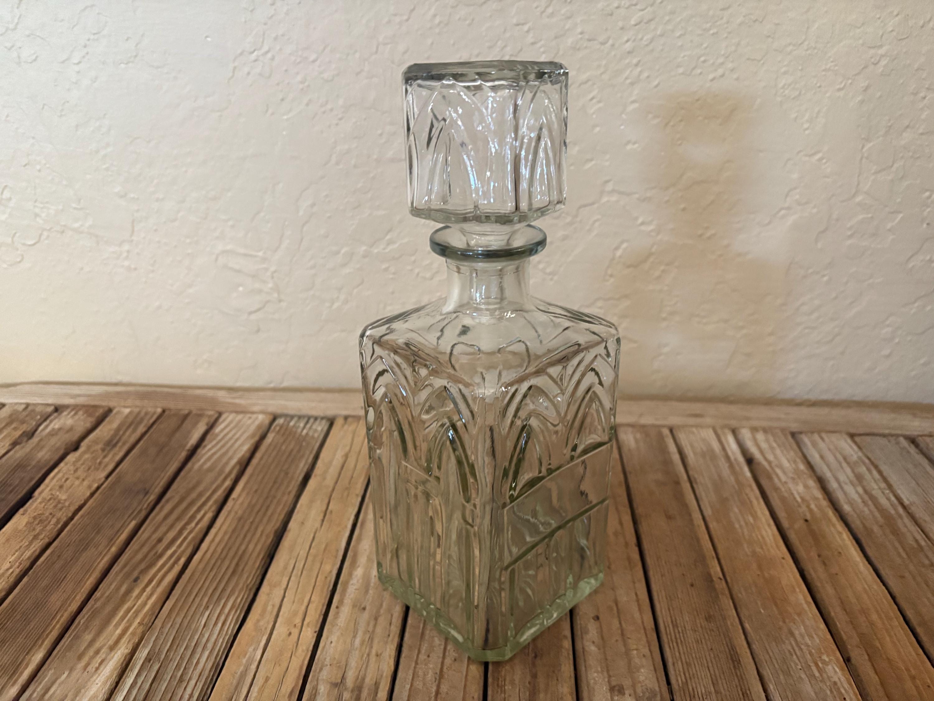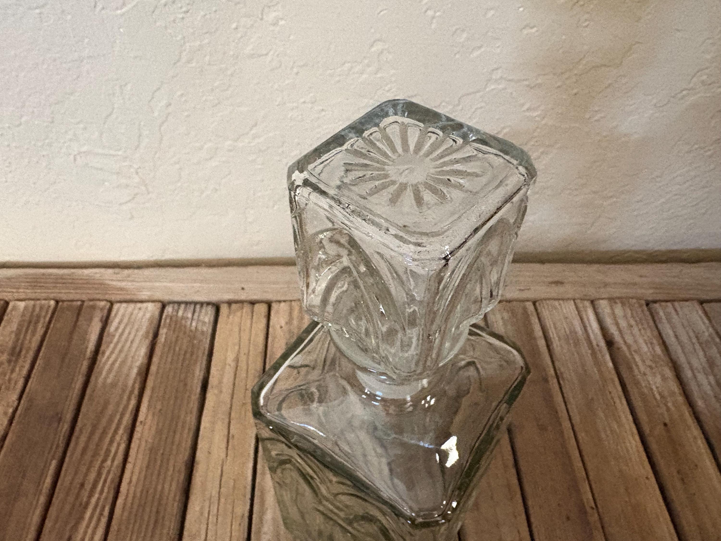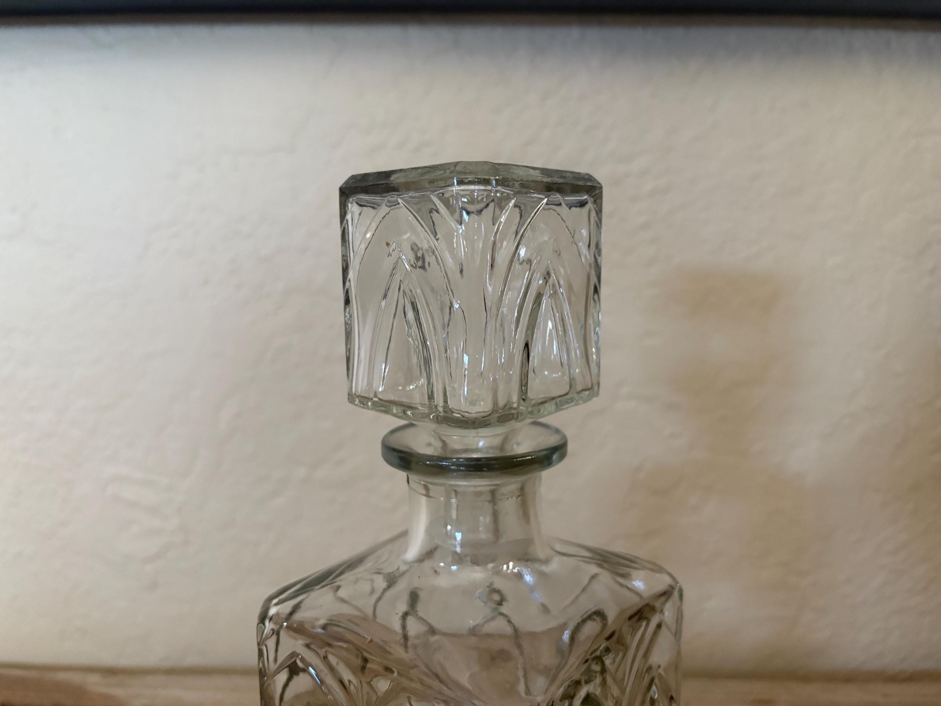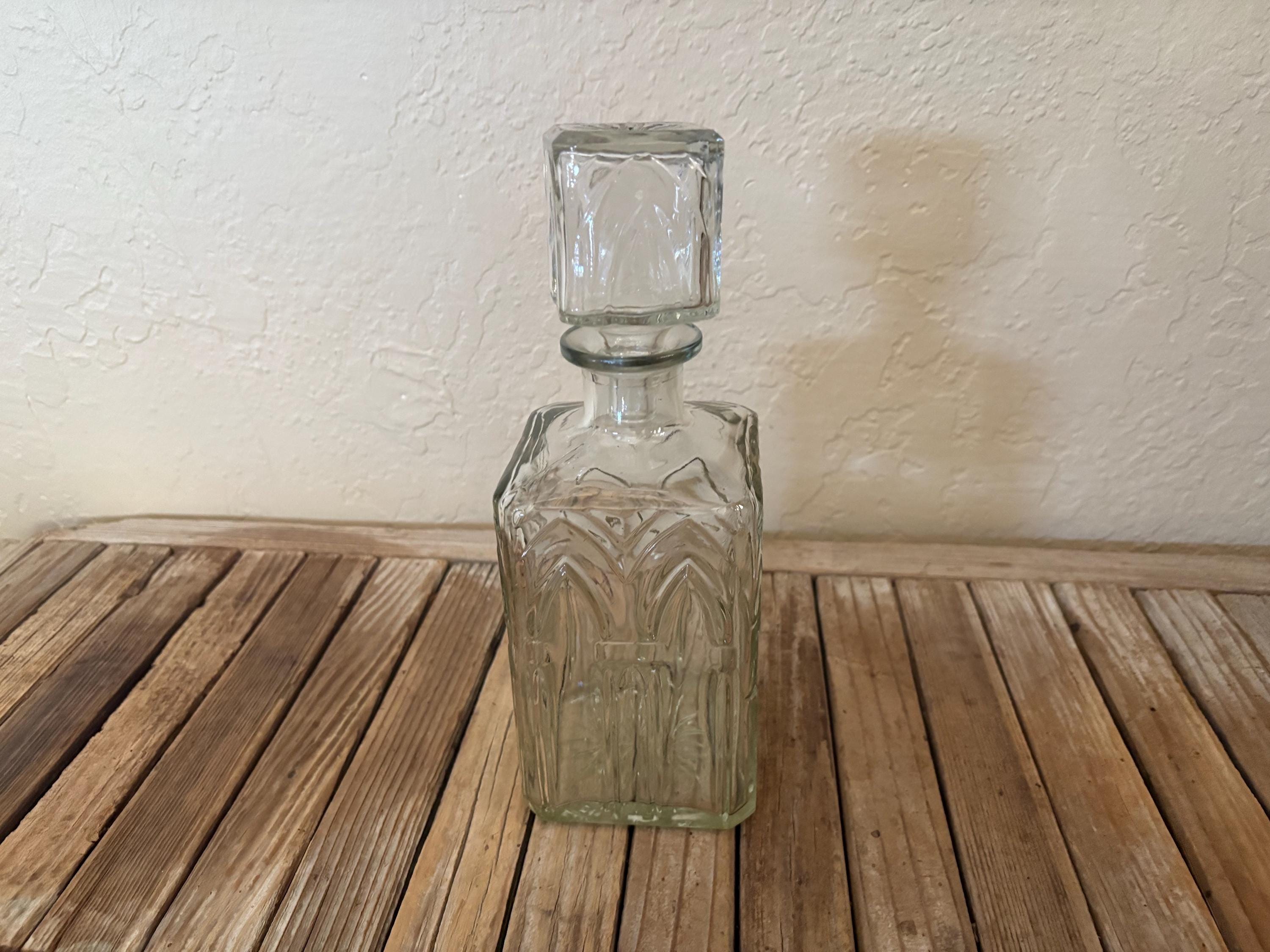 Vintage glass liquor bottle decanter. In great condition, normal wear due to age and use. The inside of the bottle has residual film and markings to it, the plastic stopper is a bit bent, please see pictures. A beautiful piece to add to your bar and home.