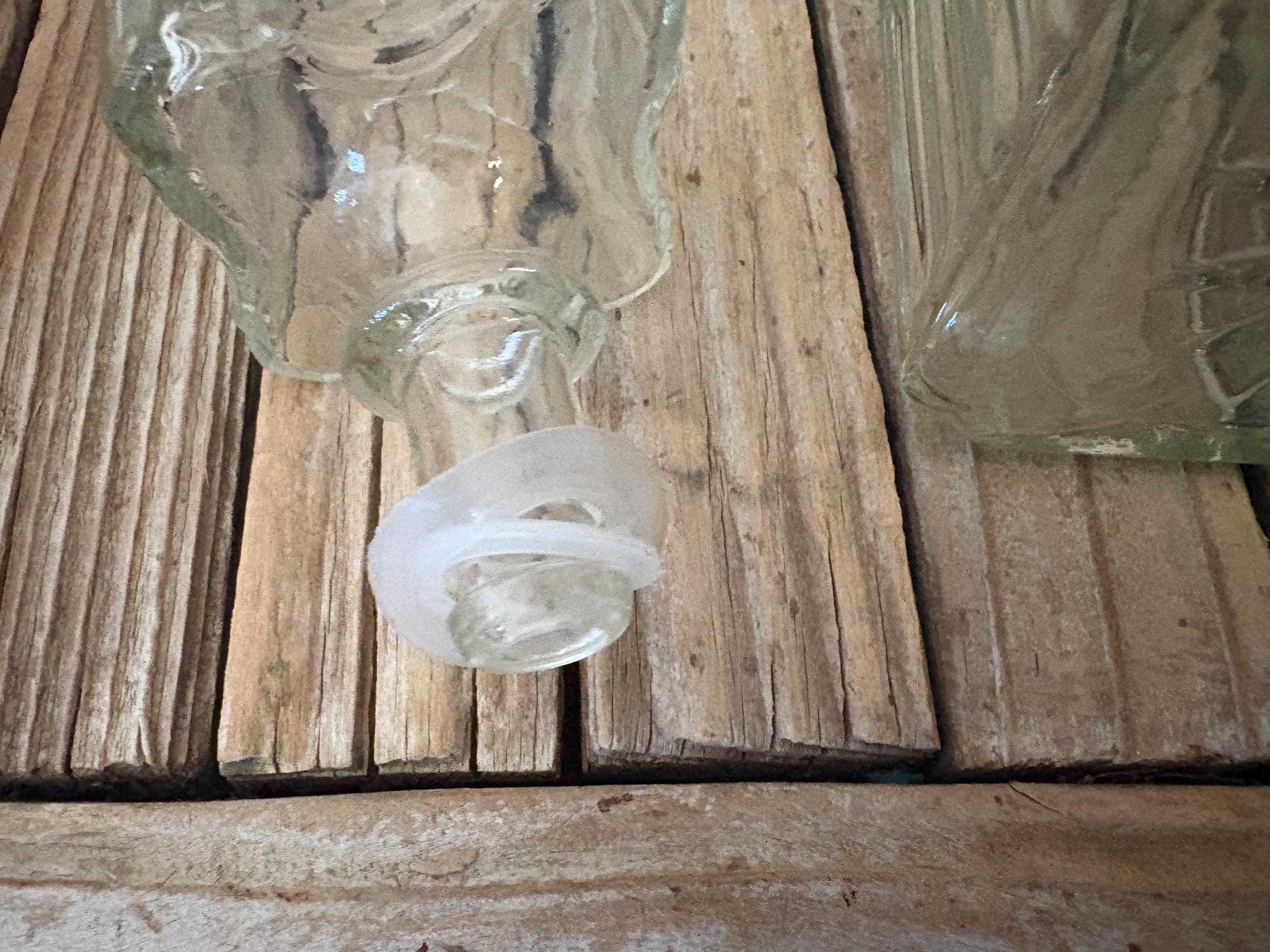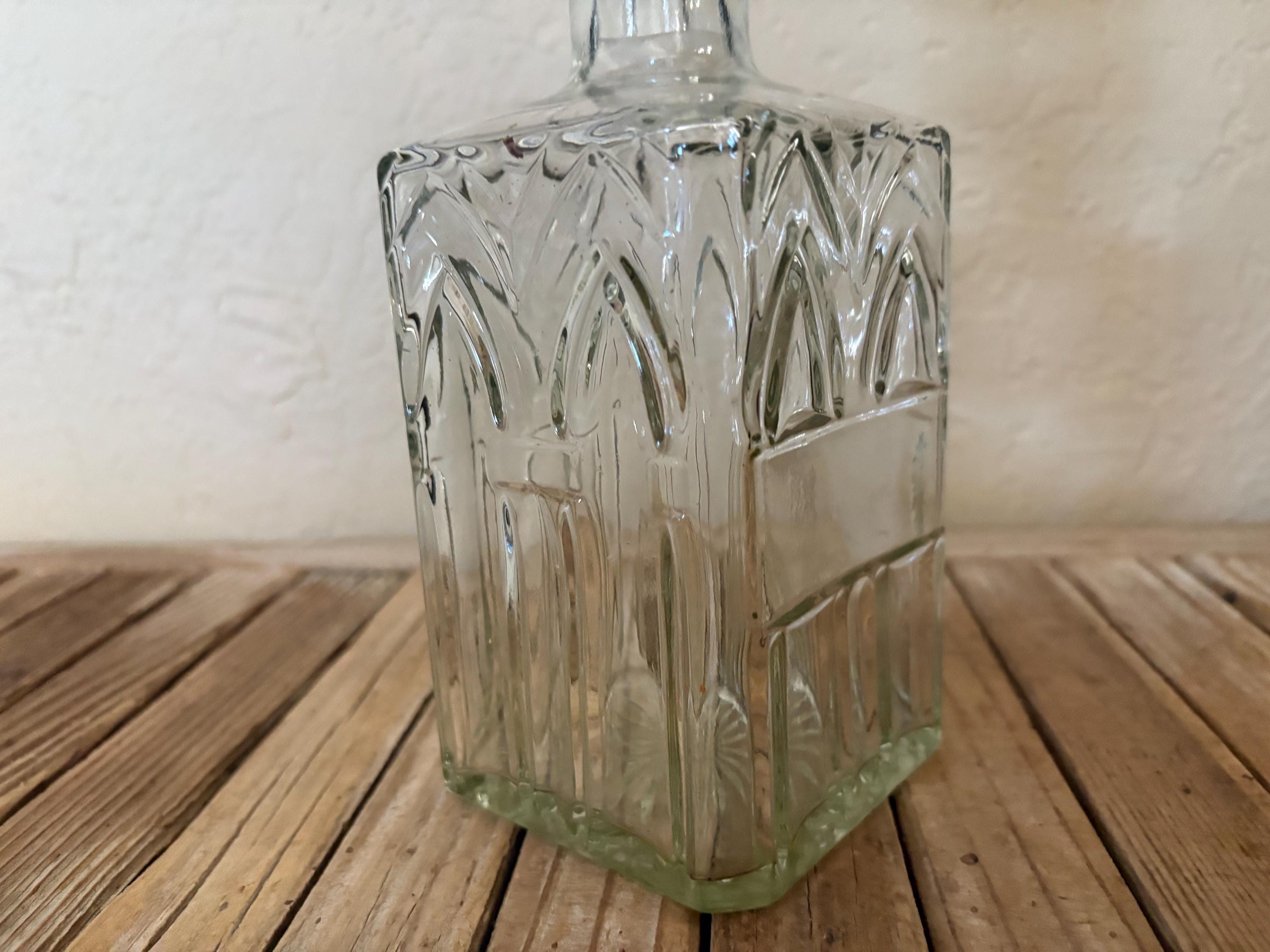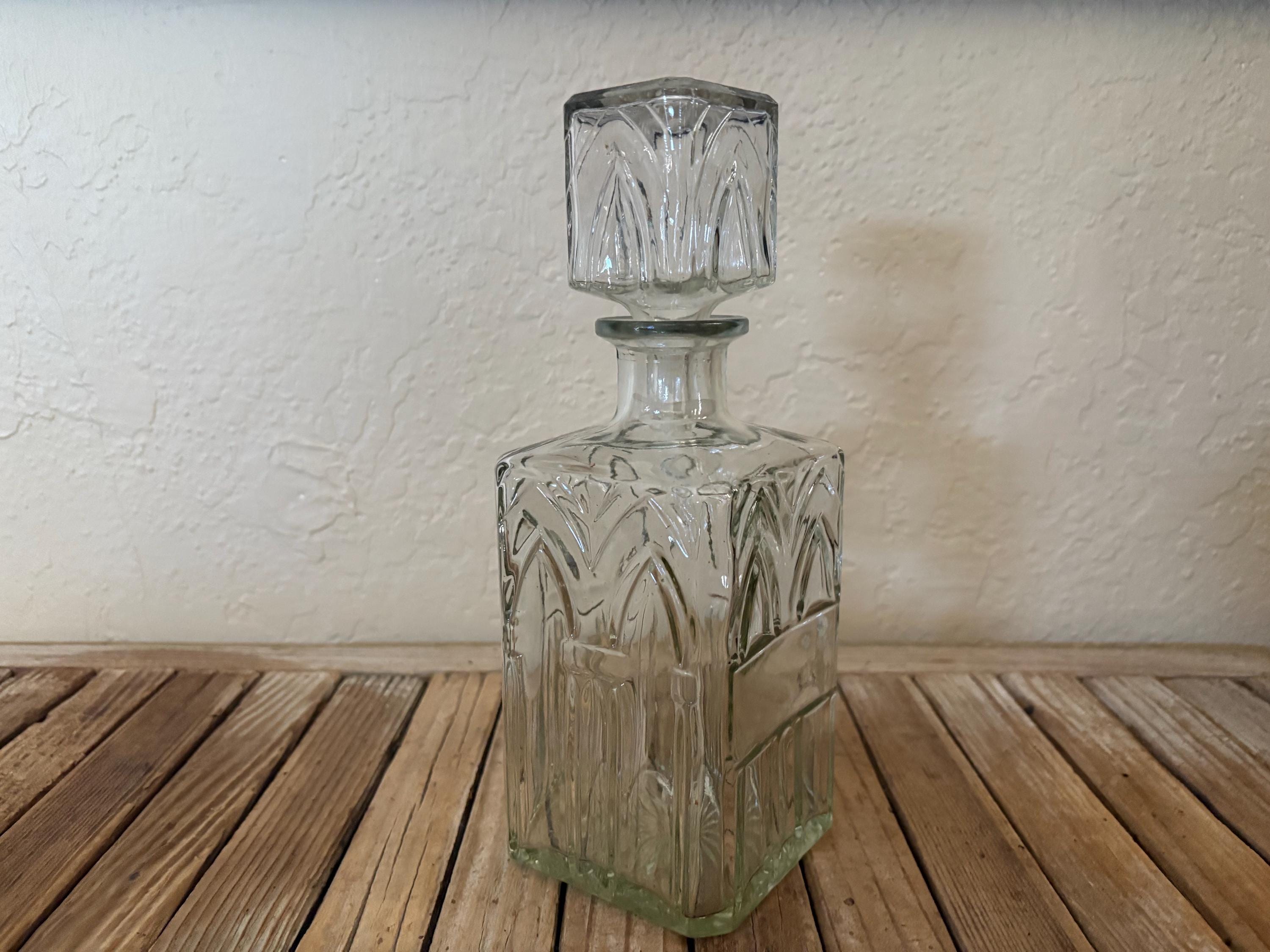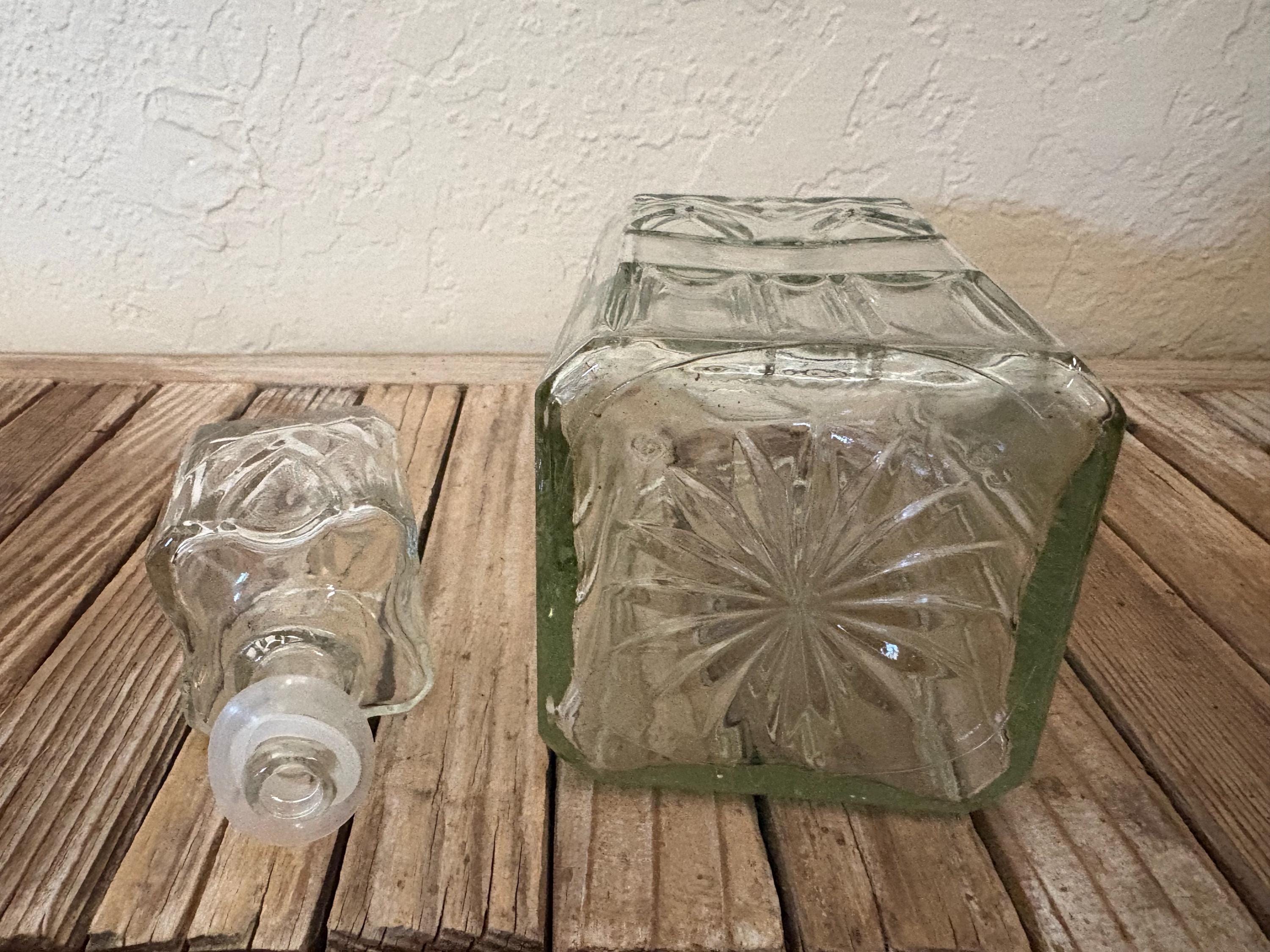 Vintage glass liquor bottle decanter. In great condition, normal wear due to age and use. The inside of the bottle has residual film and markings to it, the plastic stopper is a bit bent, please see pictures. A beautiful piece to add to your bar and home.