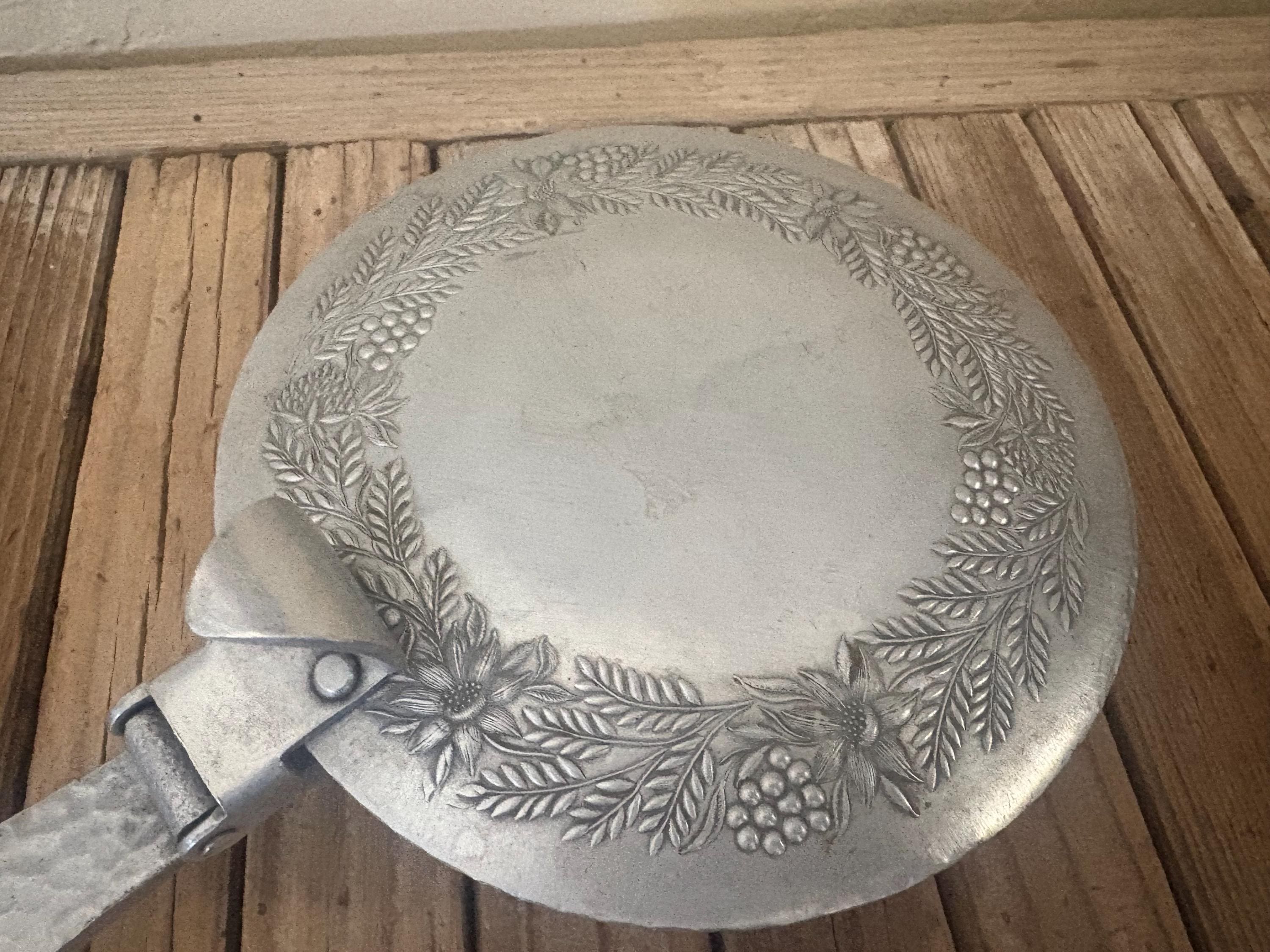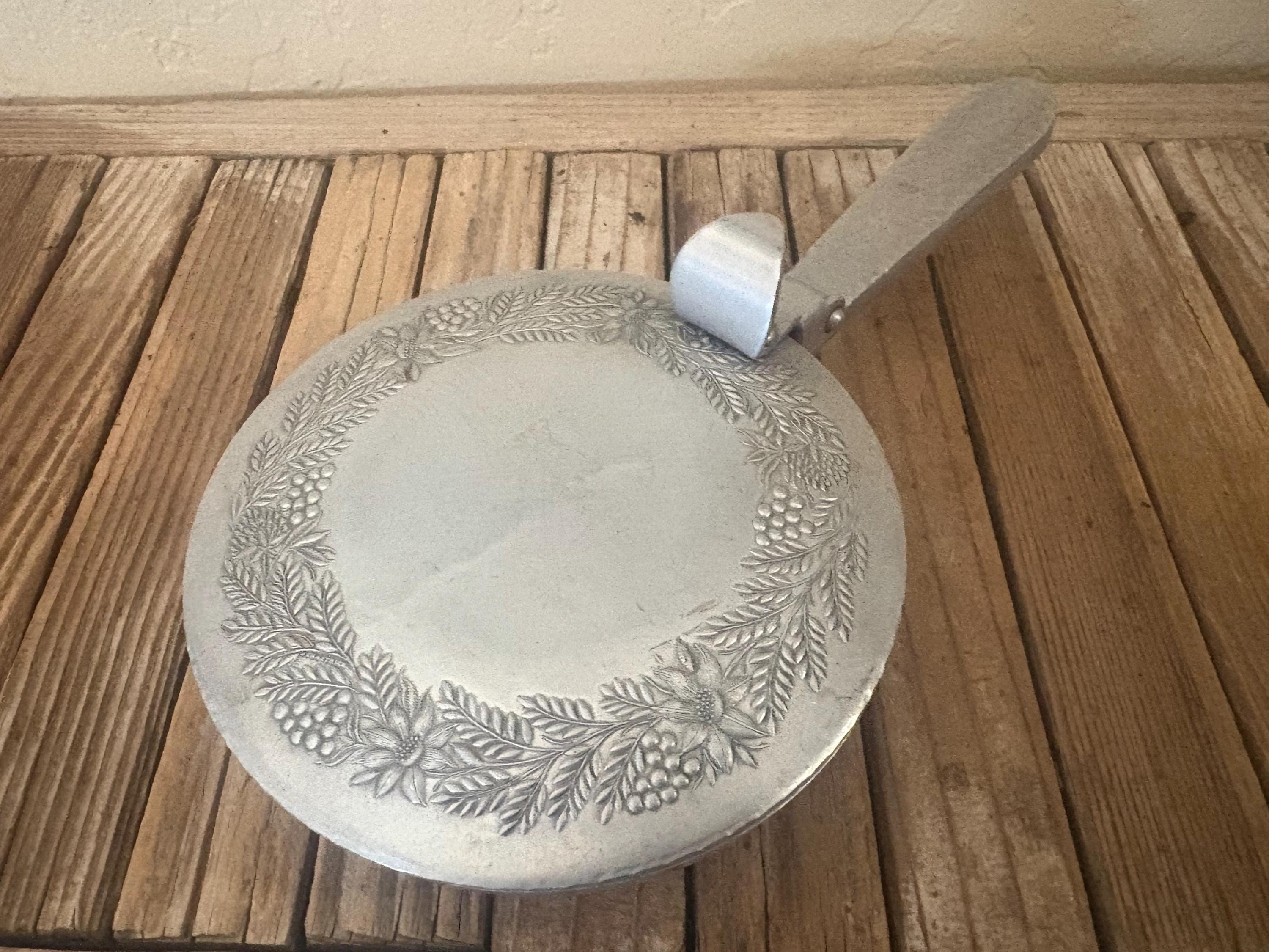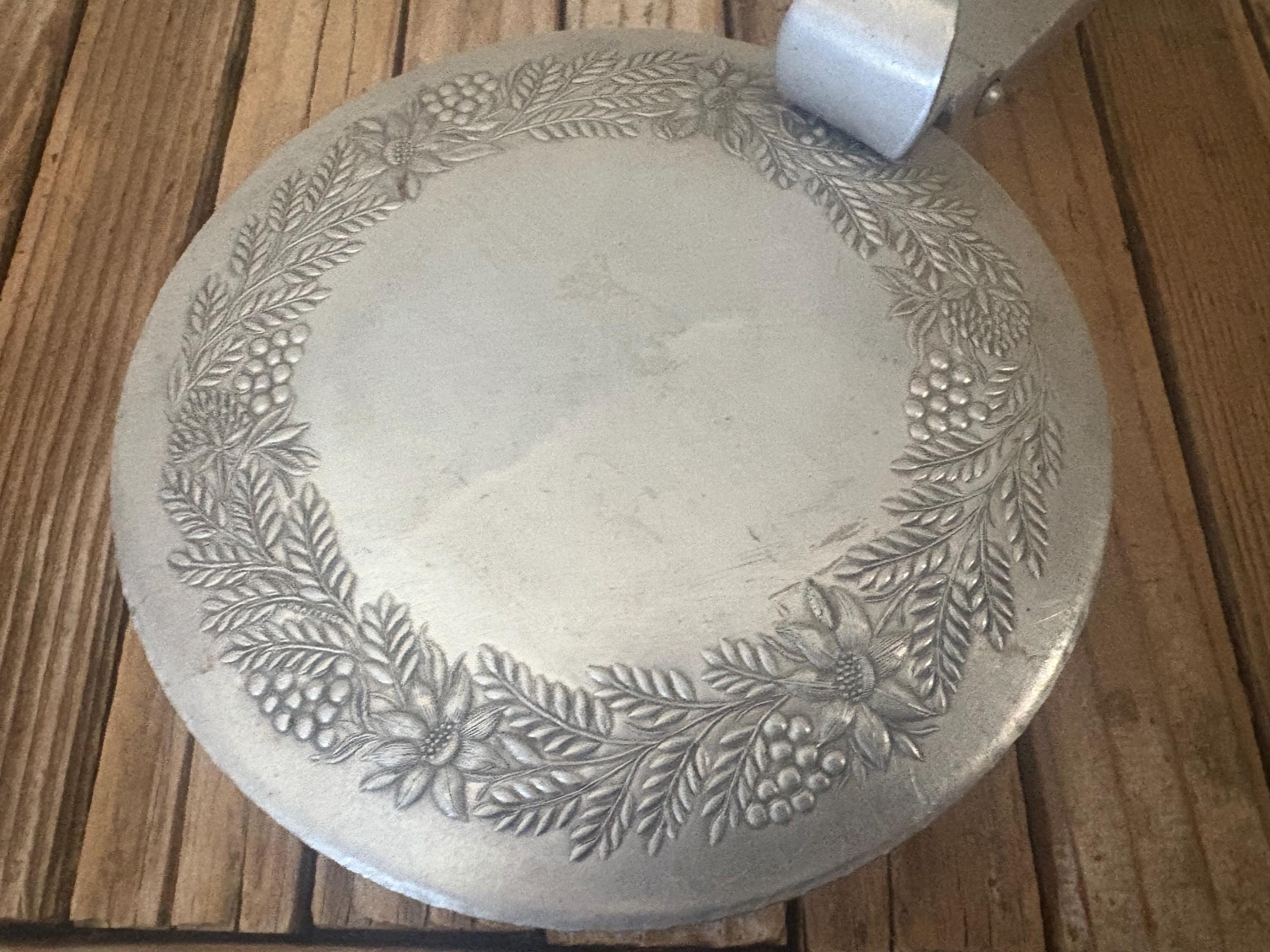 Vintage metal floral butler crumb catcher. The piece has surface scrapes and markings to it, please see pictures. I believe this is aluminum, however it is not marked. A beautiful piece to add to any collection or for everyday use.