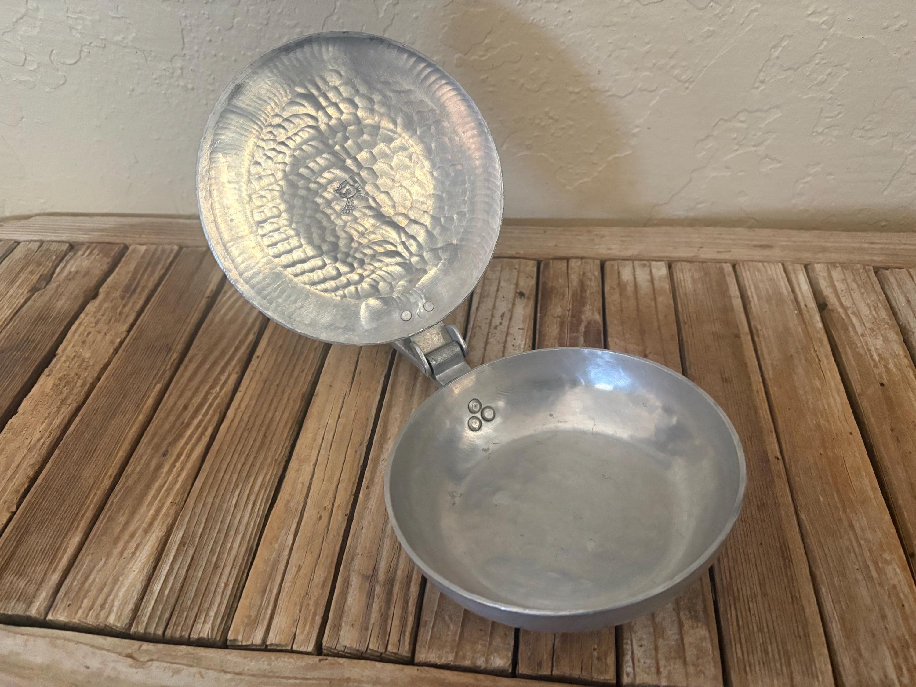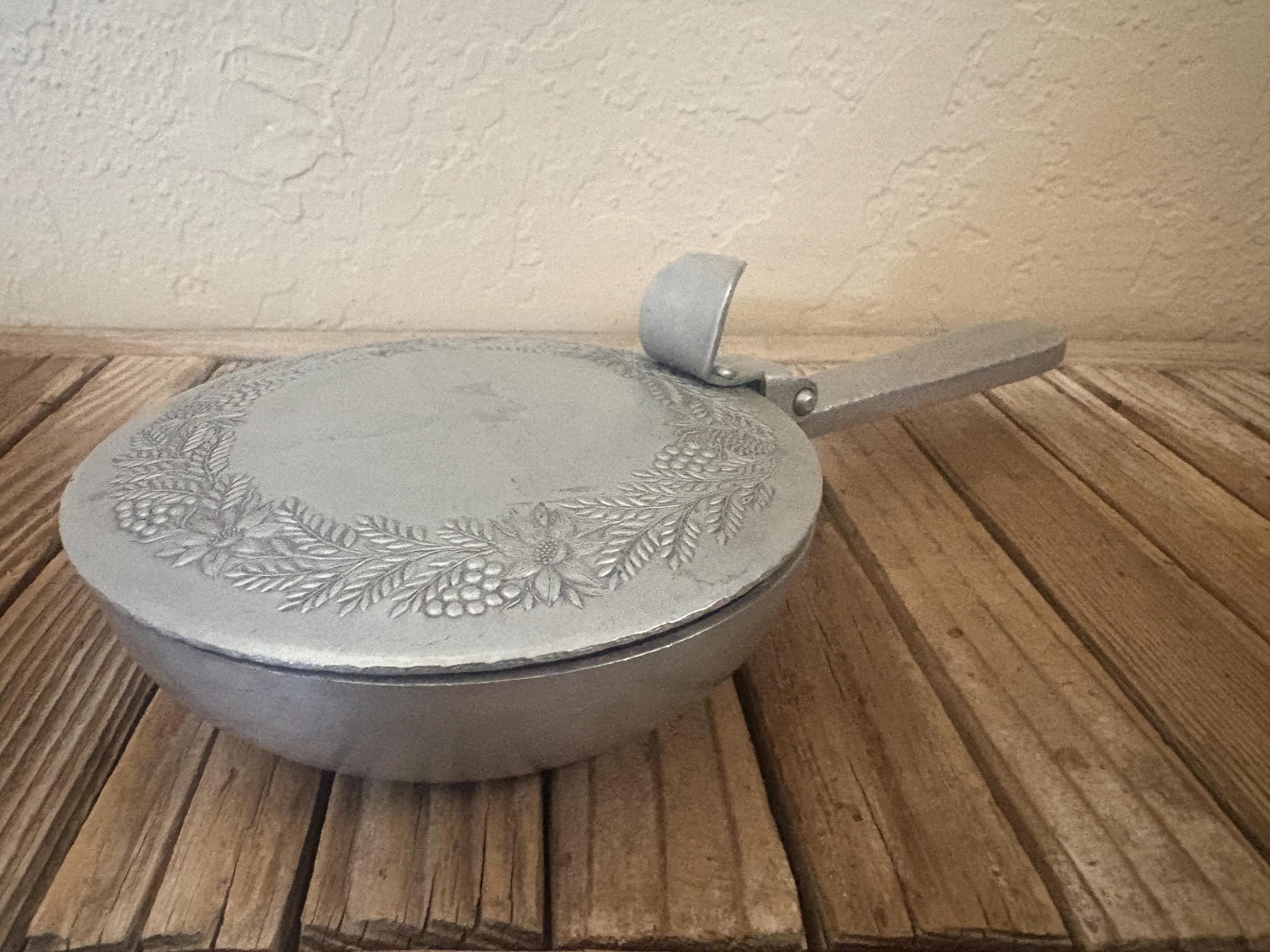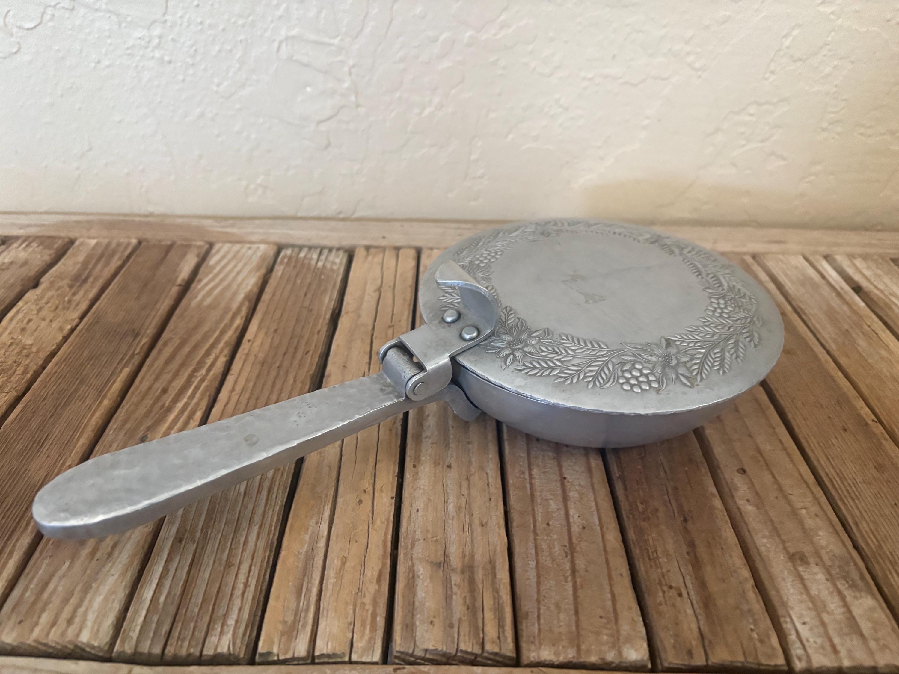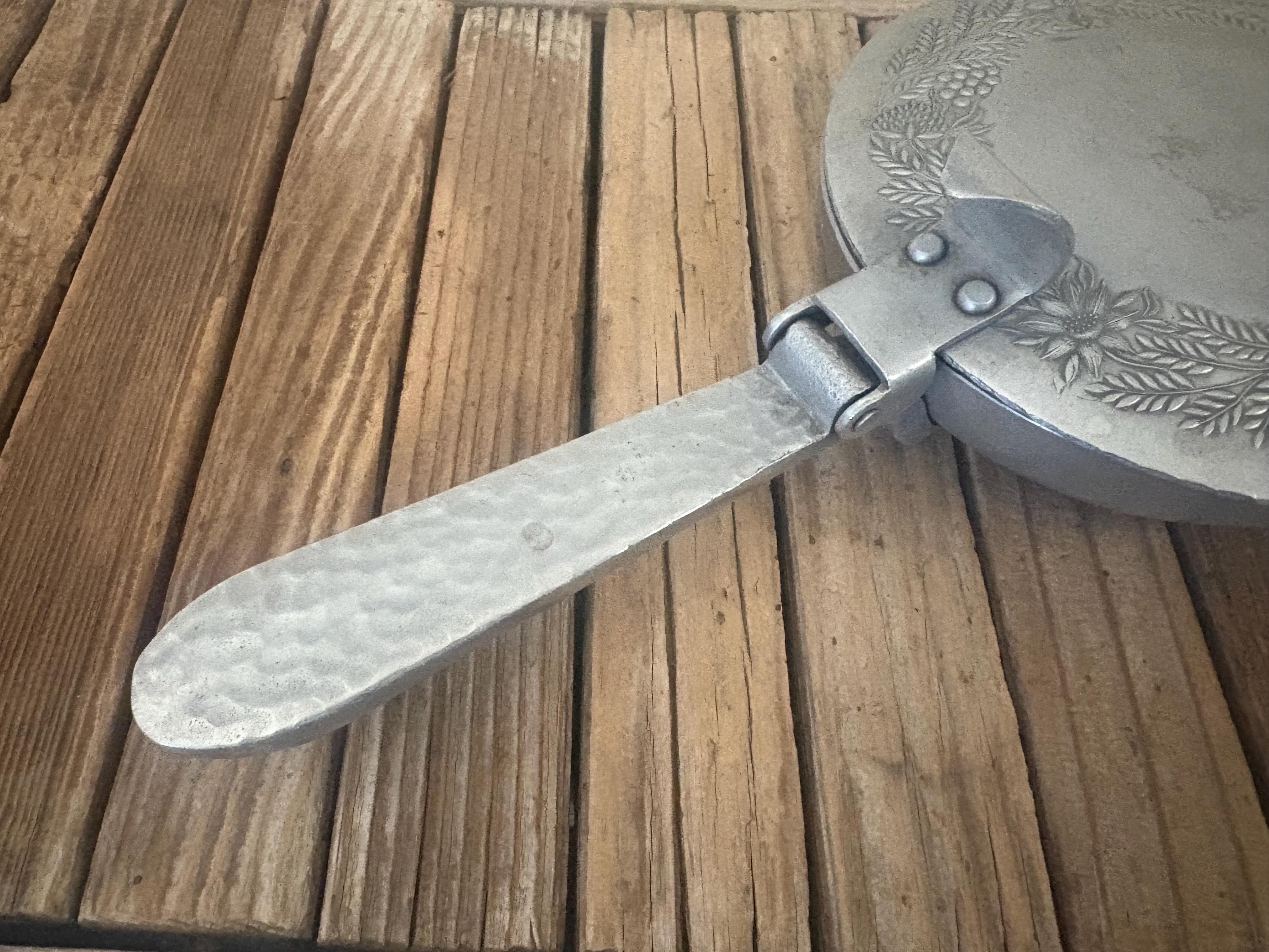Vintage metal floral butler crumb catcher. The piece has surface scrapes and markings to it, please see pictures. I believe this is aluminum, however it is not marked. A beautiful piece to add to any collection or for everyday use.