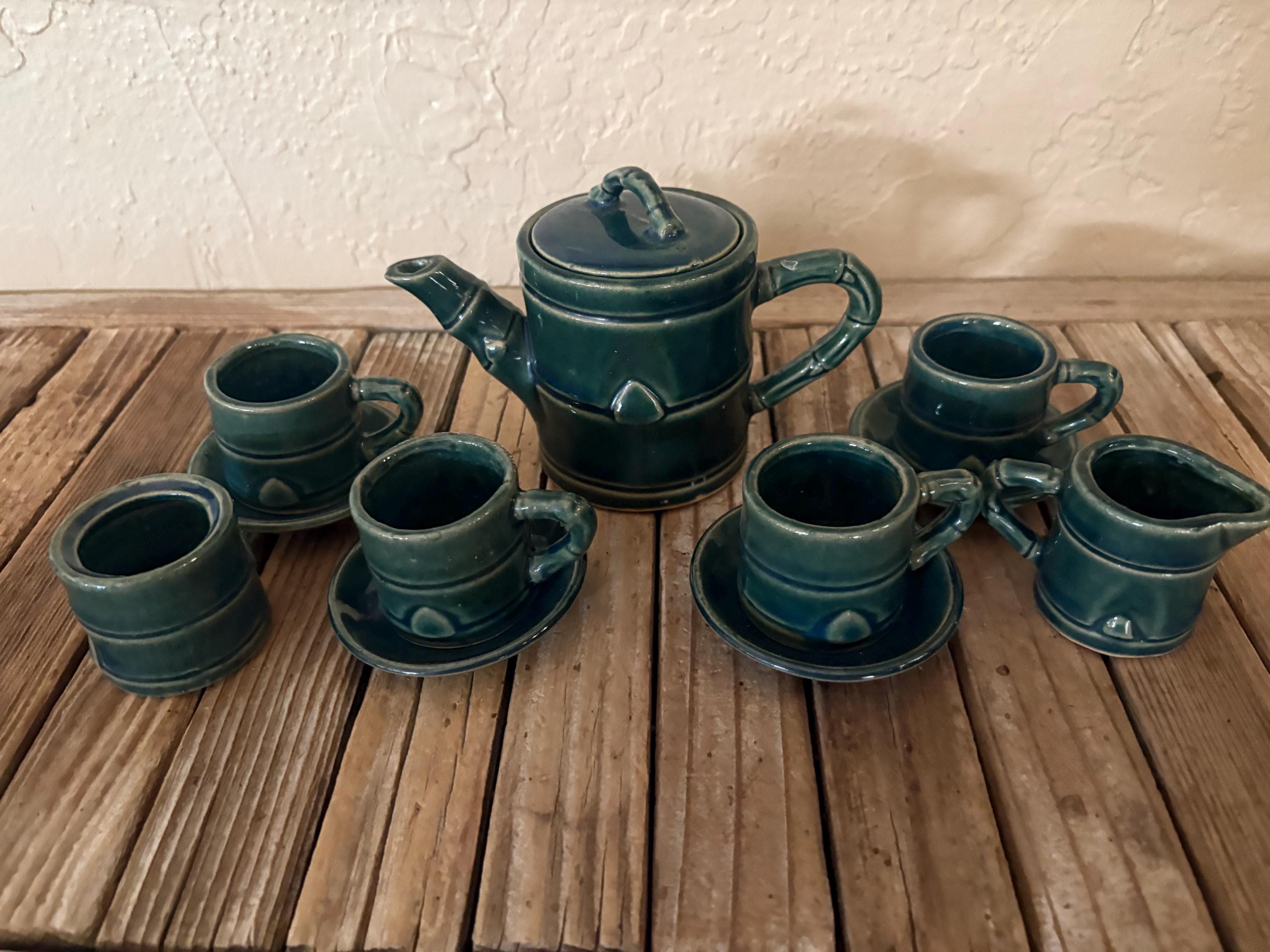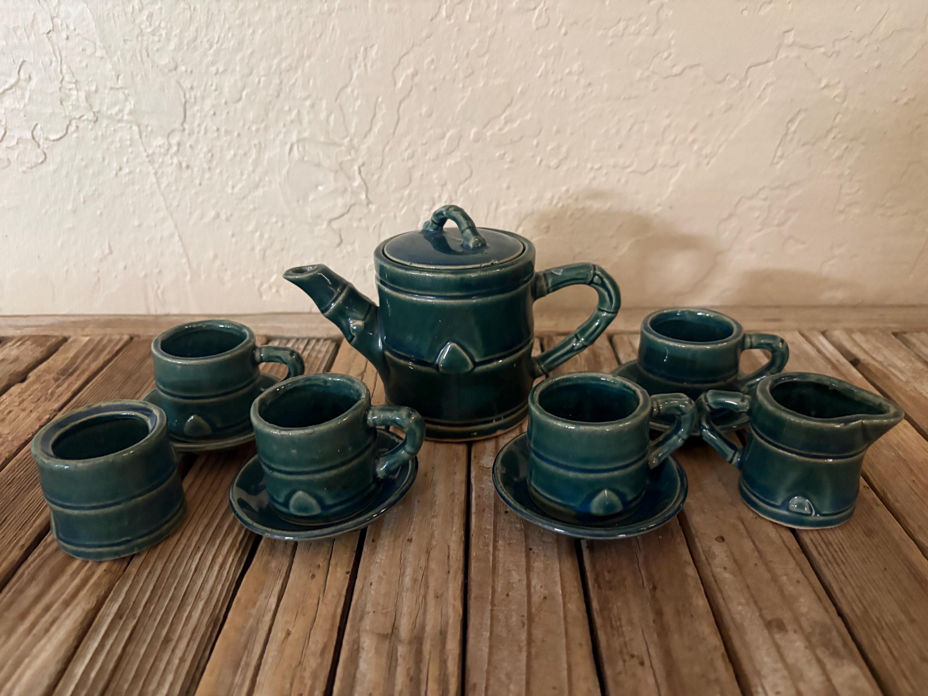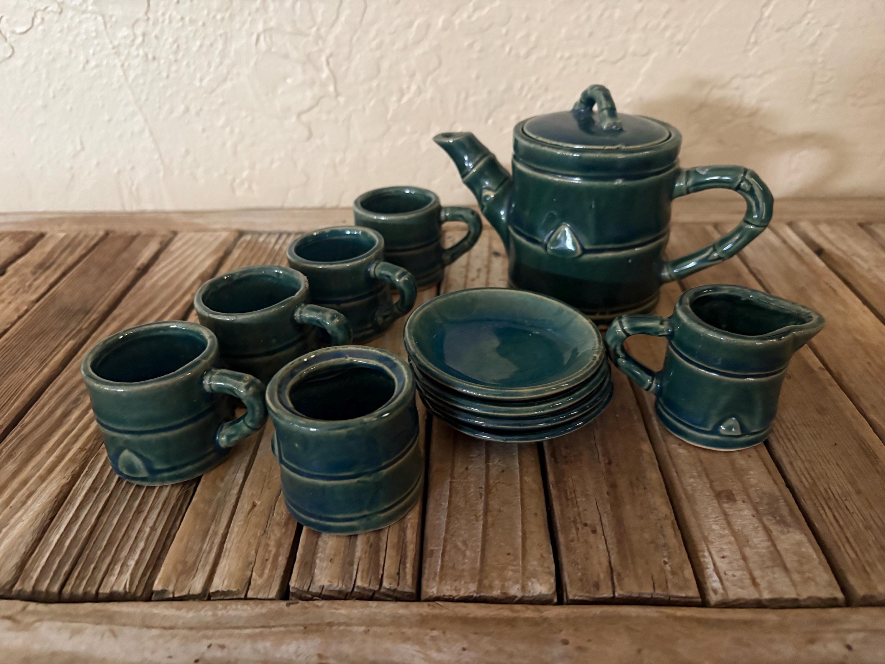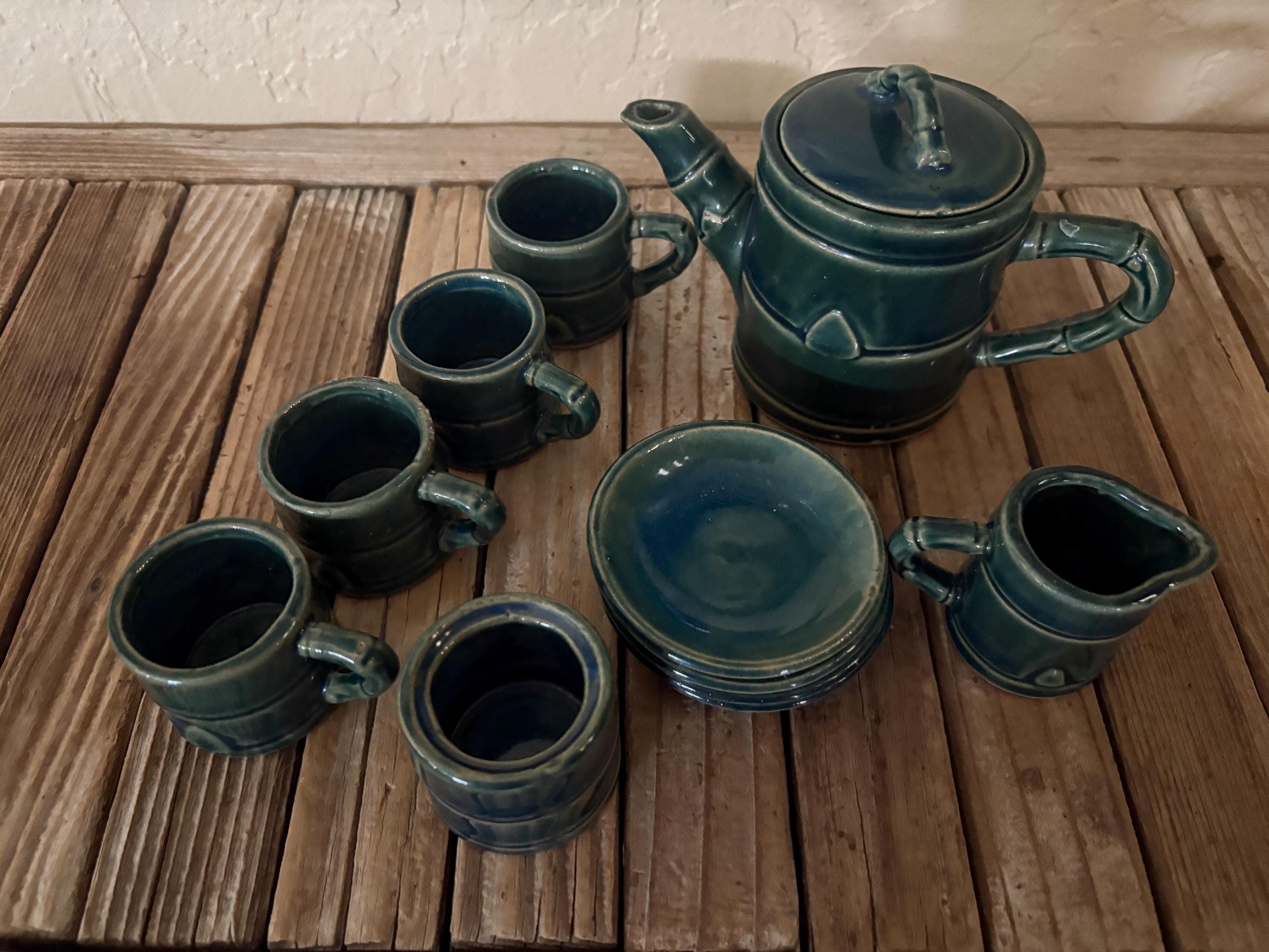 Vintage green faux bamboo handle tea/ saki set. In great vintage condition, normal wear due to age and use. The piece has some surface scrapes and crazing to the glaze, and is really clean on the inside, please see pictures. A beautiful piece to give as a gift or to use for everyday use.
