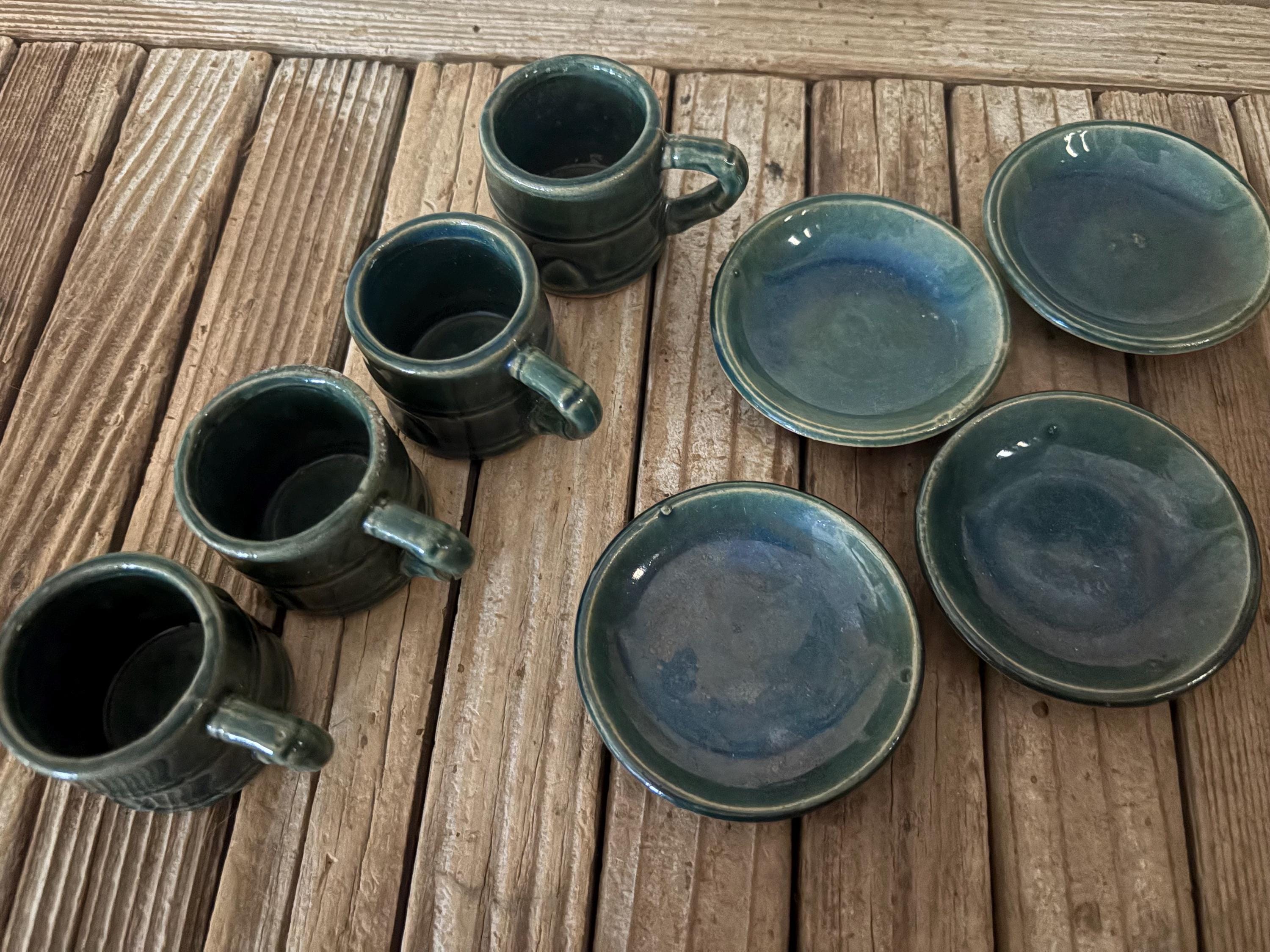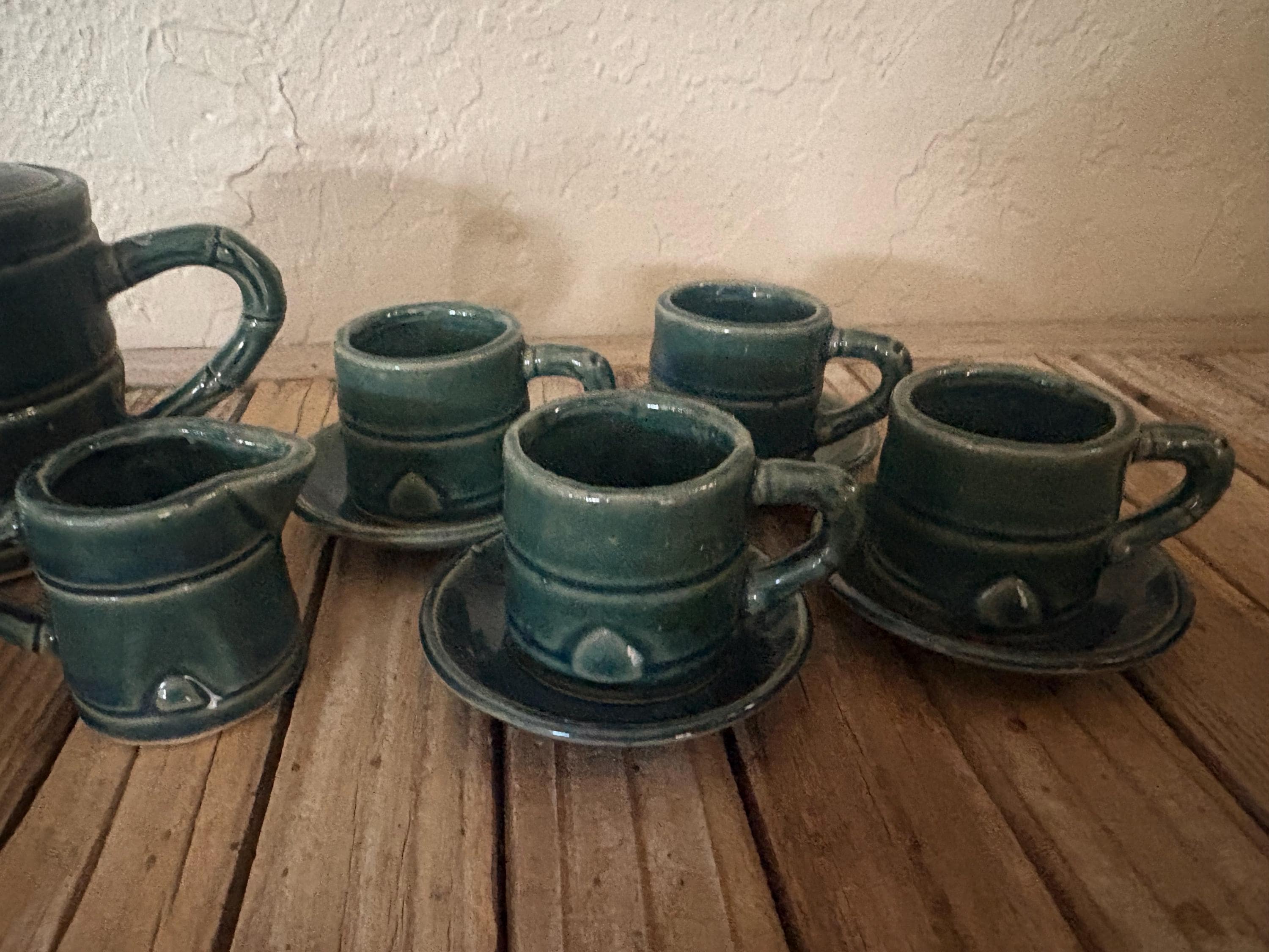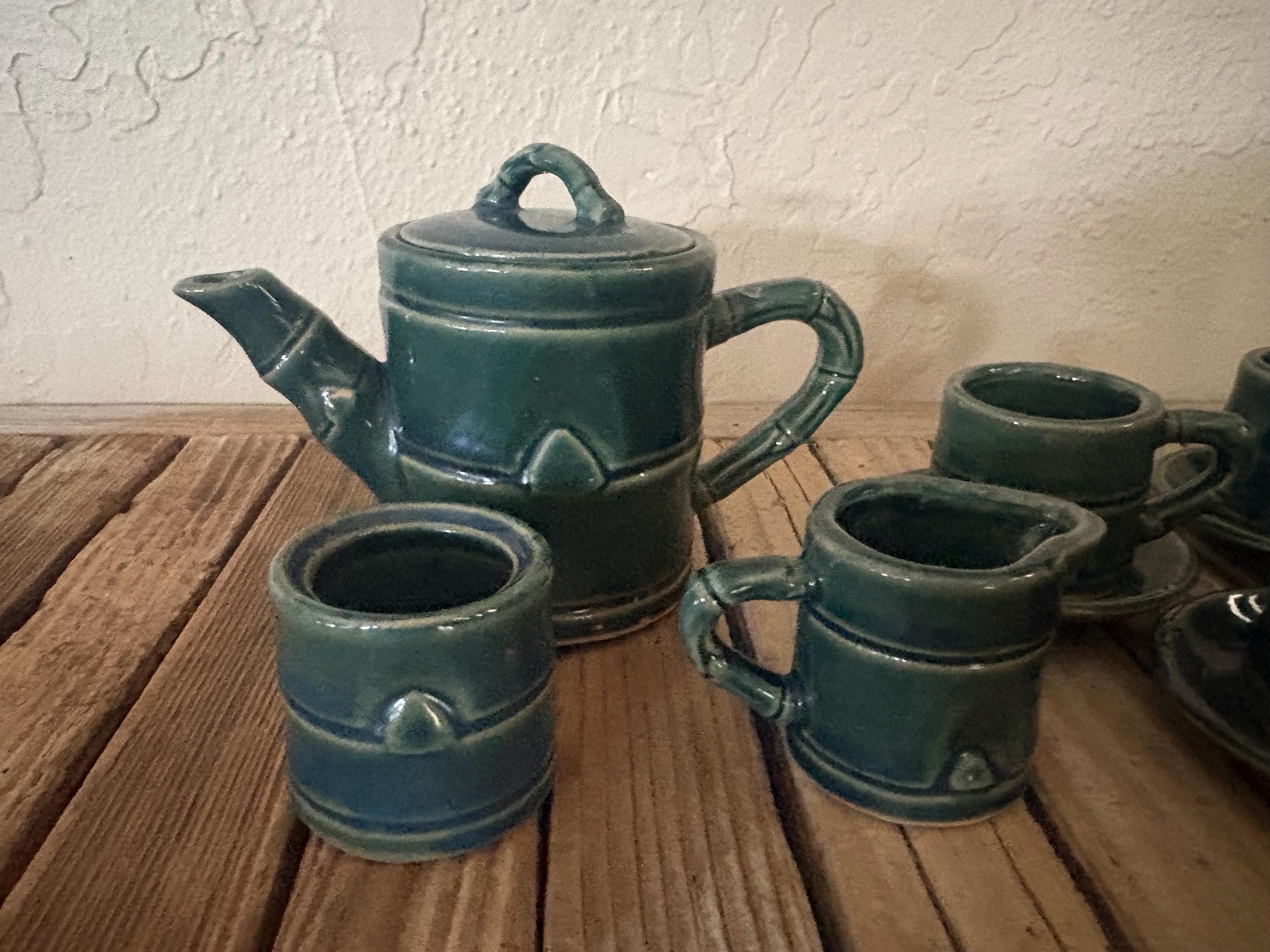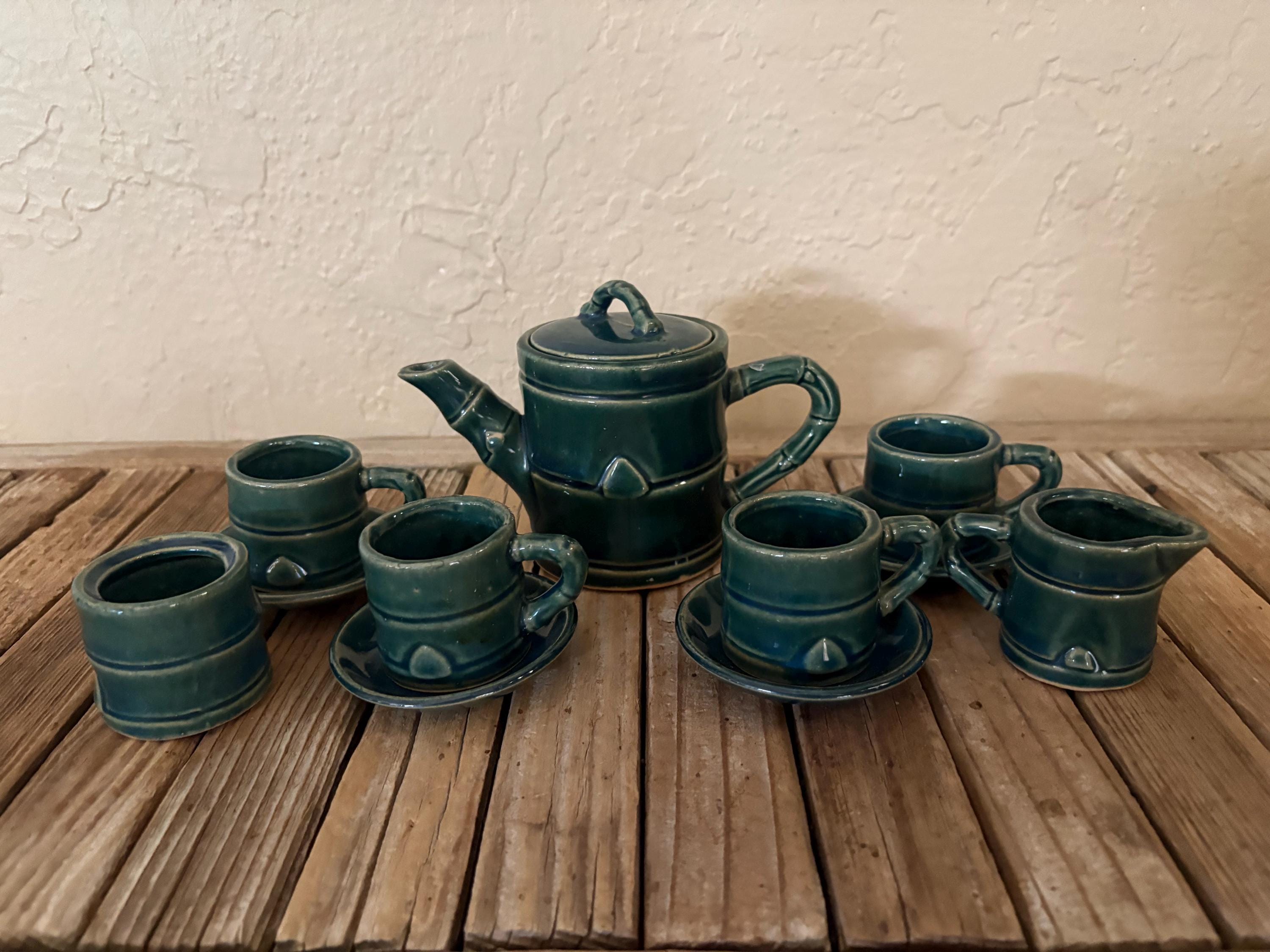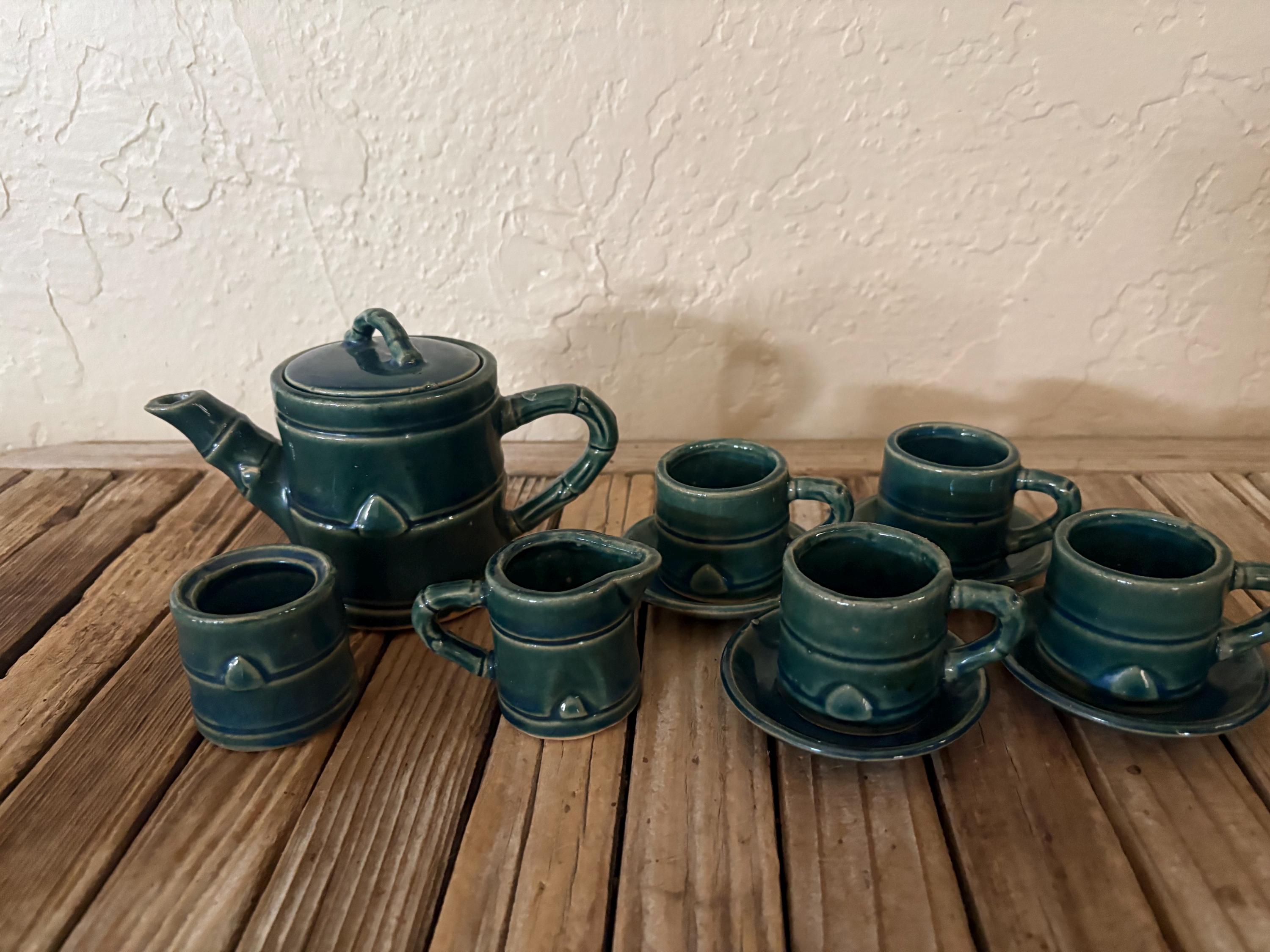 Vintage green faux bamboo handle tea/ saki set. In great vintage condition, normal wear due to age and use. The piece has some surface scrapes and crazing to the glaze, and is really clean on the inside, please see pictures. A beautiful piece to give as a gift or to use for everyday use.