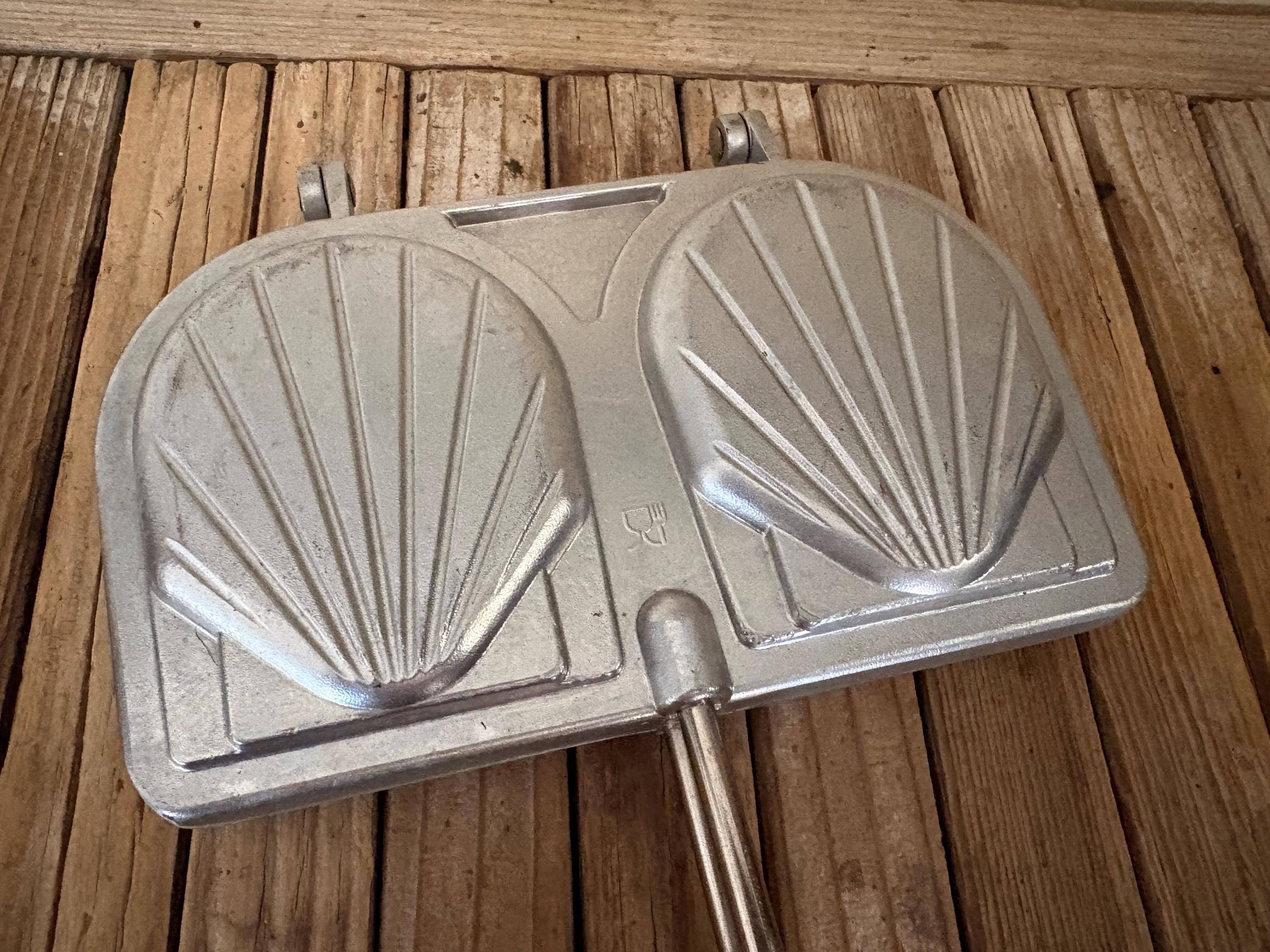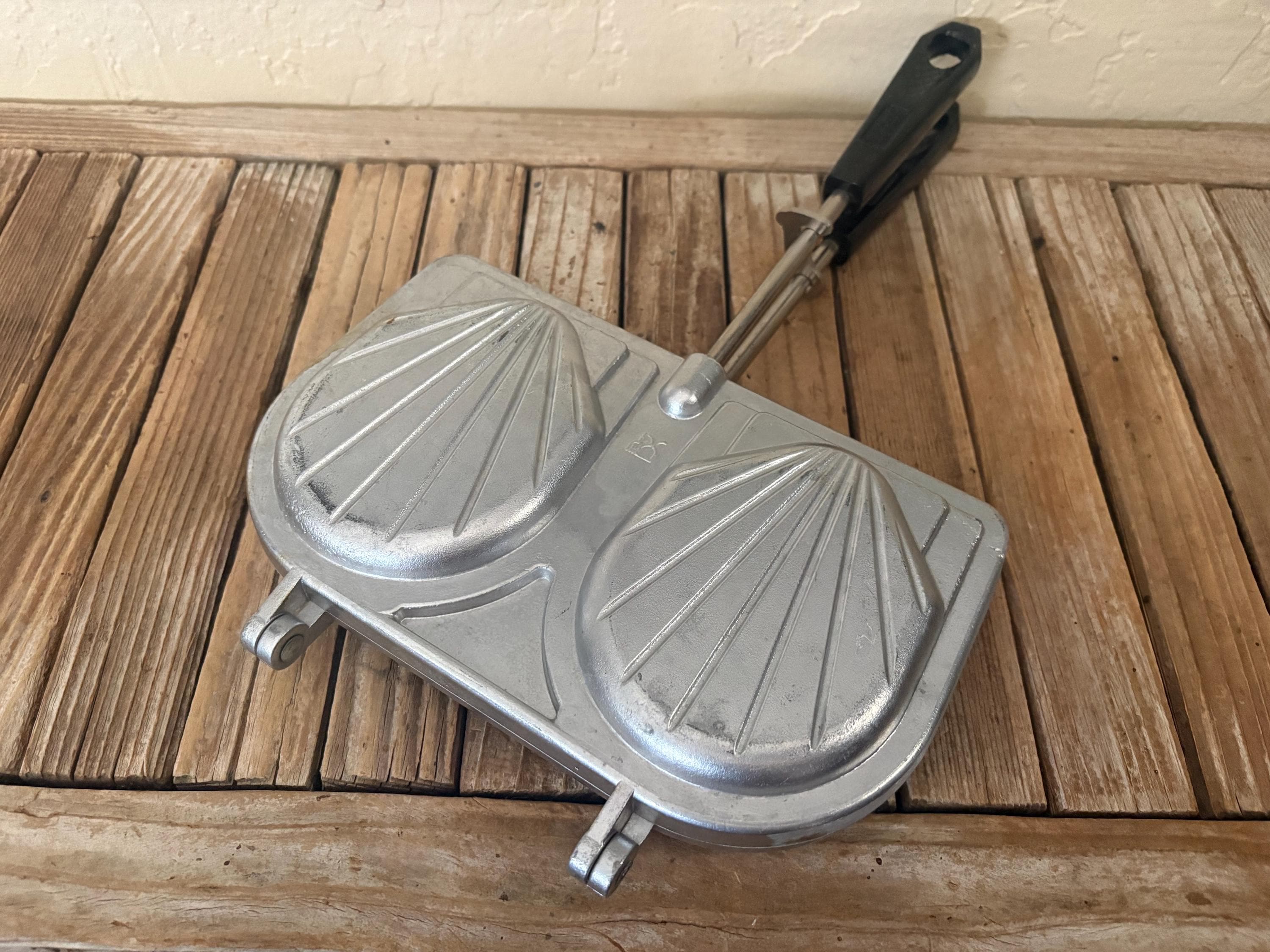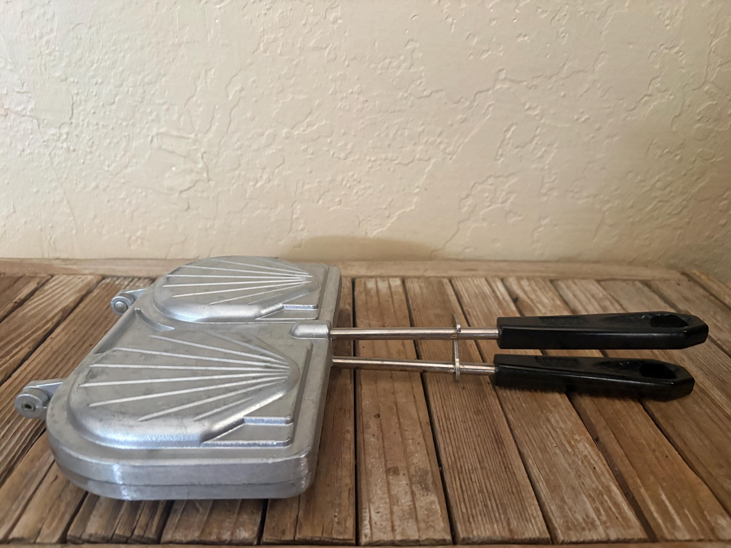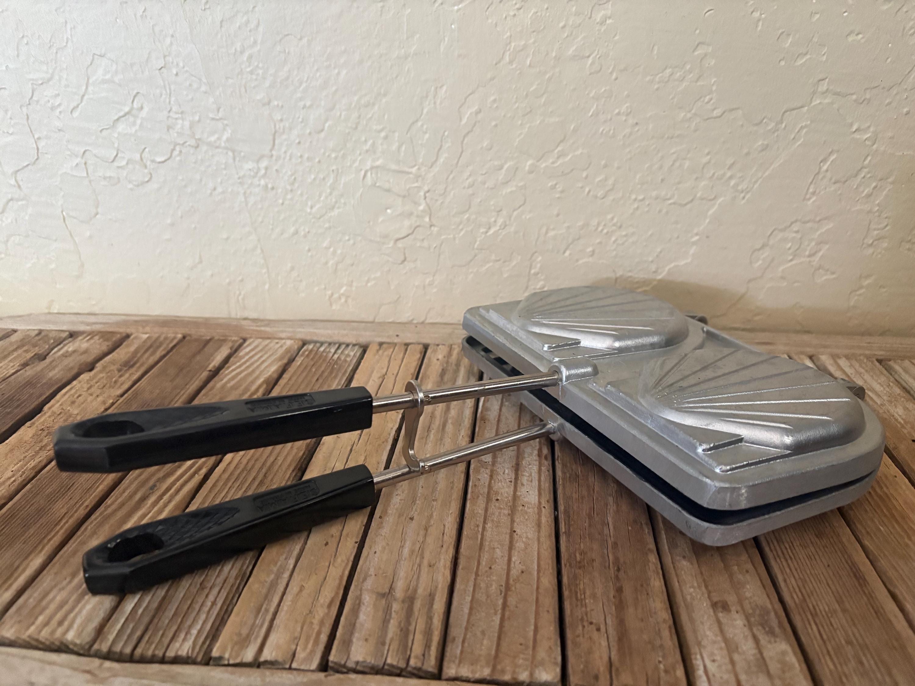 Vintage French waffle maker. In great vintage condition, normal wear due to age and use. There is some discoloration, markings and remnant film to the piece, please see pictures. An awesome piece to add to your kitchen.