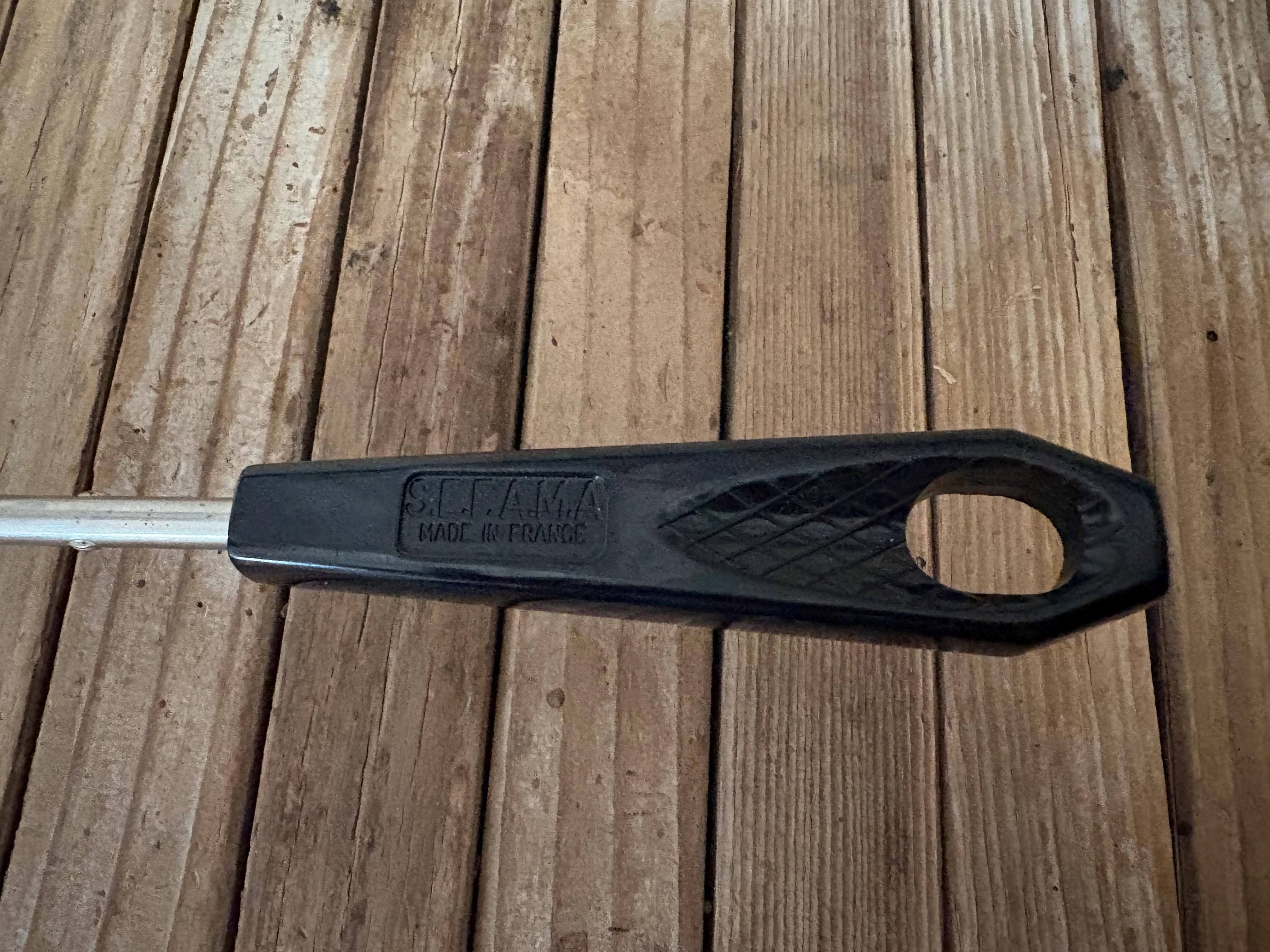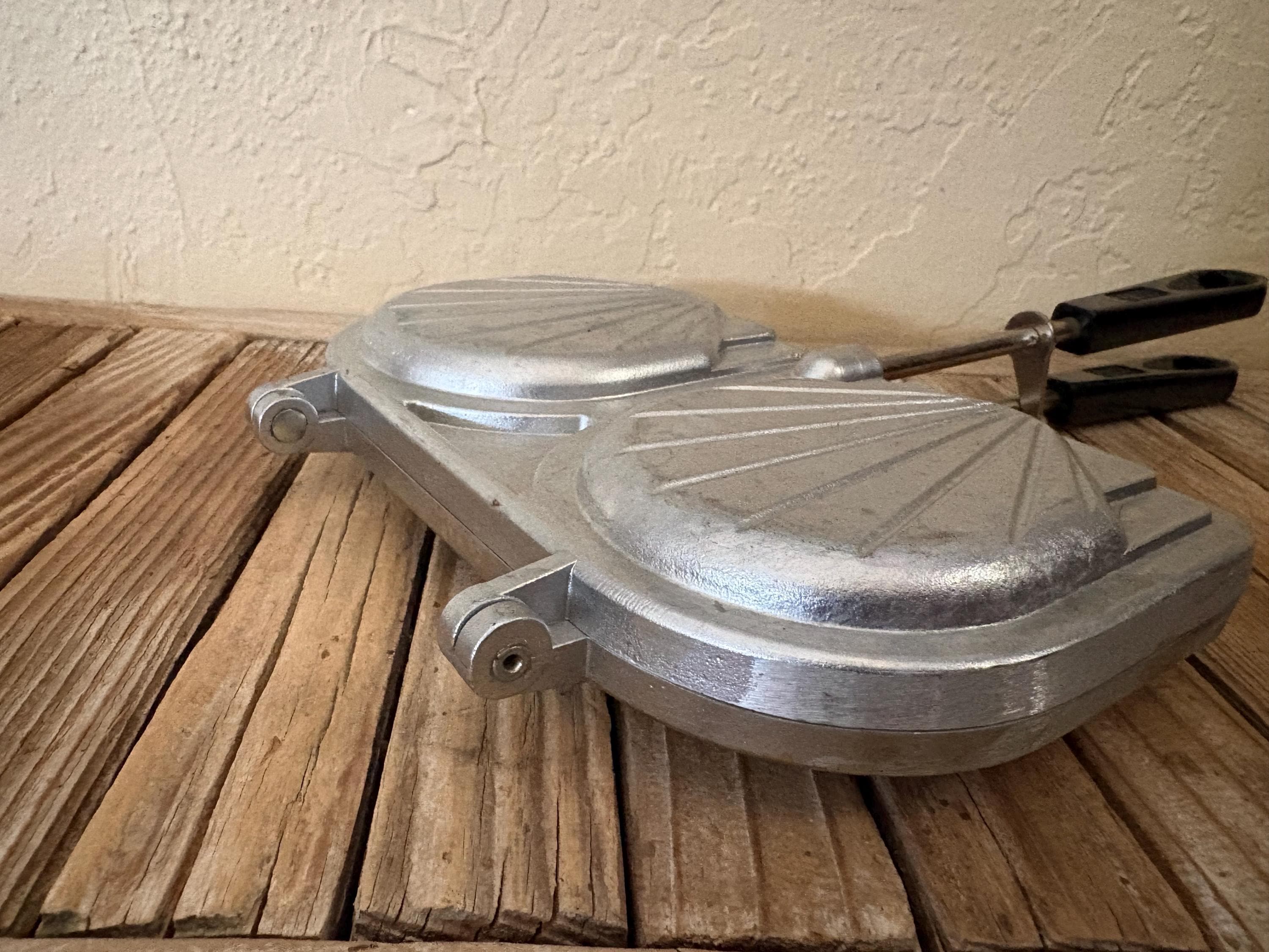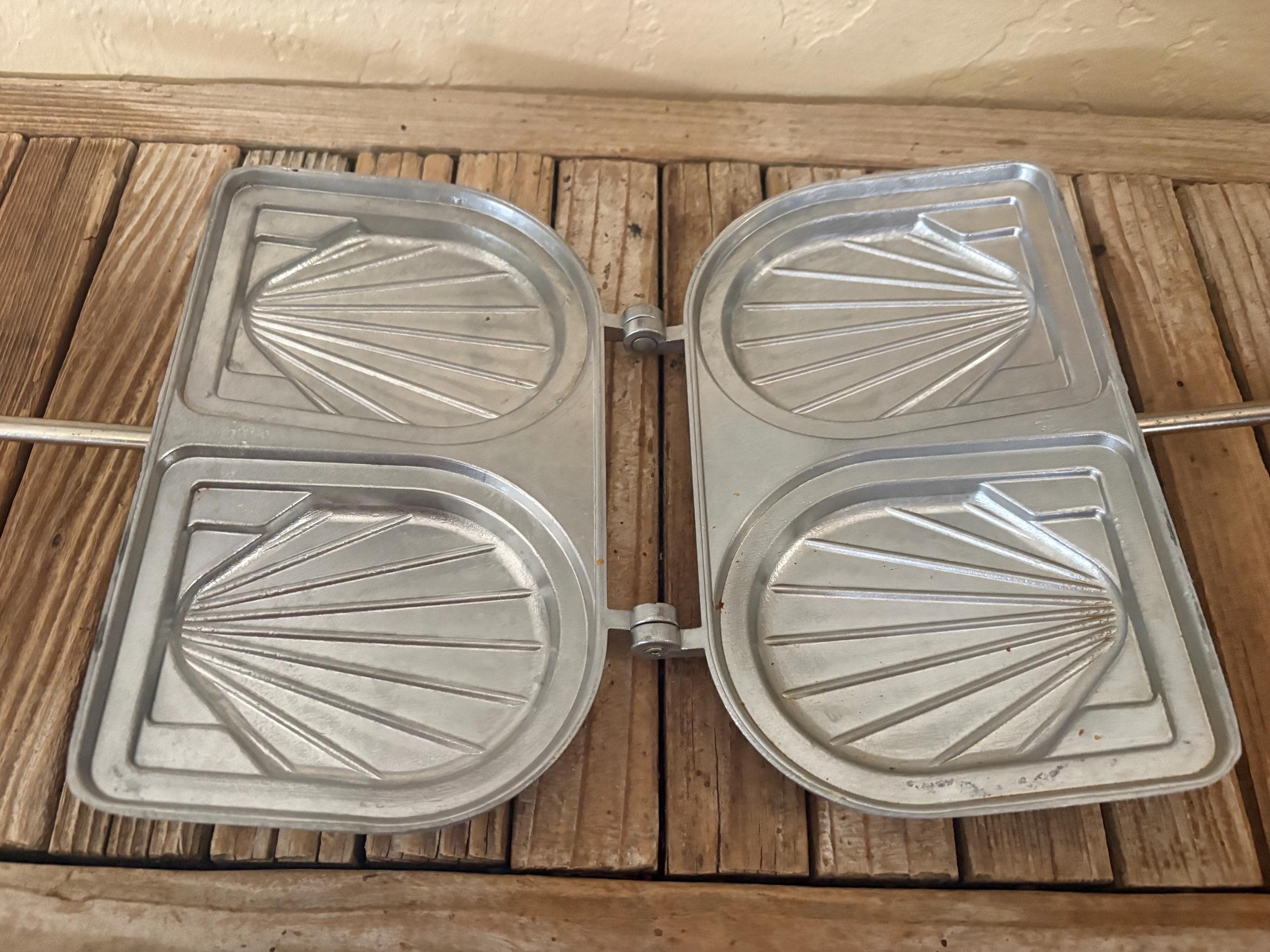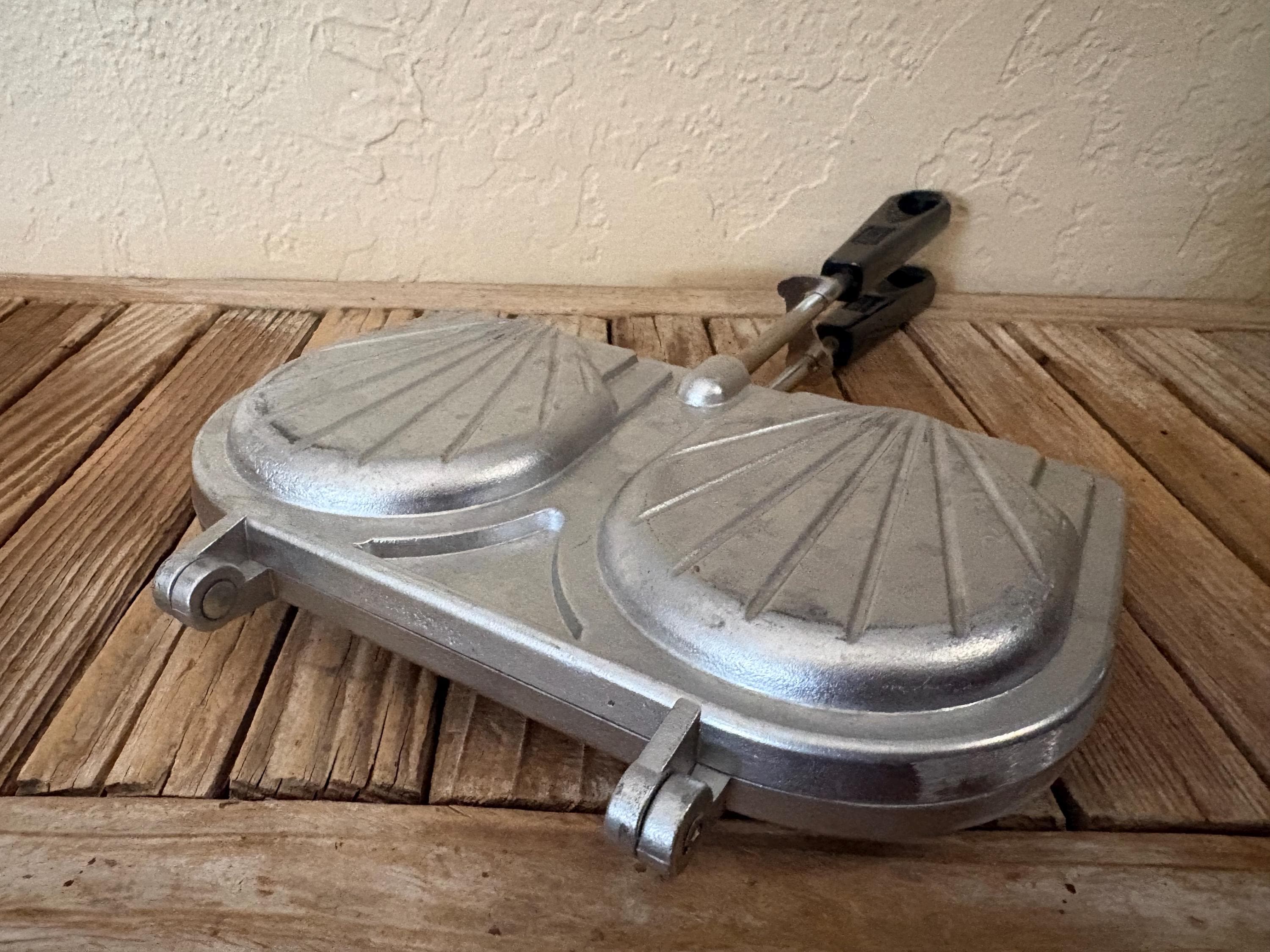 Vintage French waffle maker. In great vintage condition, normal wear due to age and use. There is some discoloration, markings and remnant film to the piece, please see pictures. An awesome piece to add to your kitchen.