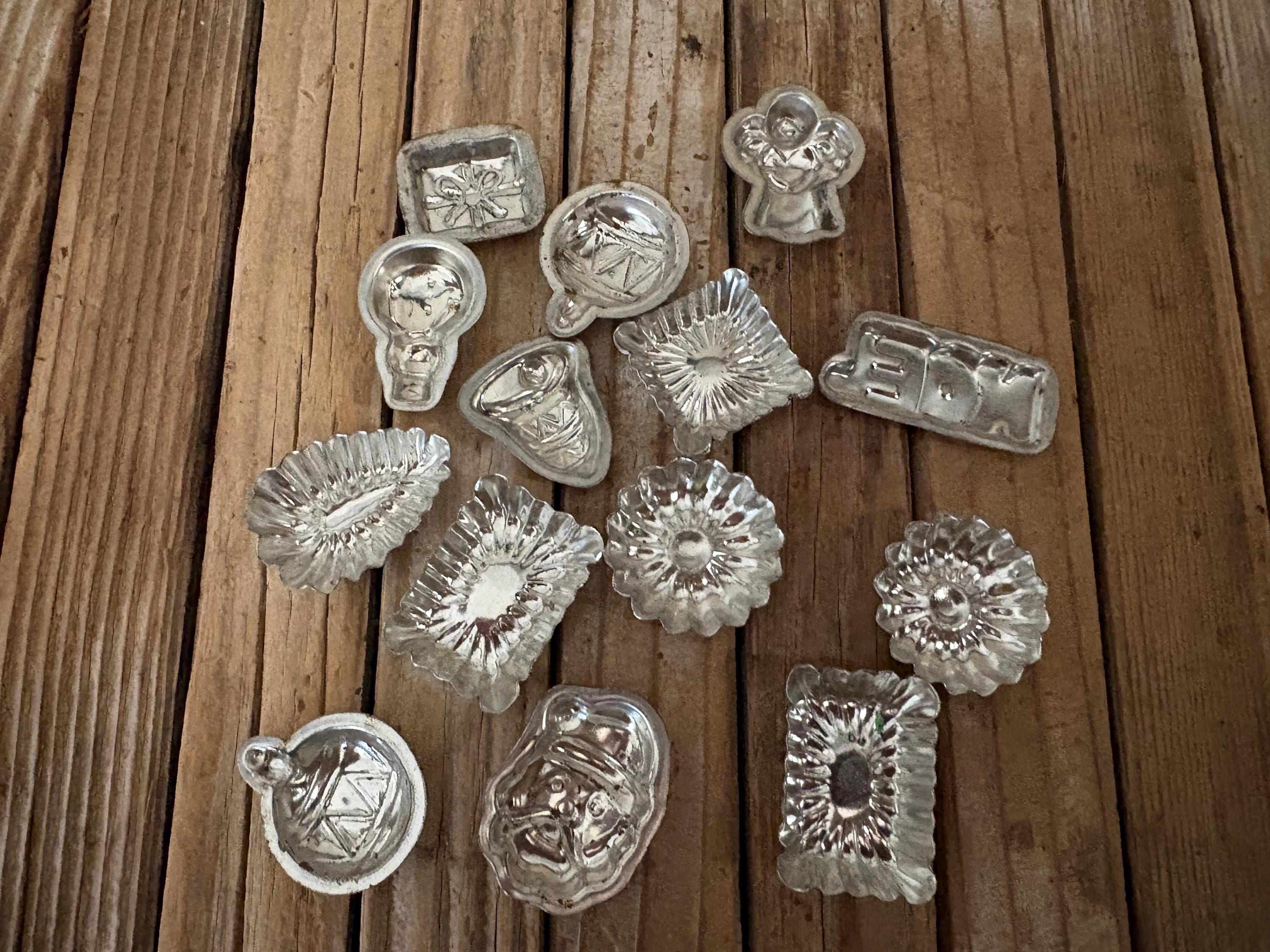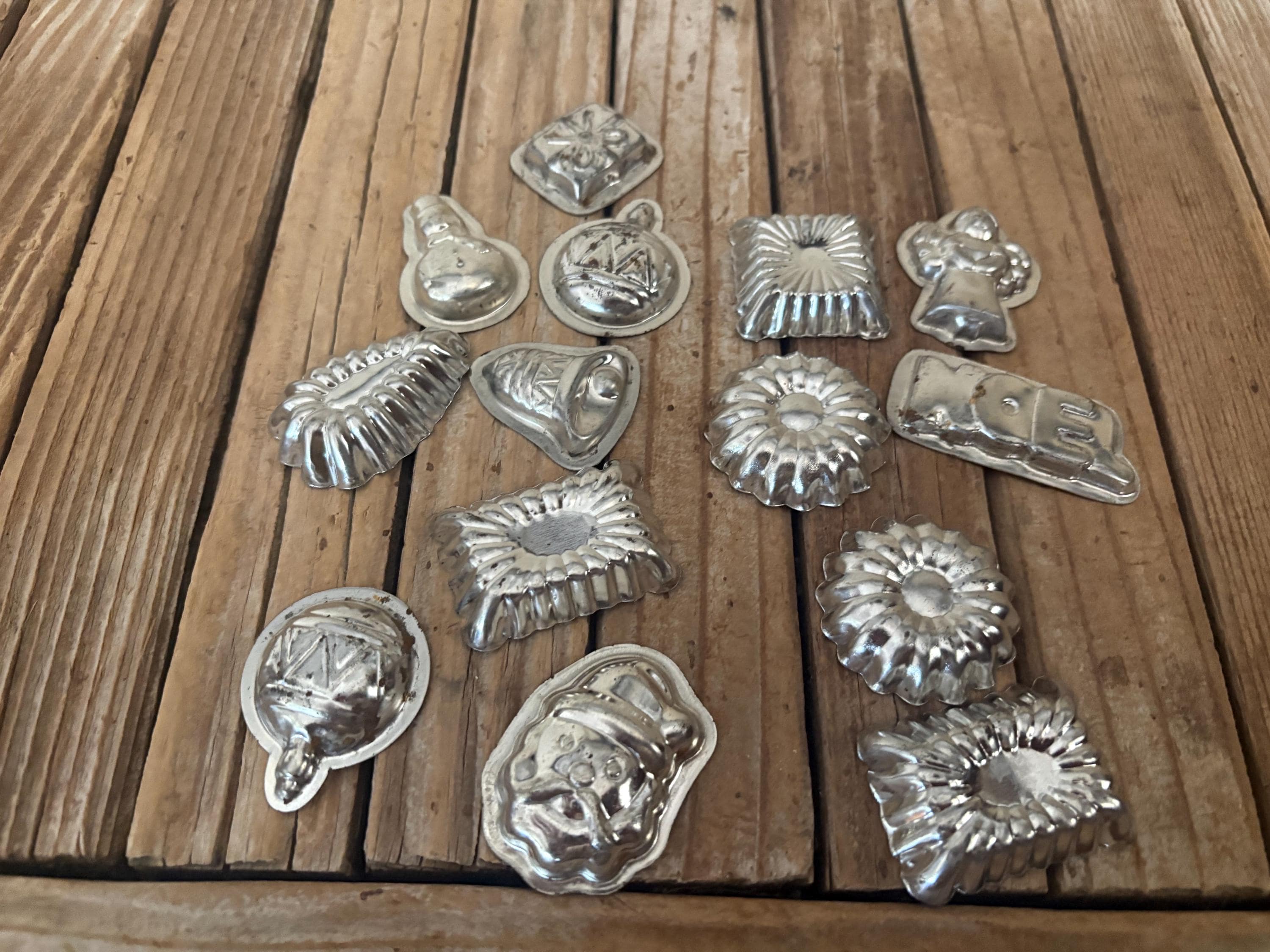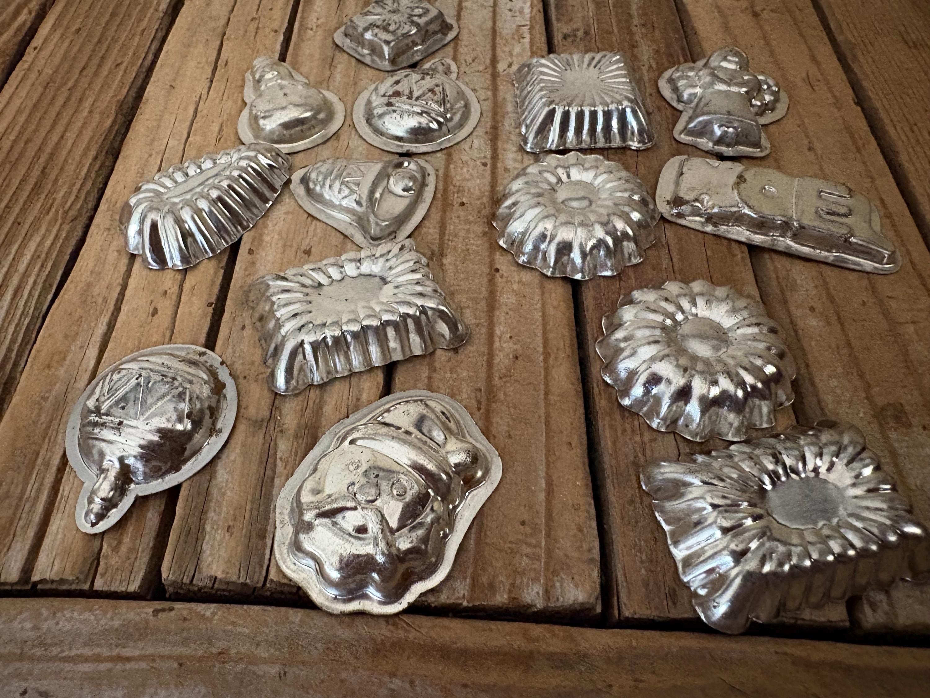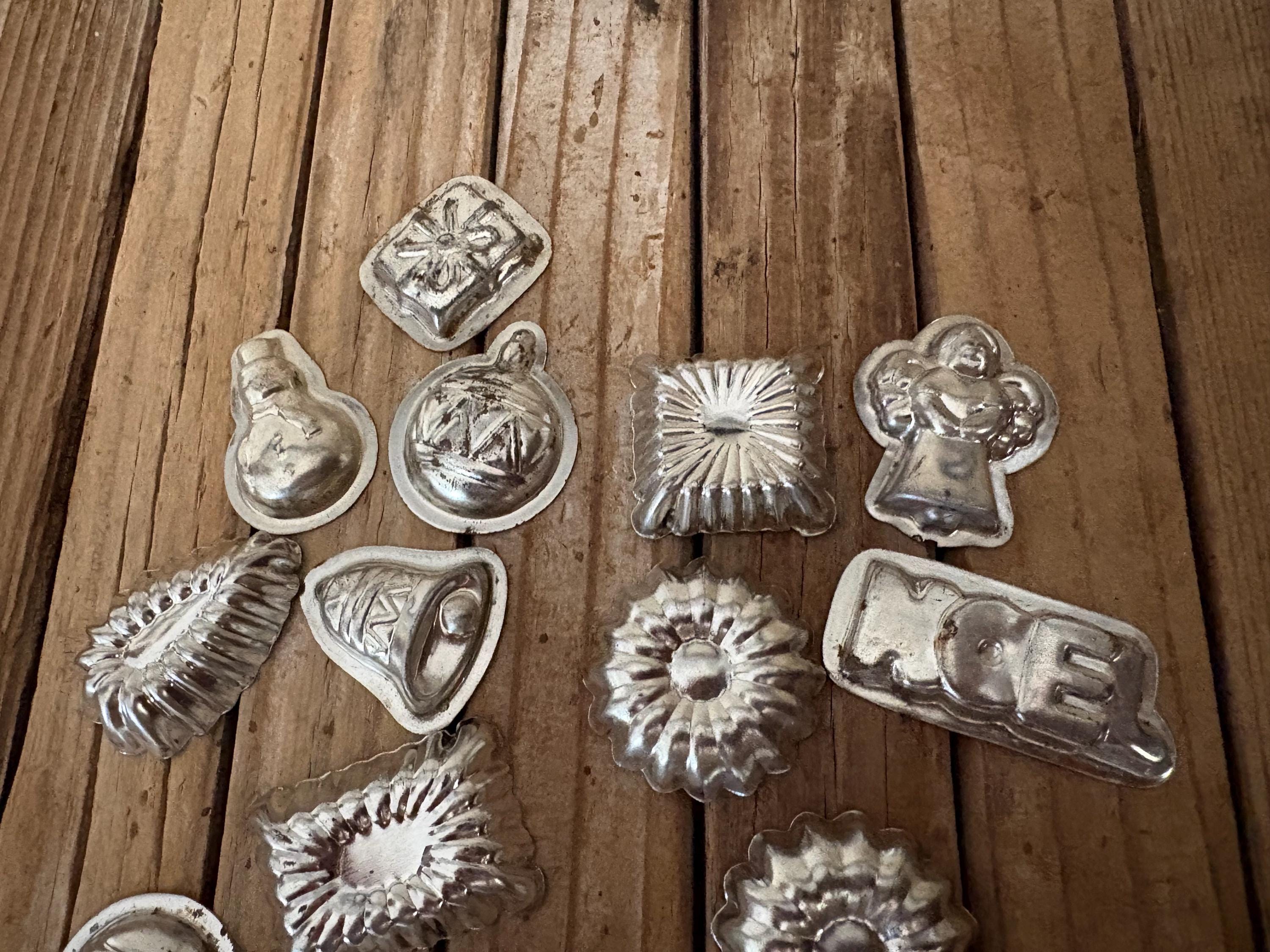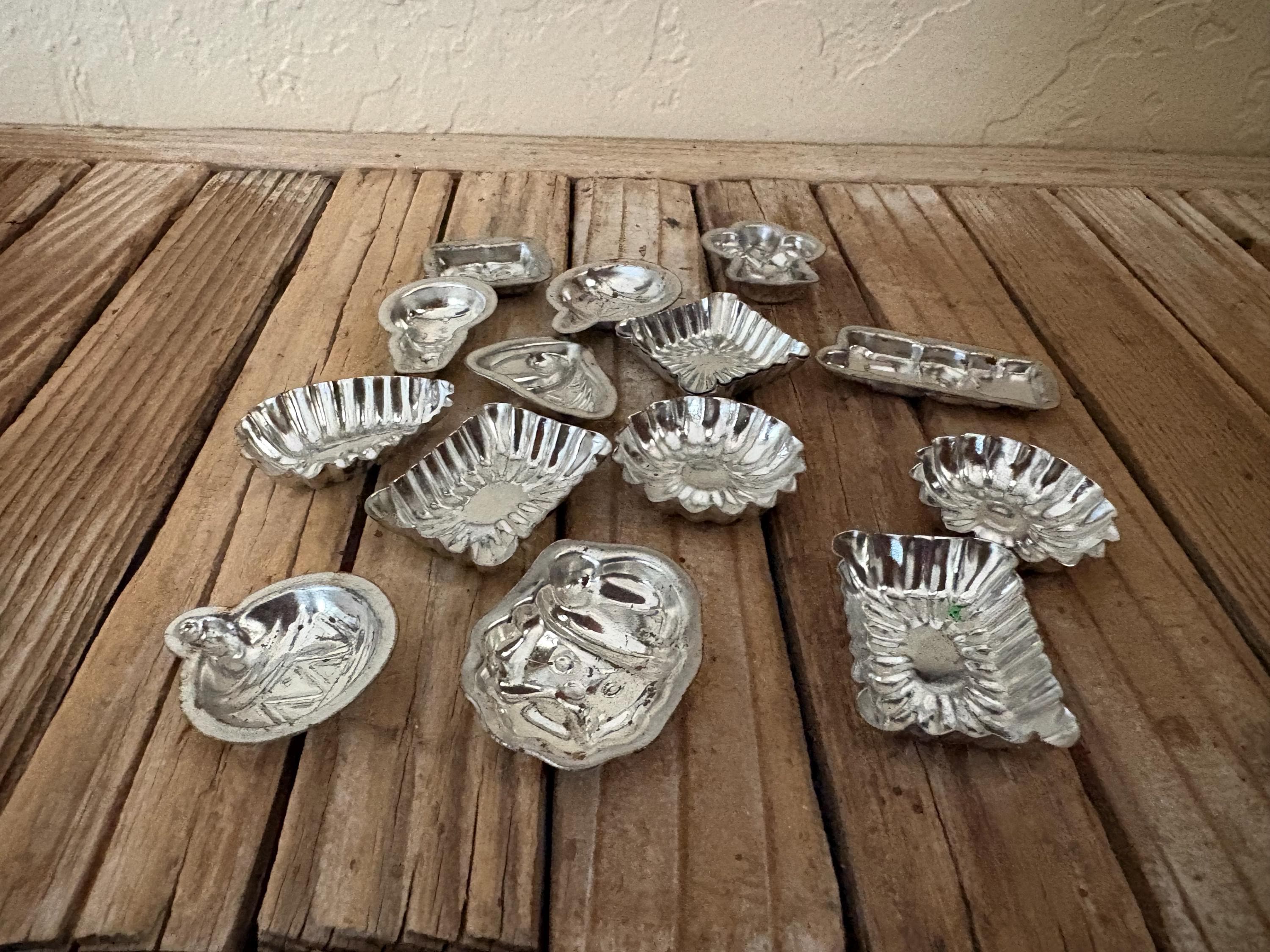 Set of 15 small metal molds. In good condition, normal wear due to age and use. The set has surface scrapes, discoloration, markings and rust to some of them, please see pictures. A great set to make cookies, candies, candles or soap.