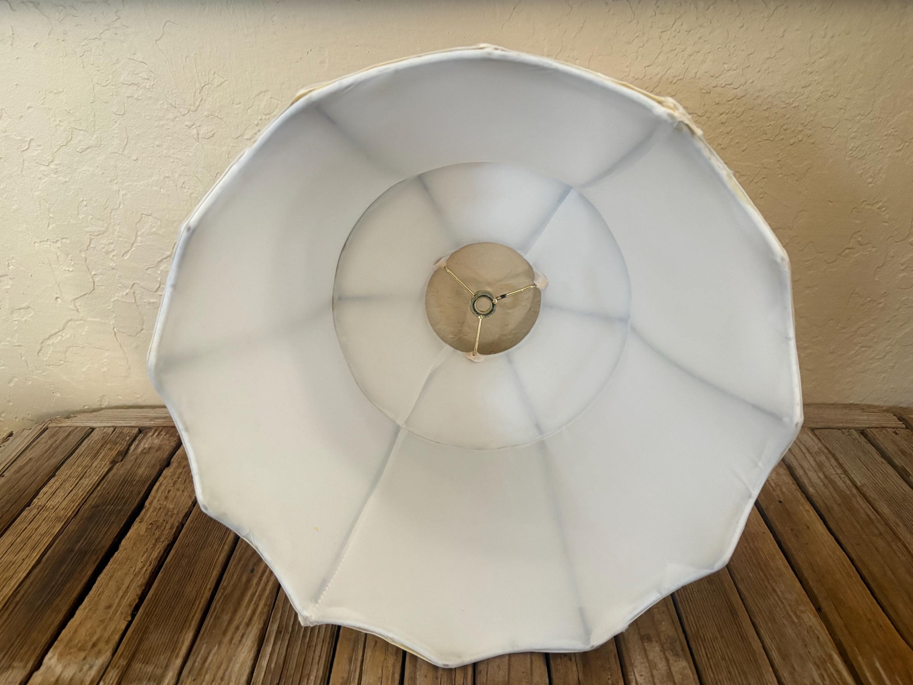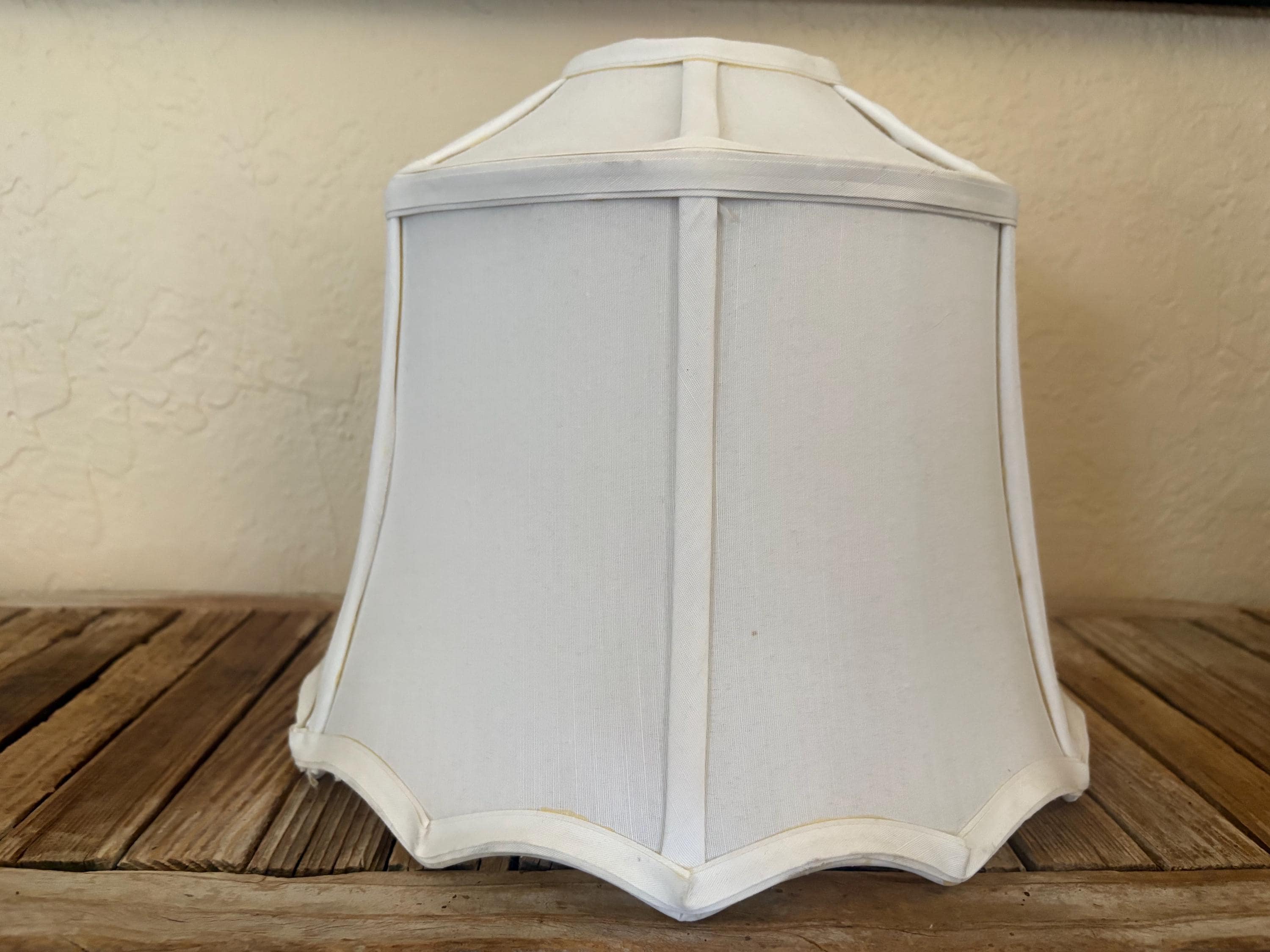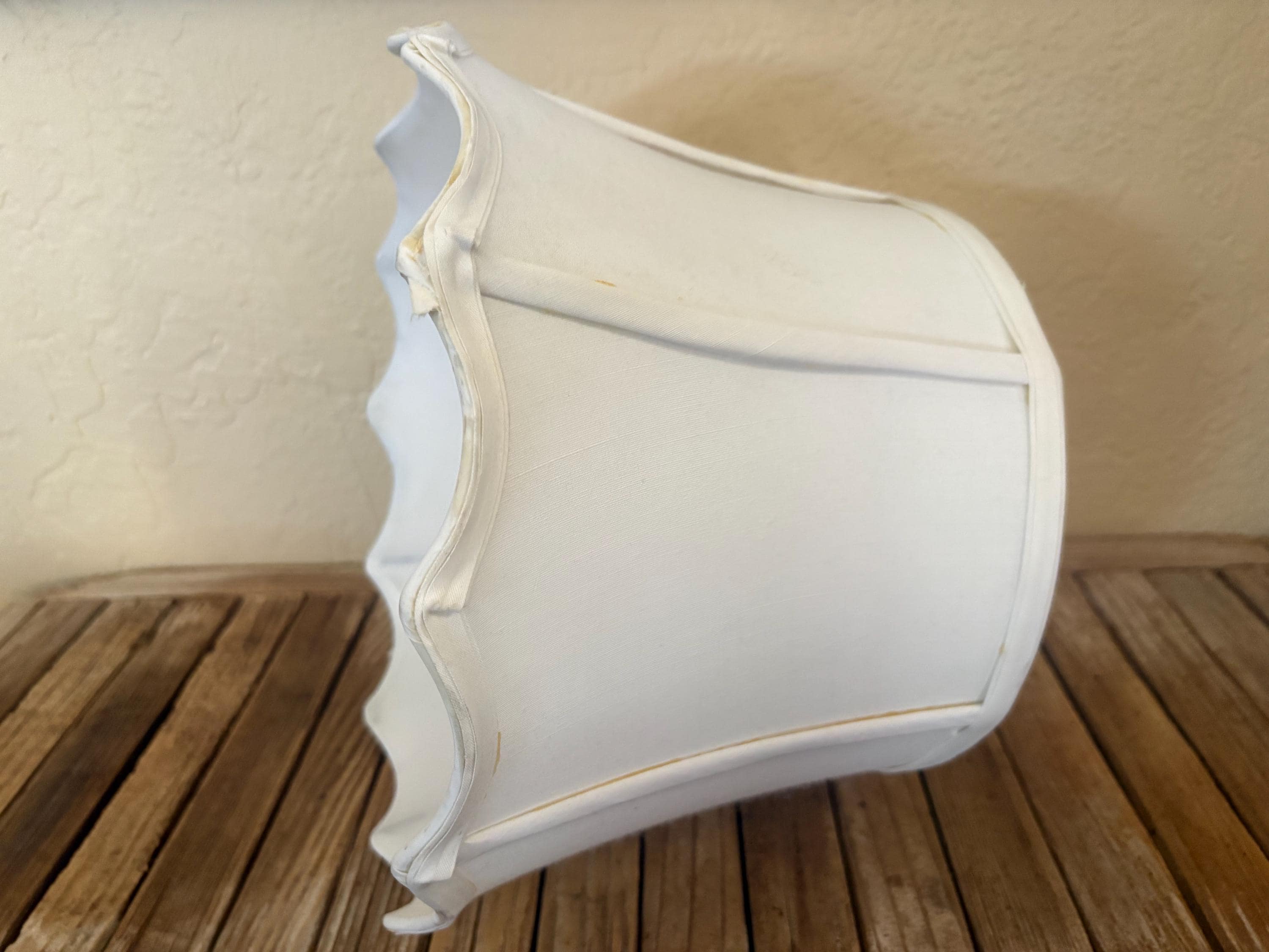 Vintage white fabric scalloped lamp shade. In good condition, normal wear due to age and use. The shade has some surface scrapes to the fabric, as well as markings and discolorations, please see pictures. A beautiful piece to add to your home.