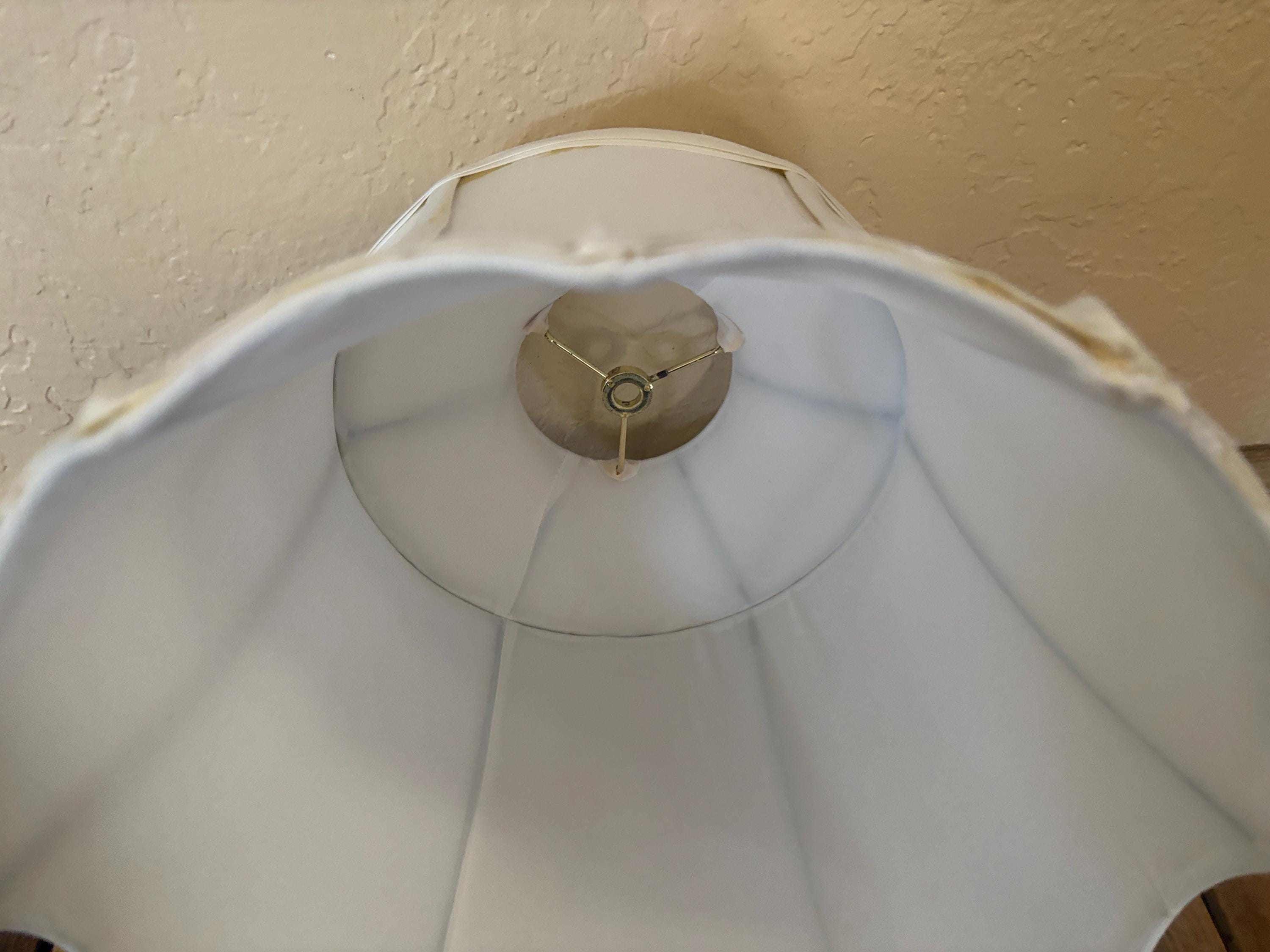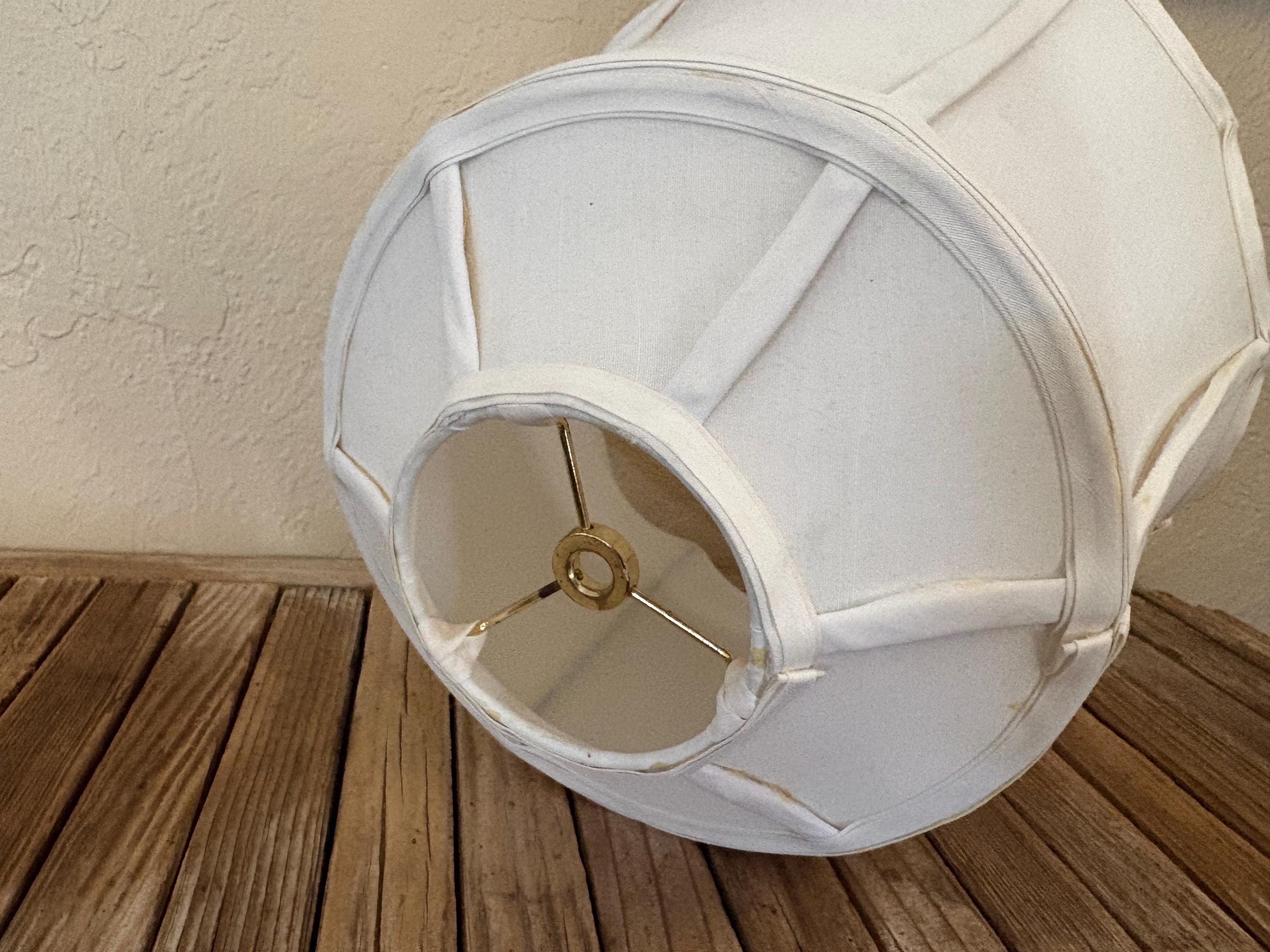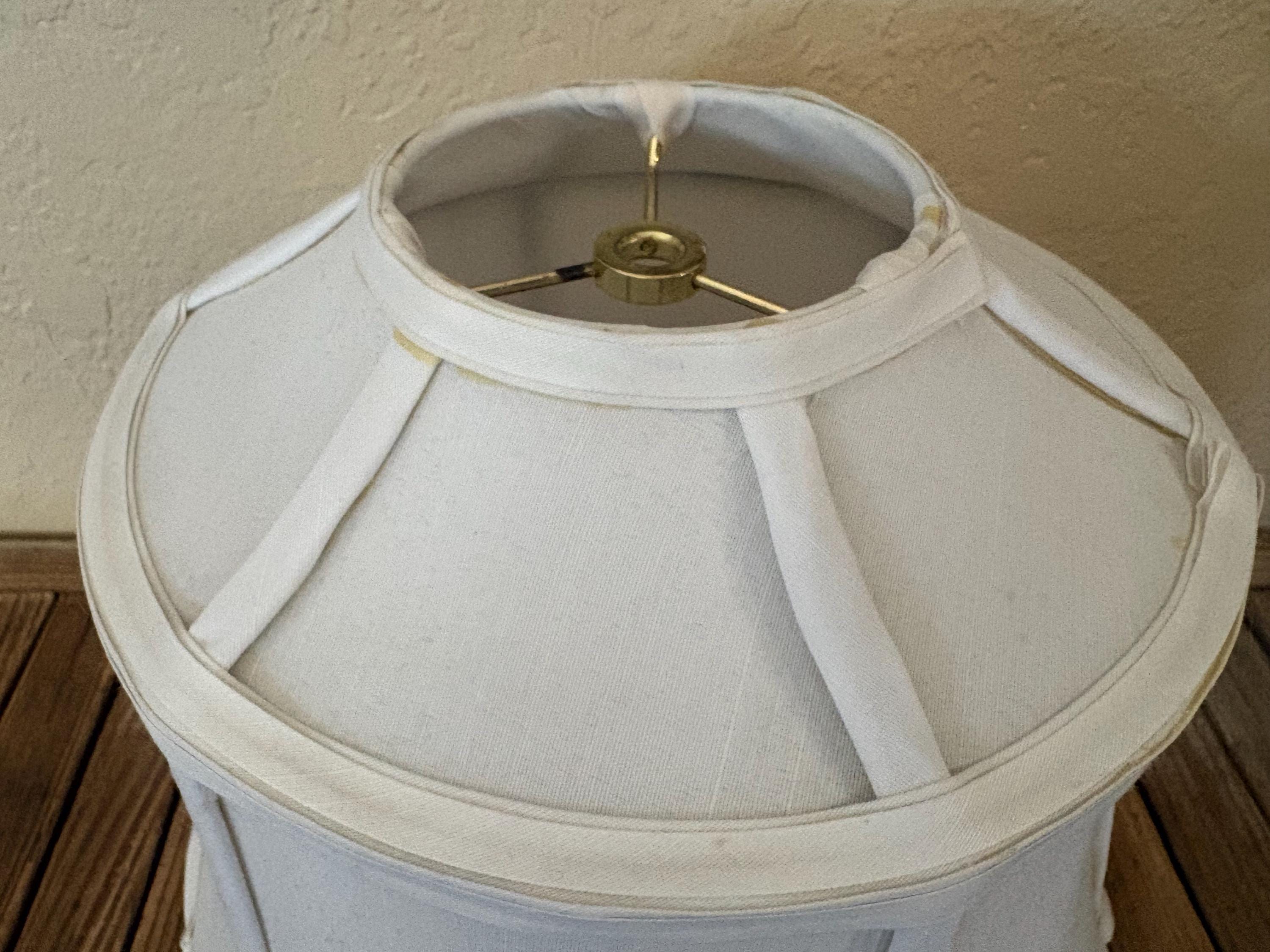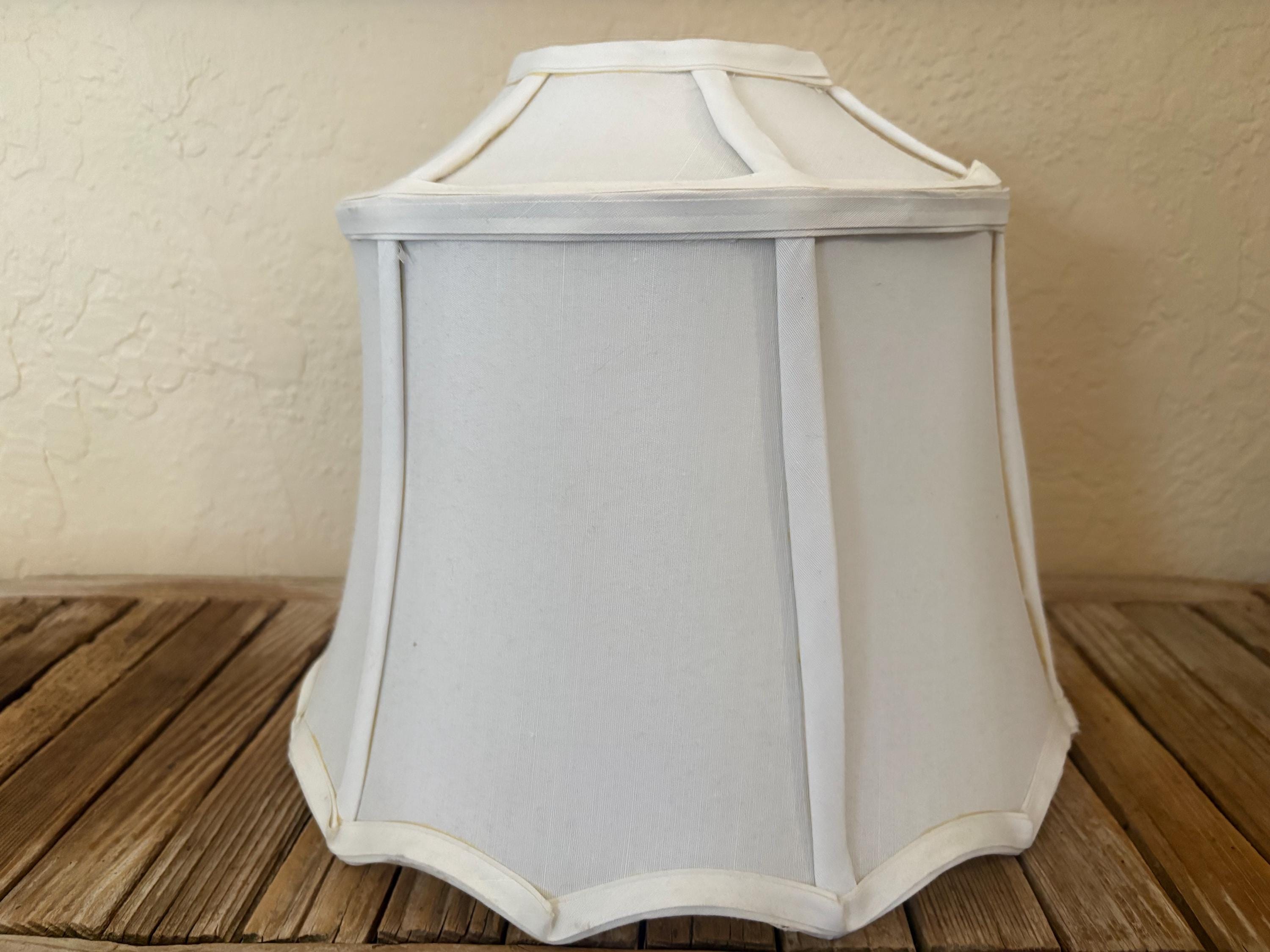 Vintage white fabric scalloped lamp shade. In good condition, normal wear due to age and use. The shade has some surface scrapes to the fabric, as well as markings and discolorations, please see pictures. A beautiful piece to add to your home.