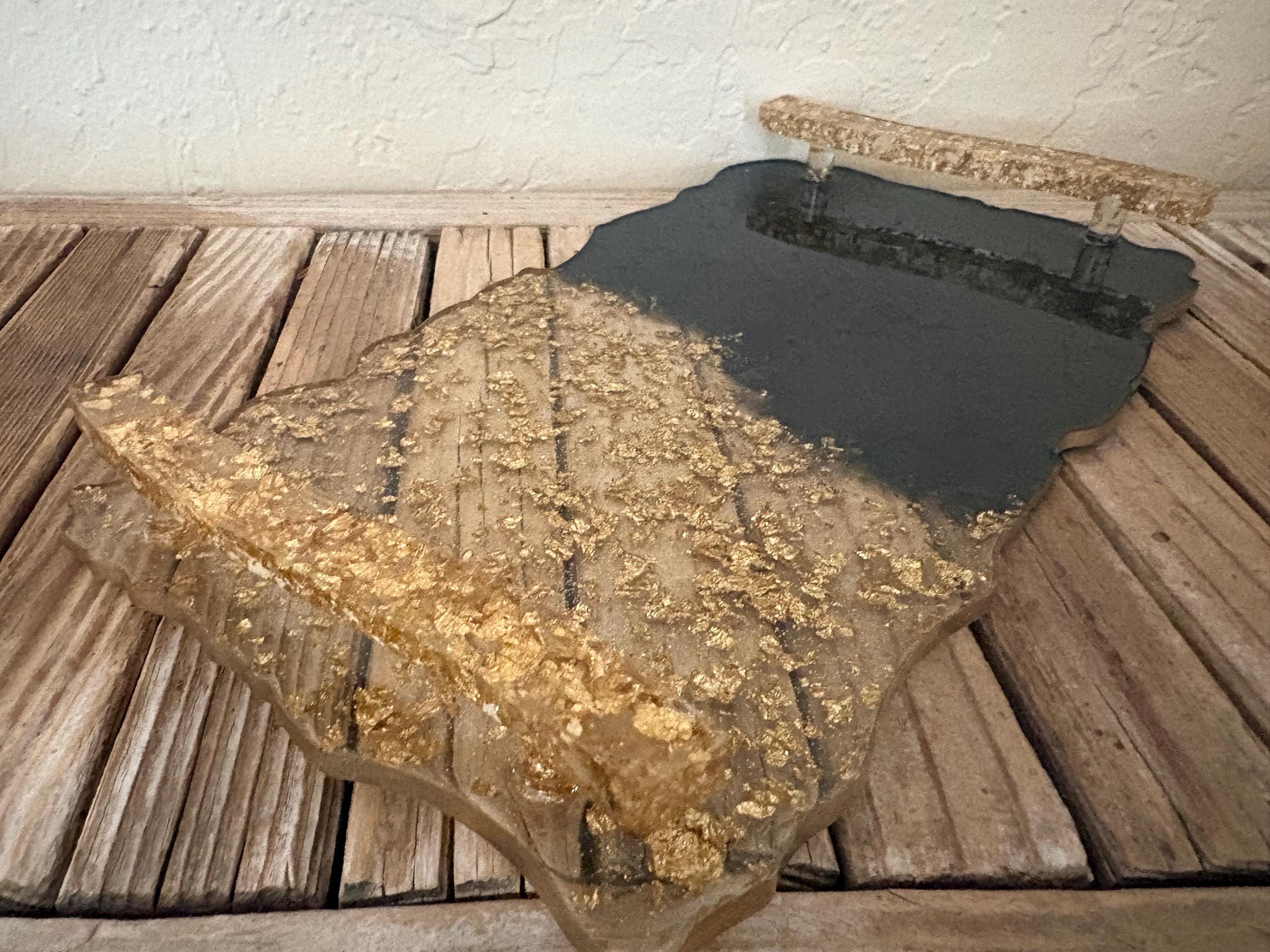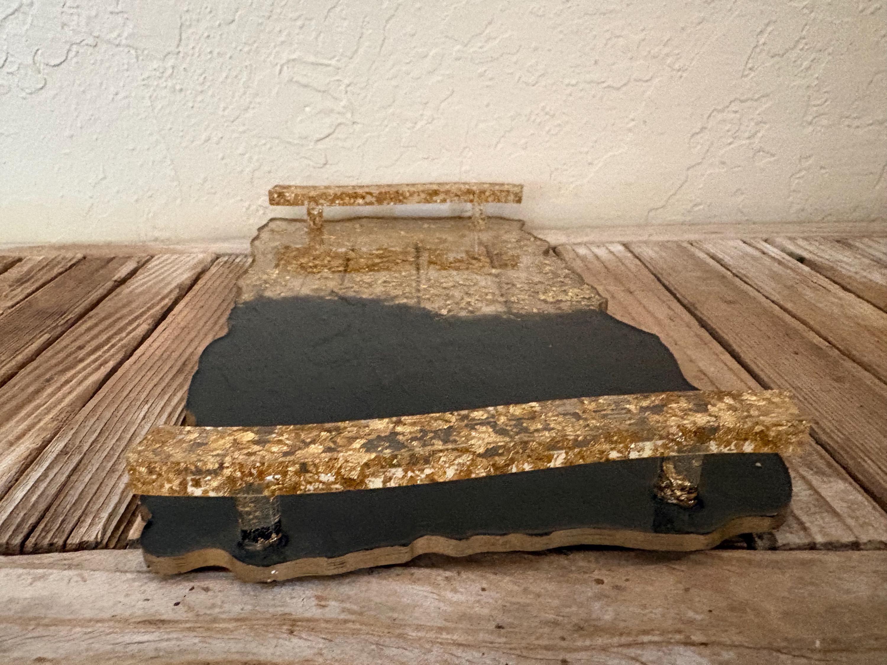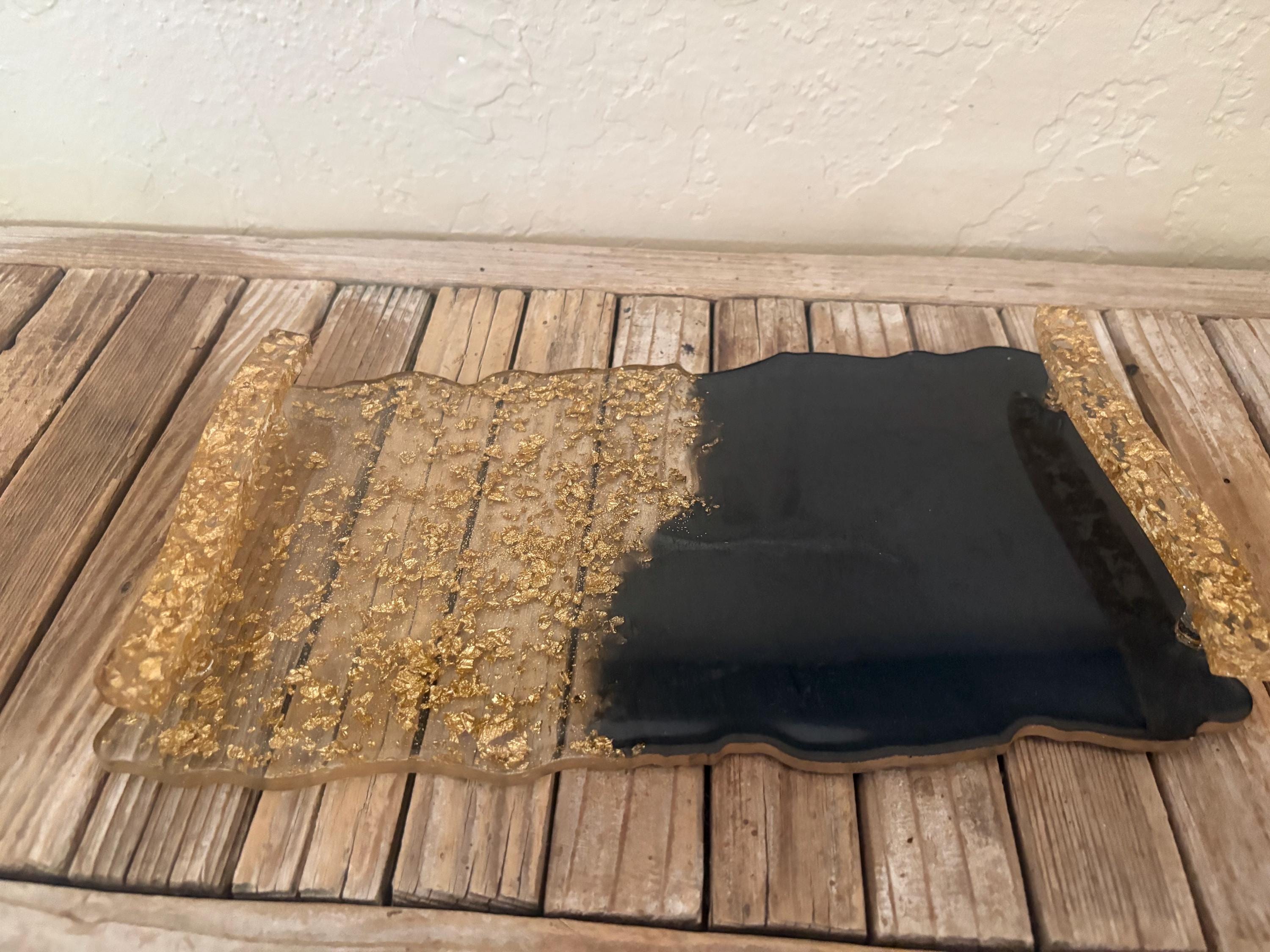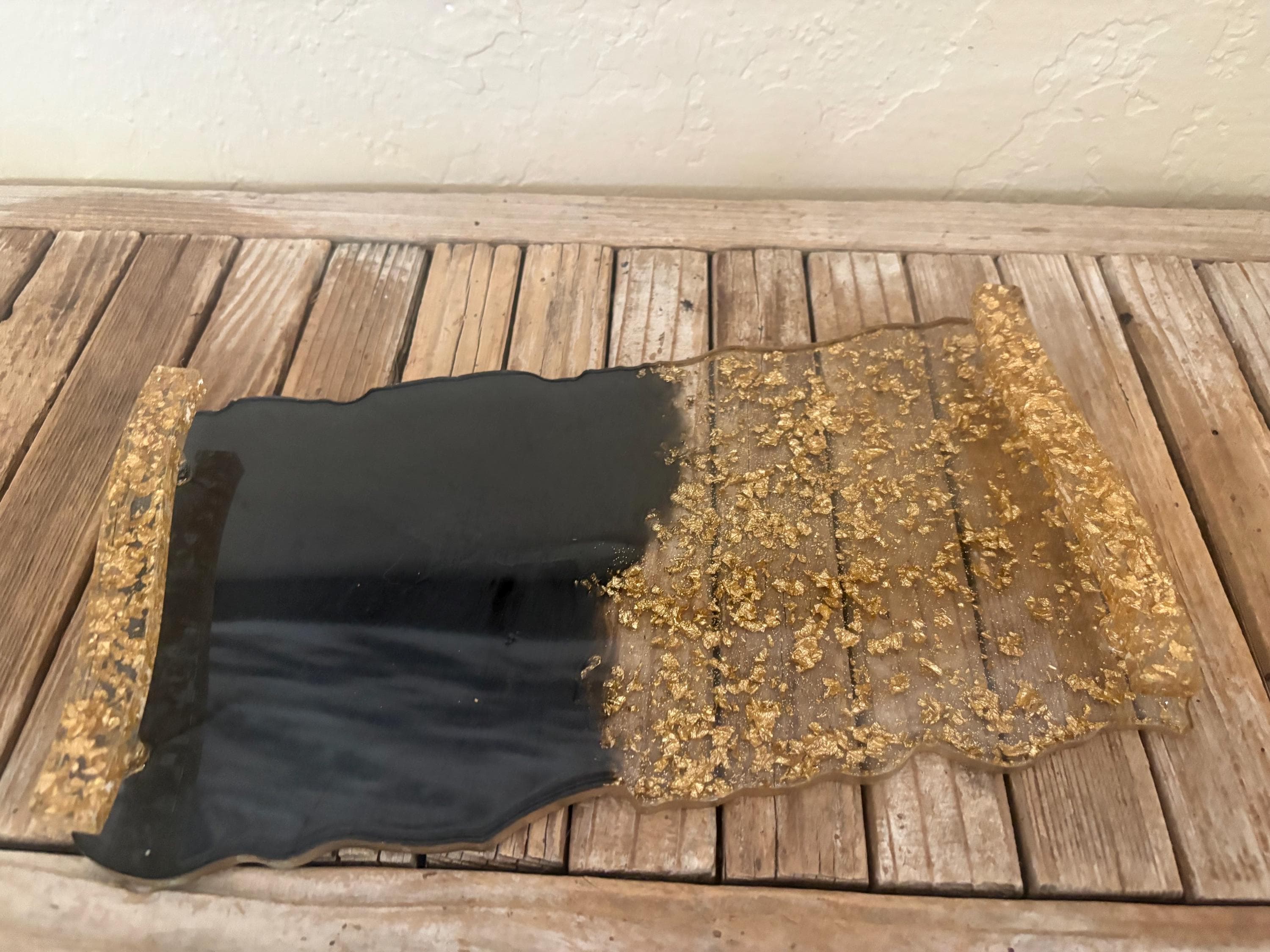 Vintage clear Acrylic Gold Glitter and Black Decorative Vanity Tray. In good vintage condition, normal wear due to age and use. The tray has surface scrapes and markings to it, please see picture. I believe this is acrylic, possibly plastic, however it is not marked. A beautiful, unique piece to add to a bathroom, kitchen or living area.