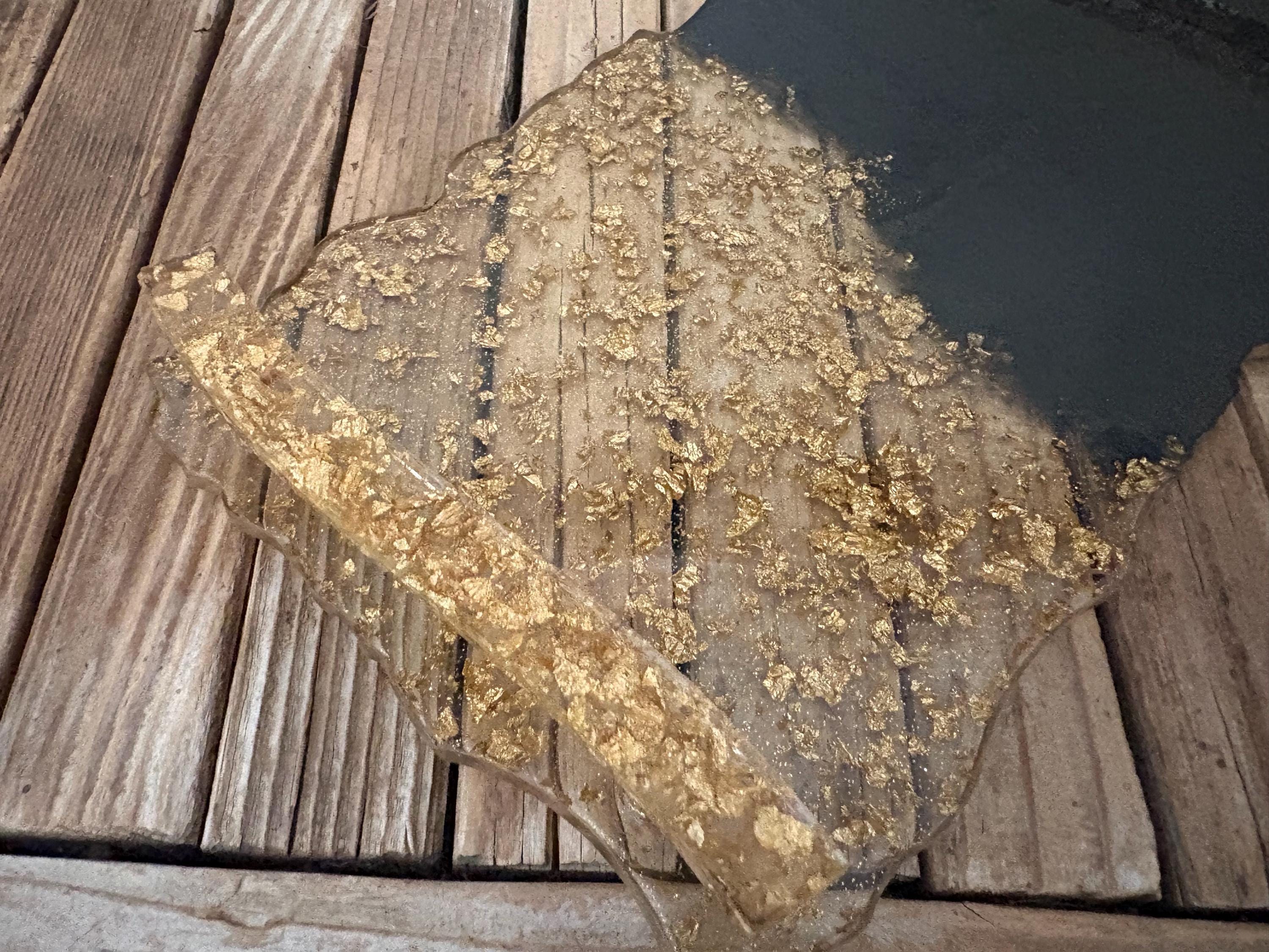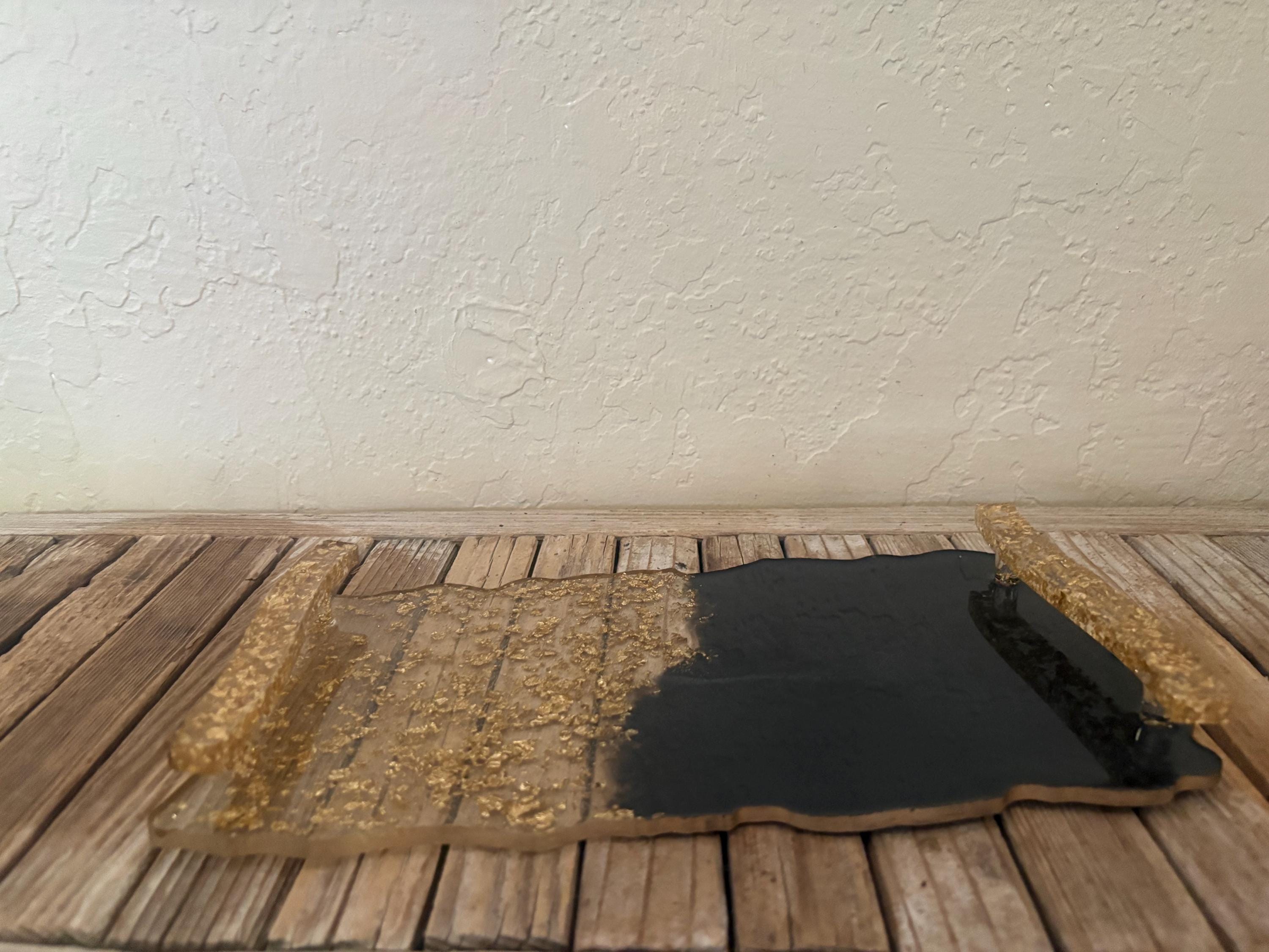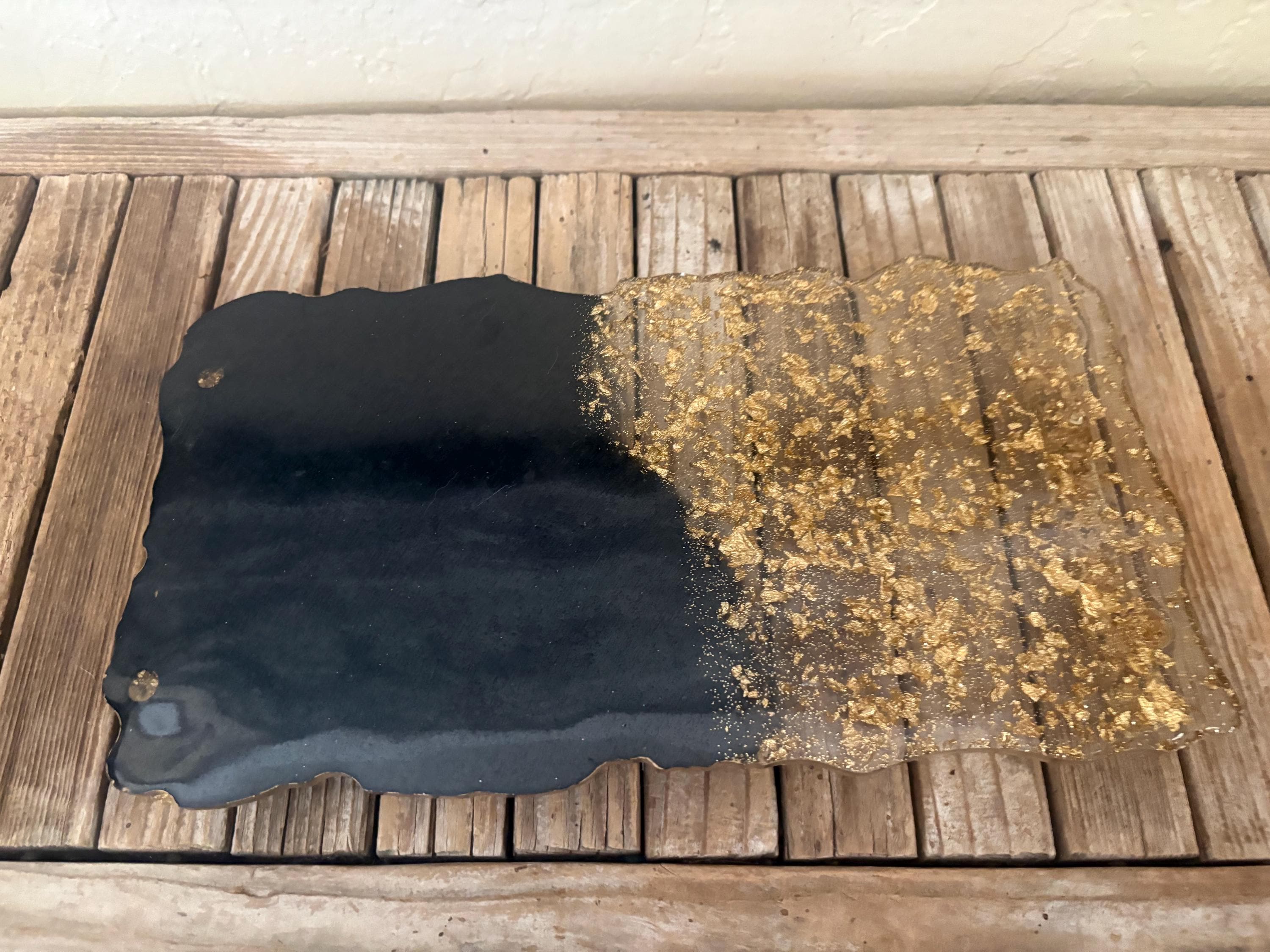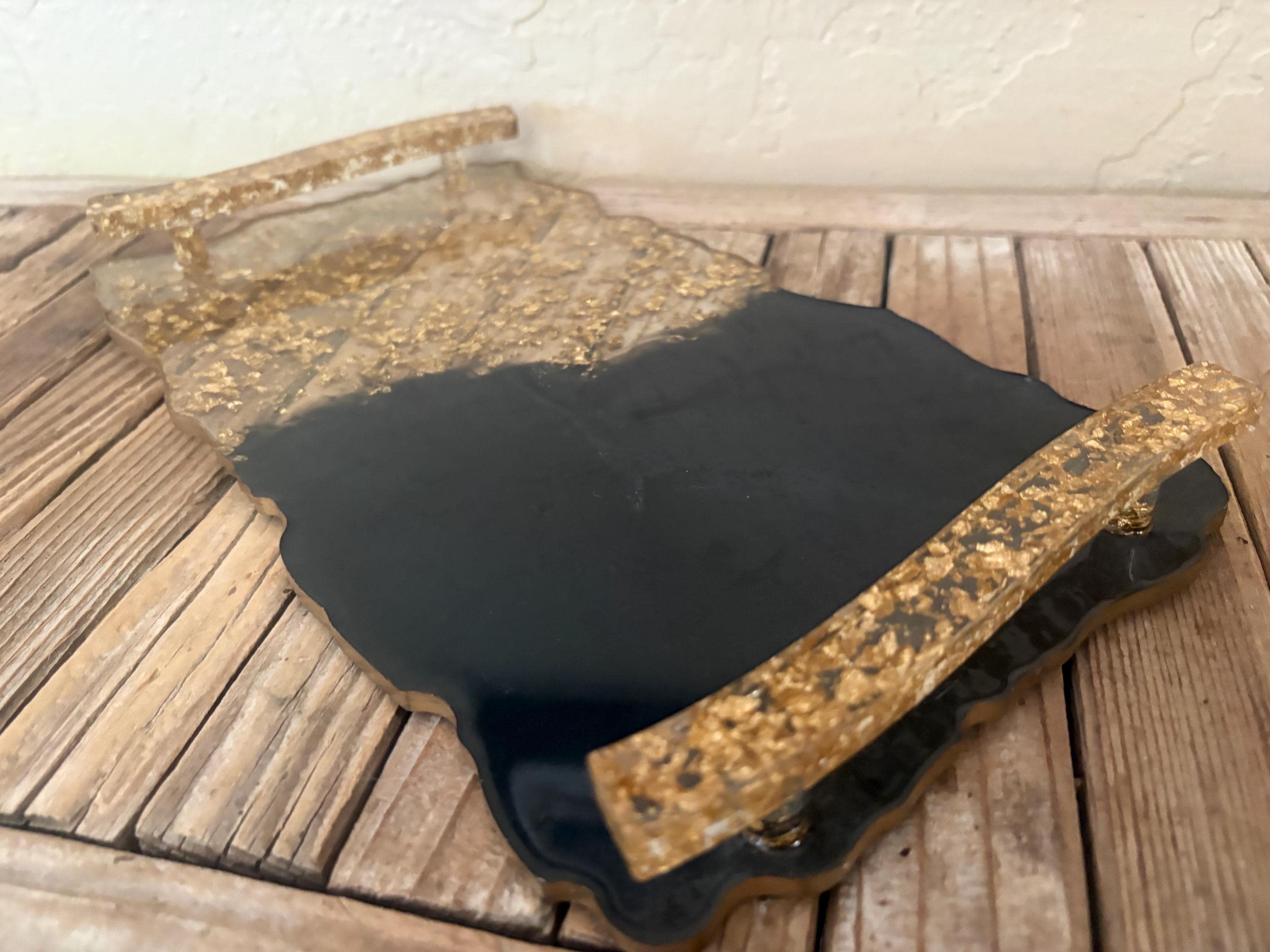 Vintage clear Acrylic Gold Glitter and Black Decorative Vanity Tray. In good vintage condition, normal wear due to age and use. The tray has surface scrapes and markings to it, please see picture. I believe this is acrylic, possibly plastic, however it is not marked. A beautiful, unique piece to add to a bathroom, kitchen or living area.