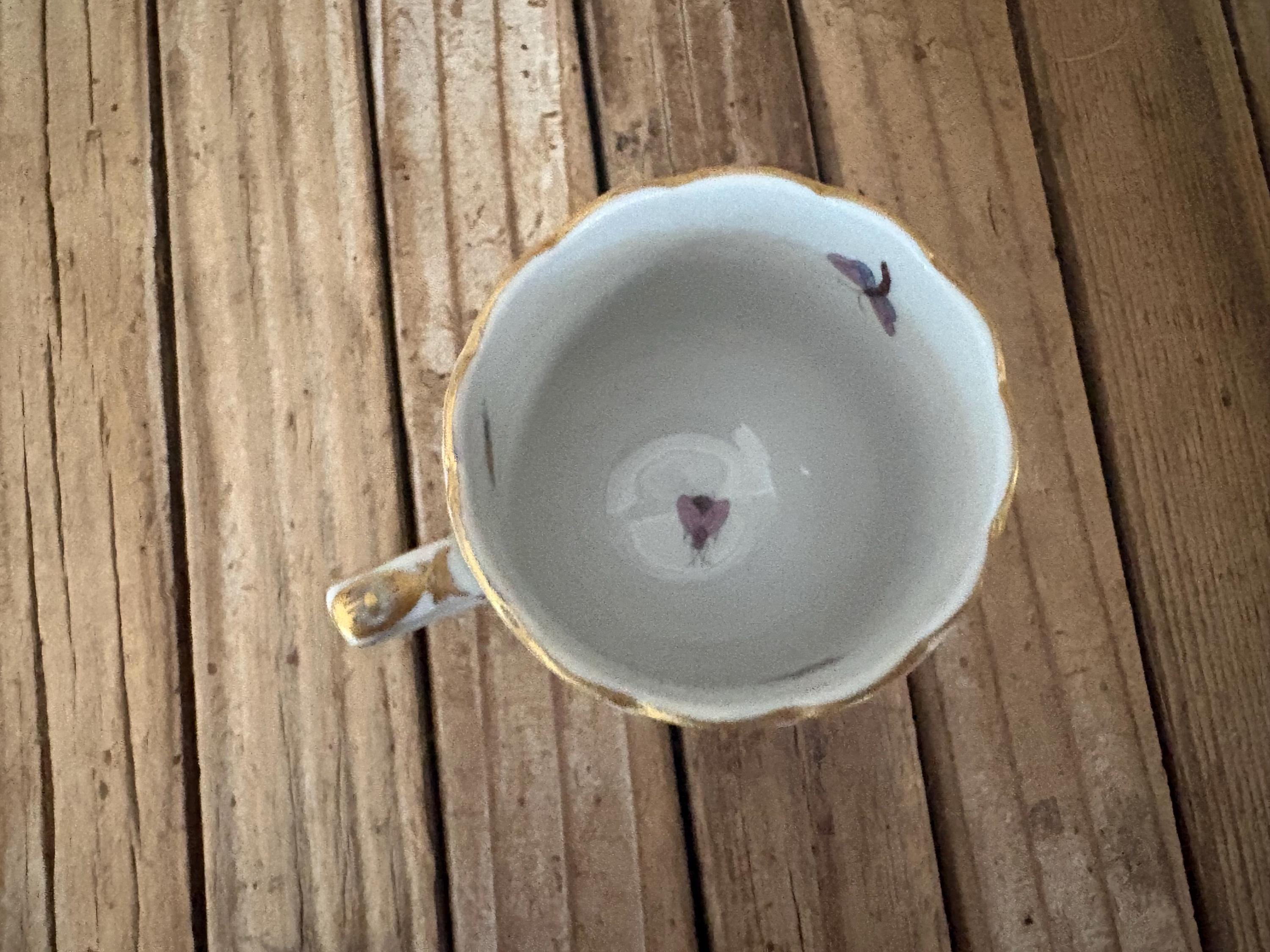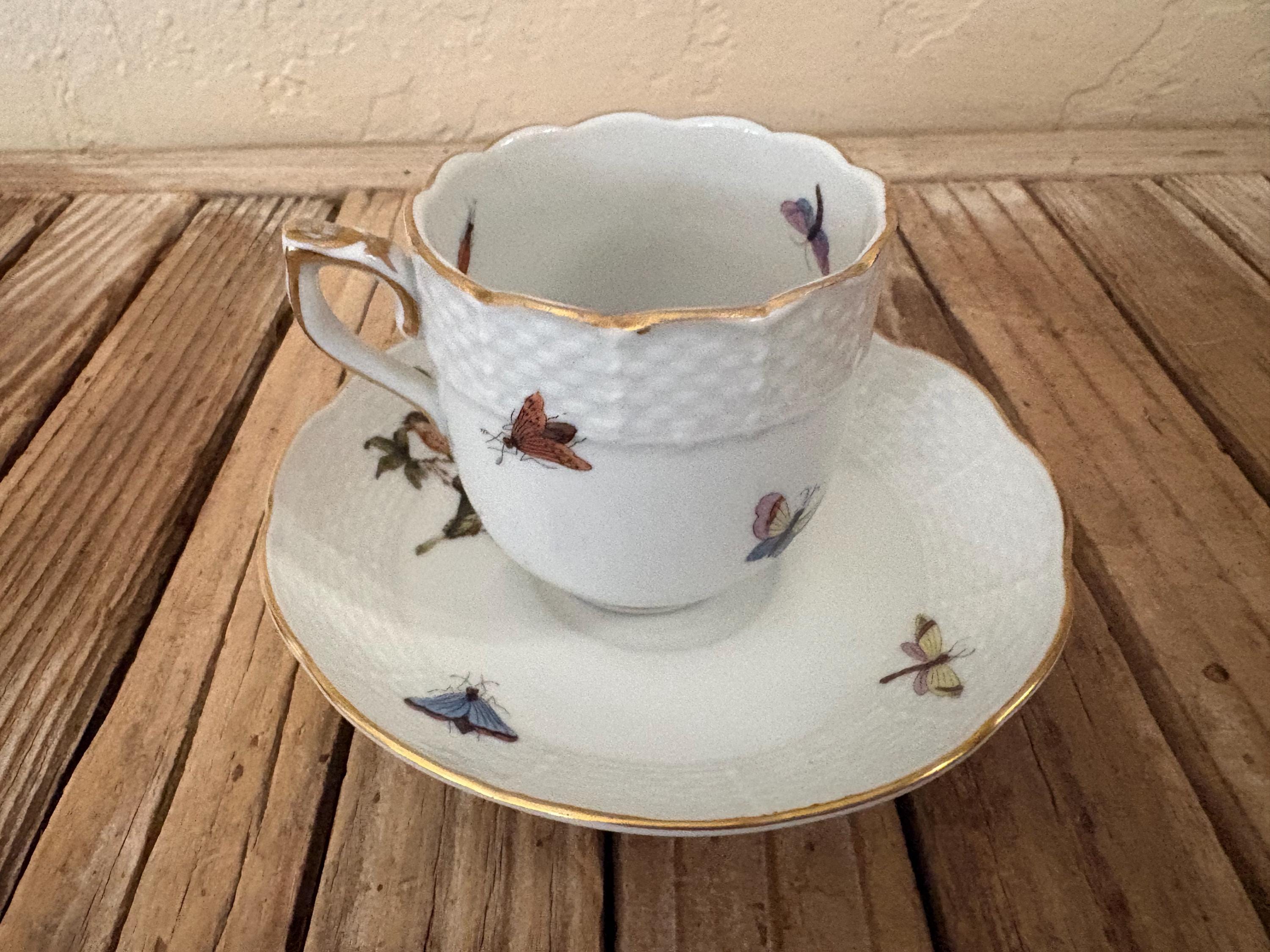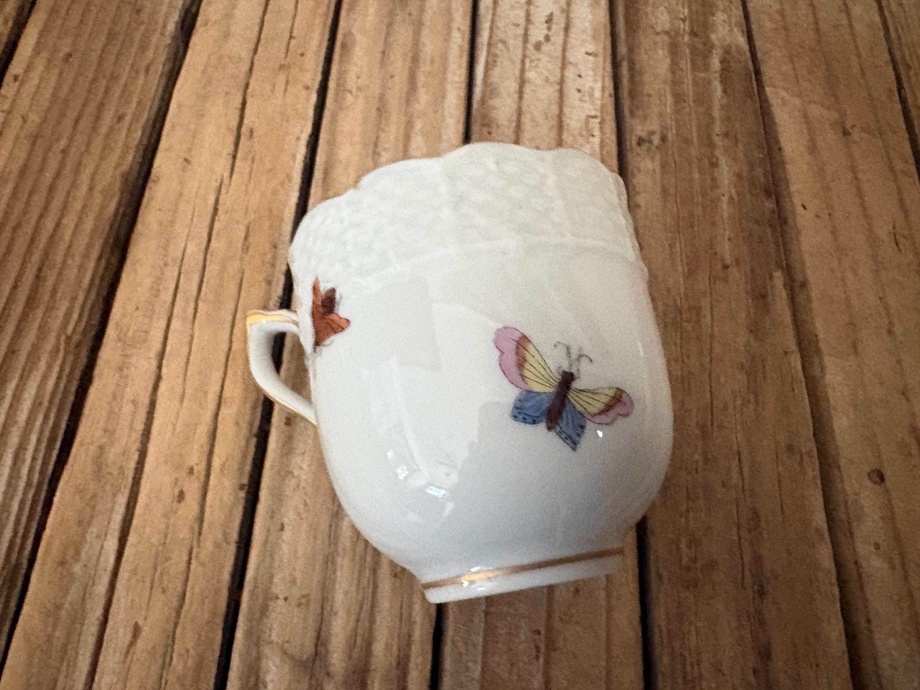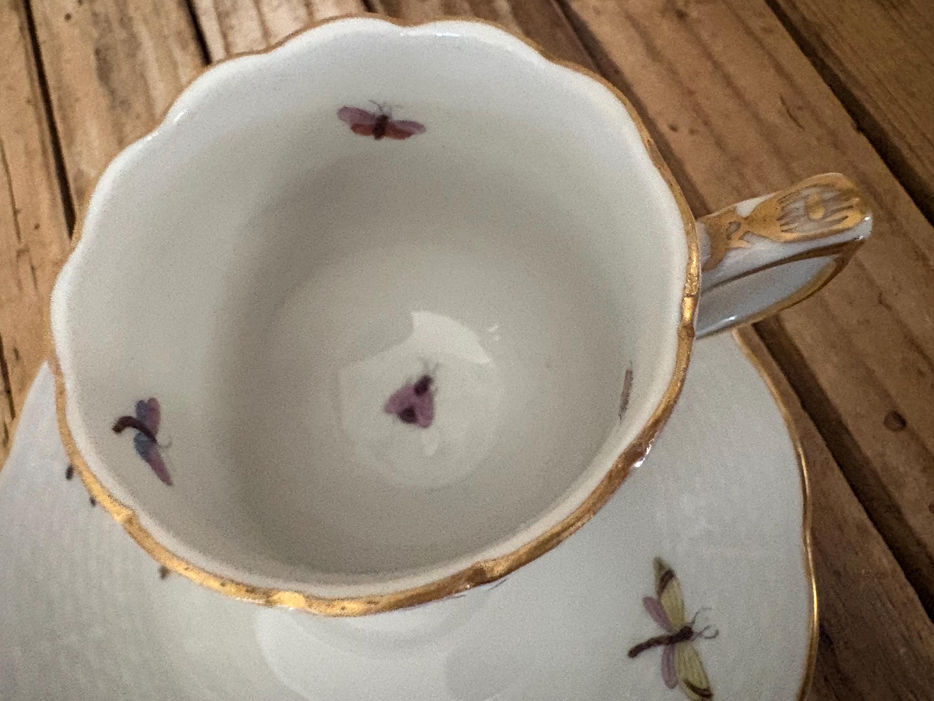 Antique Hungarian White gold Butterfly Bird Teacup and Saucer. In good condition, normal wear due to age and use. The cup and saucer have some fading to the gold detail, with no chips or cracks, please see pictures. A beautiful set for everyday use or to add to a collection.