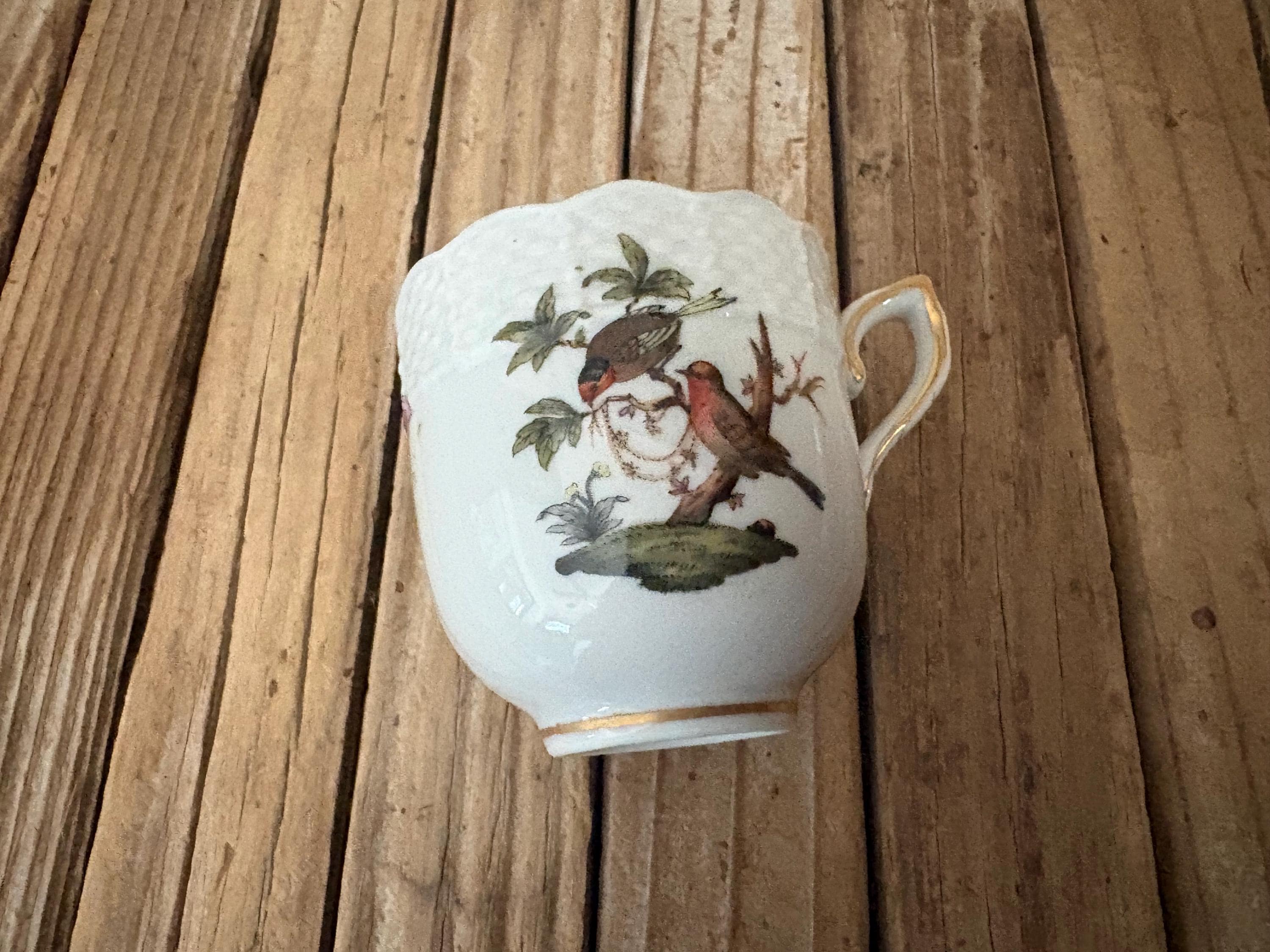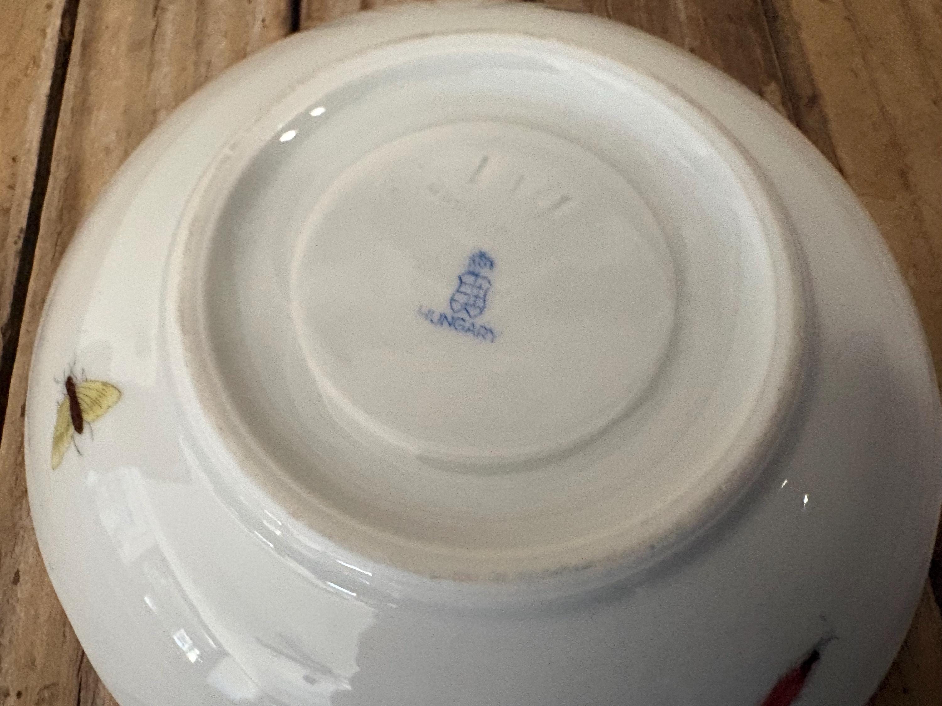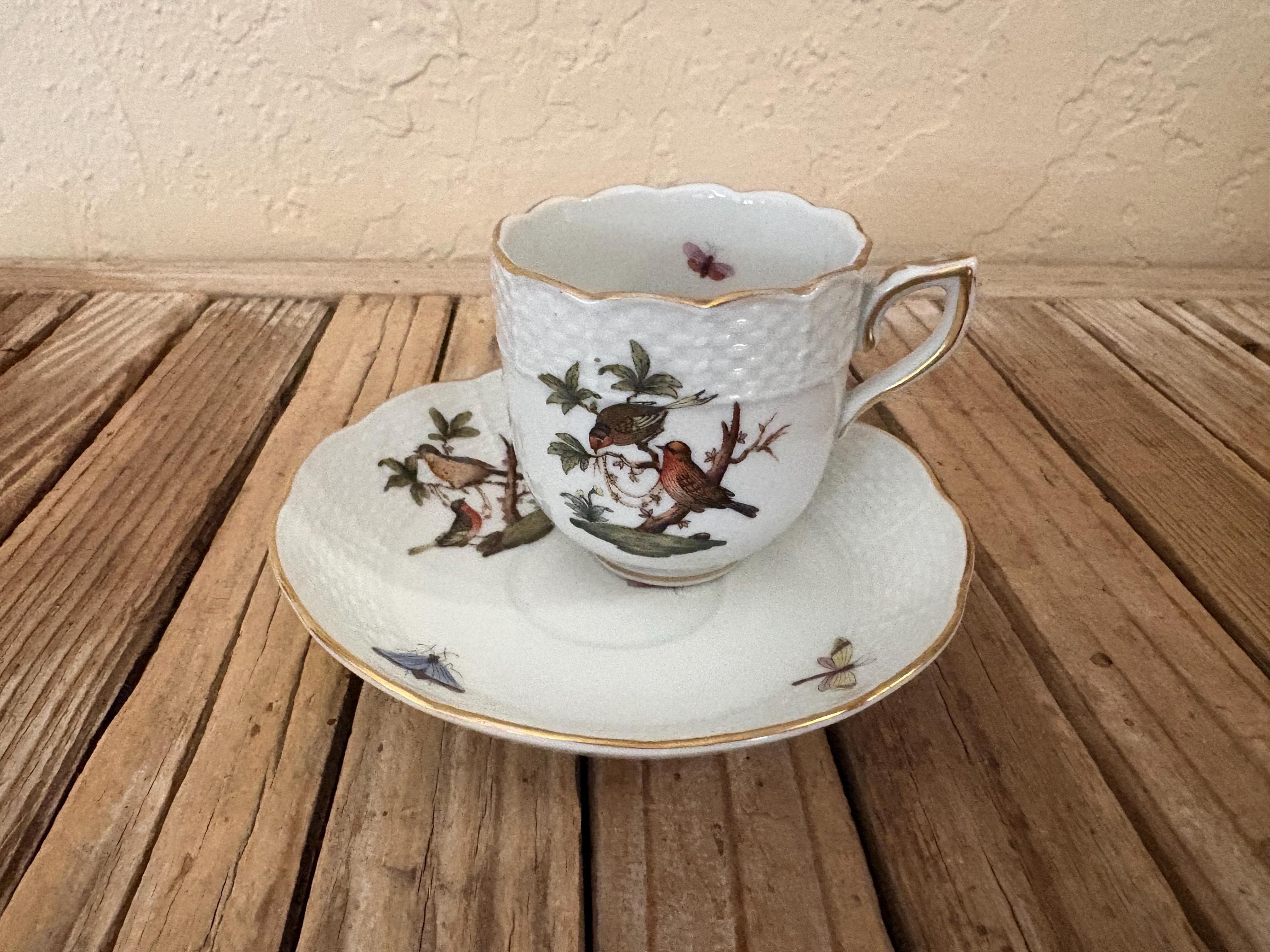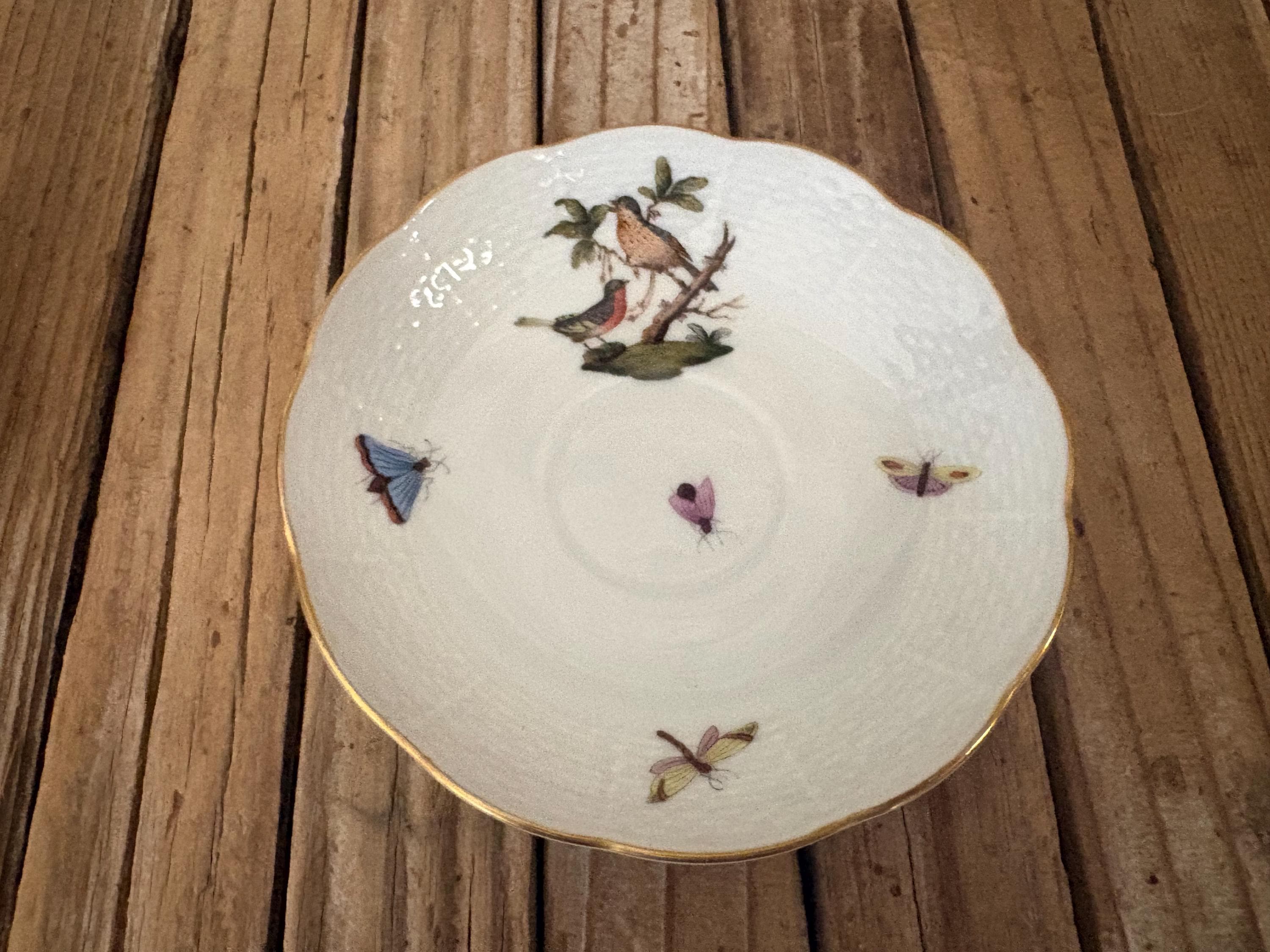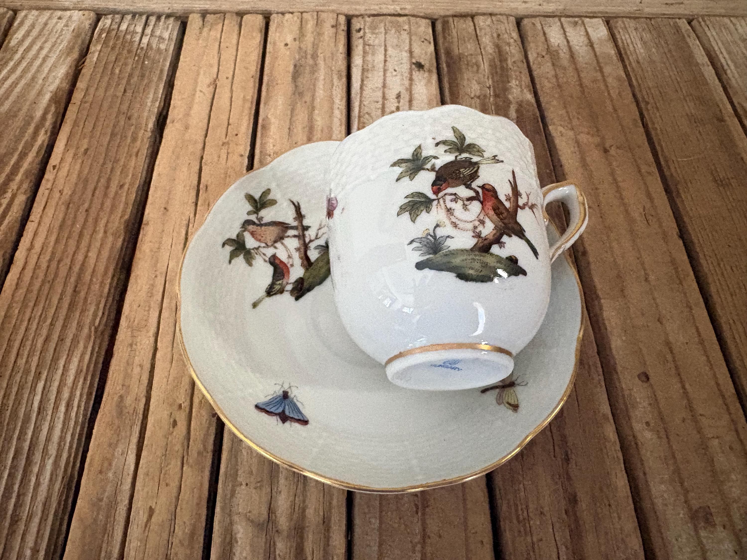 Antique Hungarian White gold Butterfly Bird Teacup and Saucer. In good condition, normal wear due to age and use. The cup and saucer have some fading to the gold detail, with no chips or cracks, please see pictures. A beautiful set for everyday use or to add to a collection.