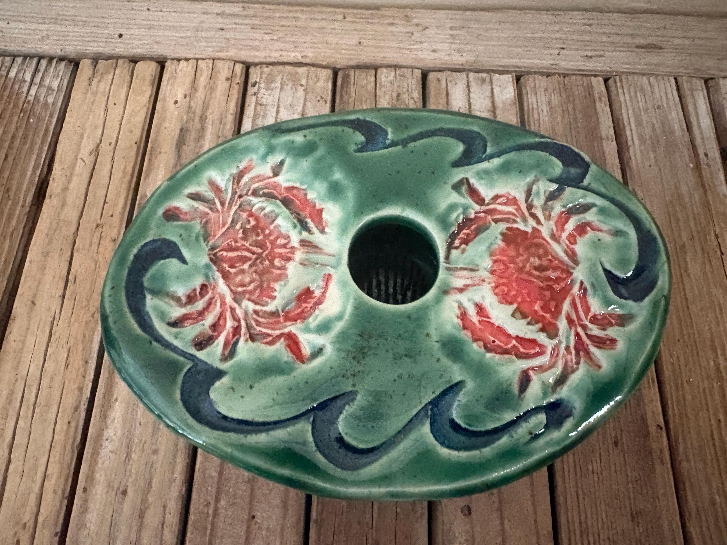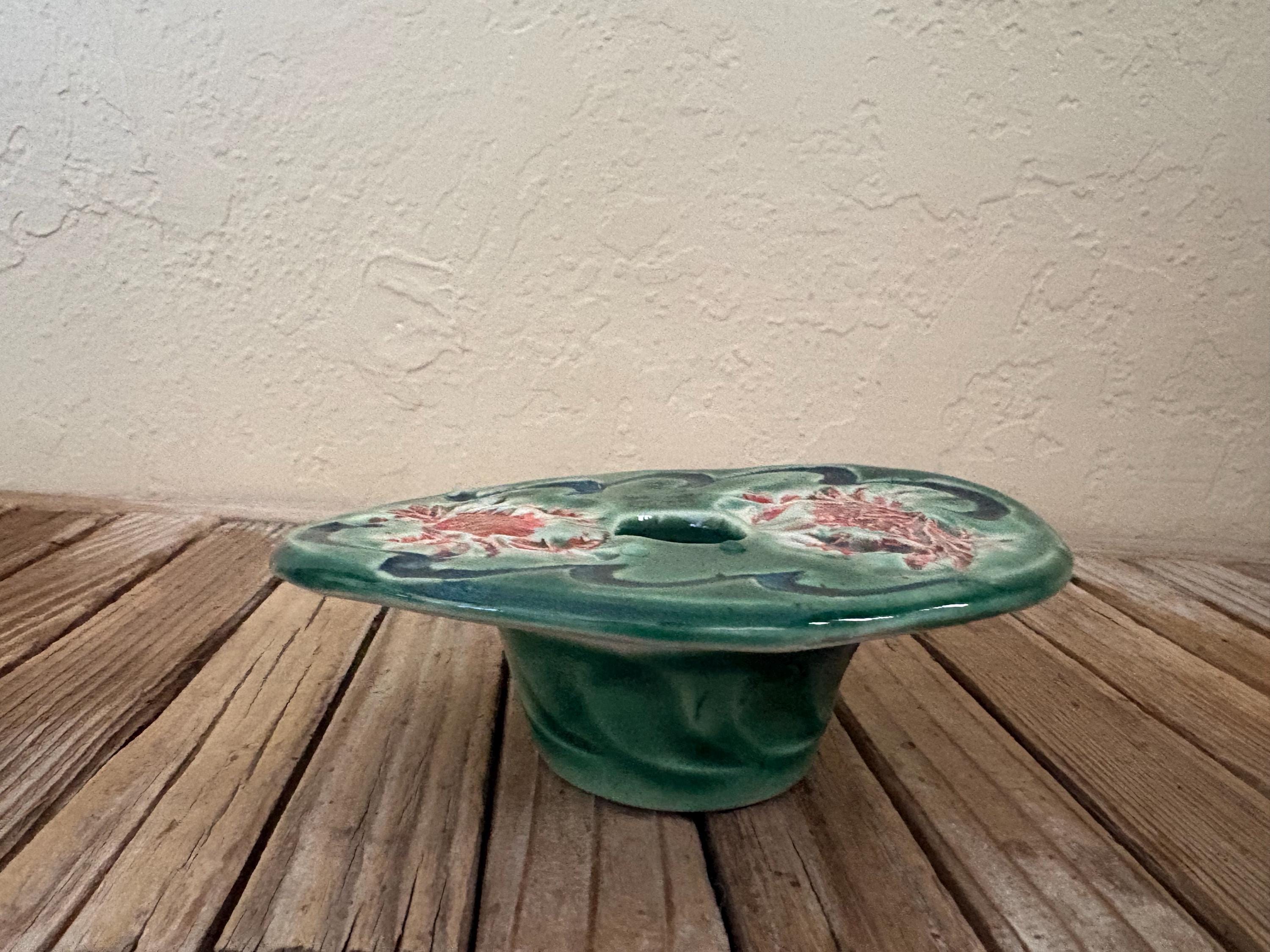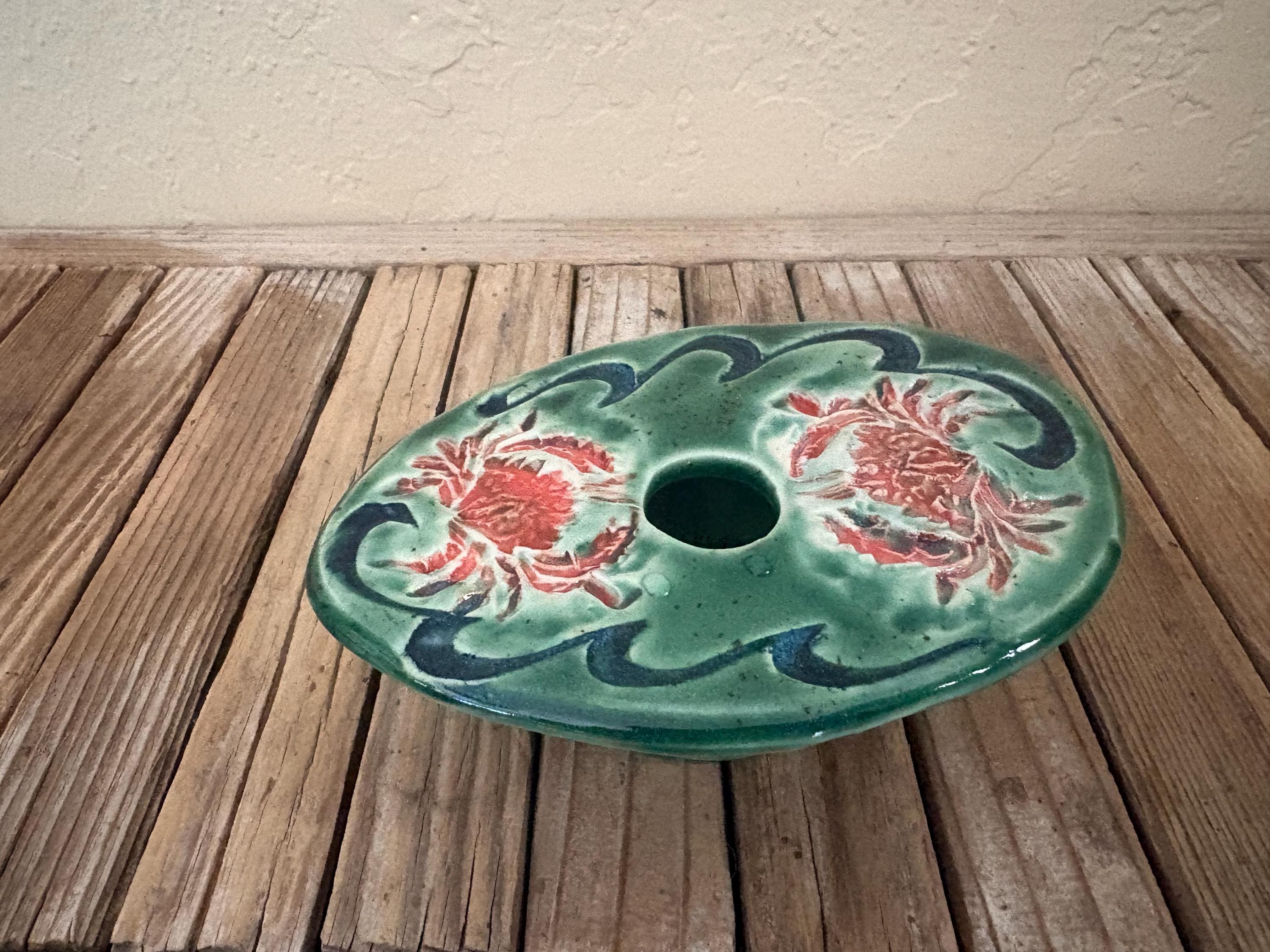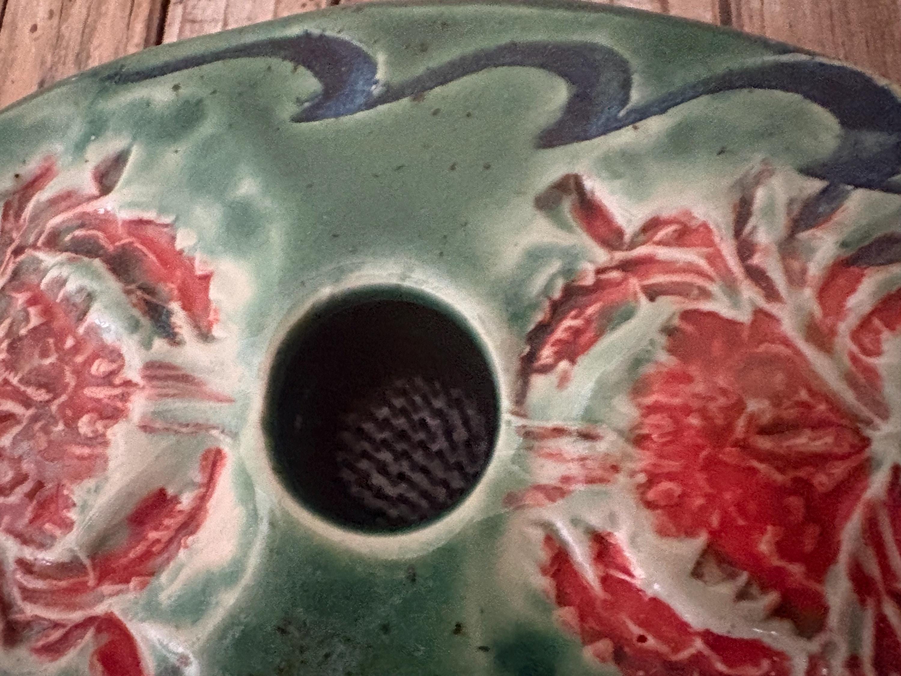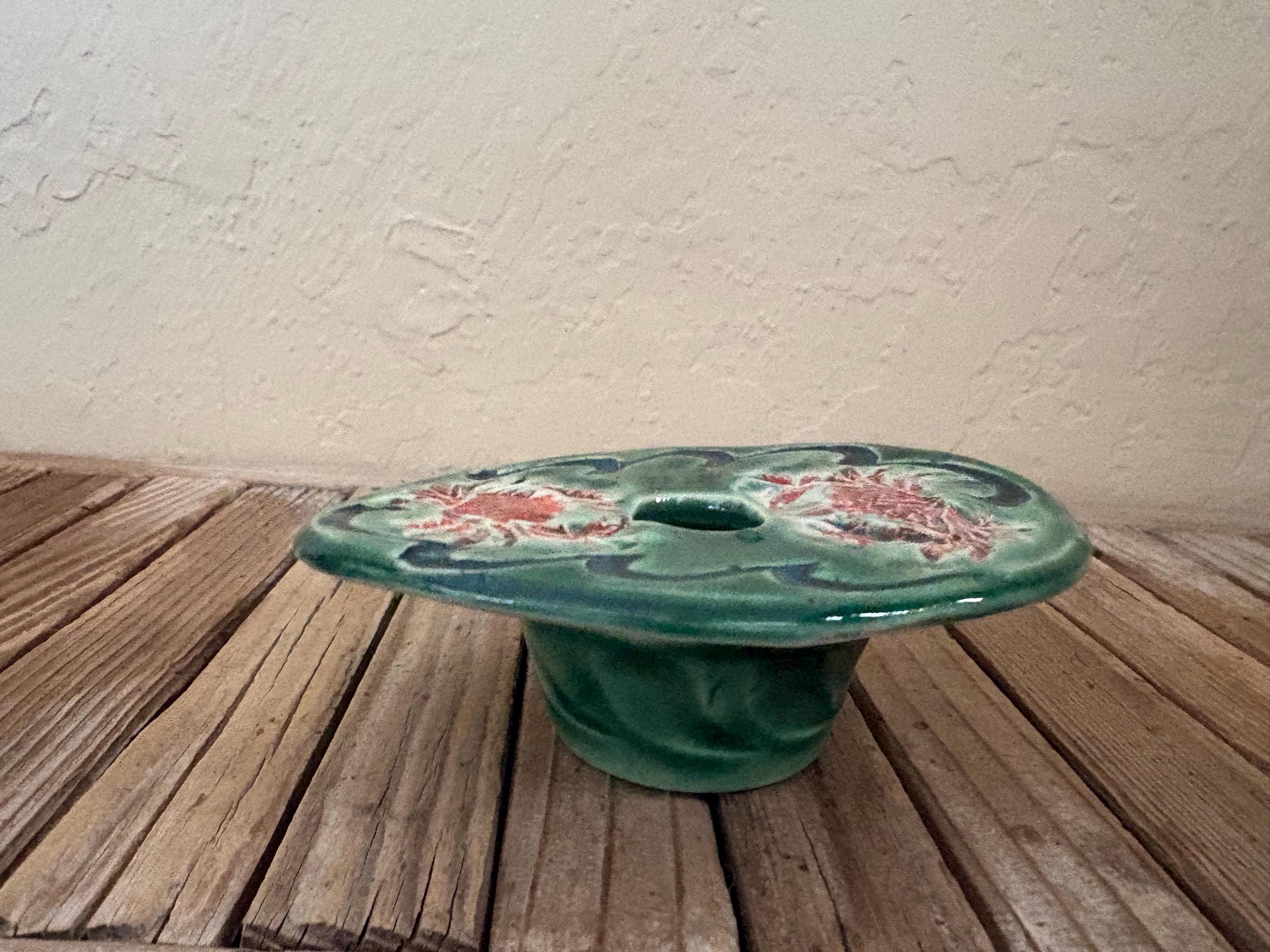 Vintage green and red floral art pottery with metal flower frog. In great vintage condition, normal wear due to age and use. The piece has no chips or cracks, please see pictures. A great unique piece to display special items.