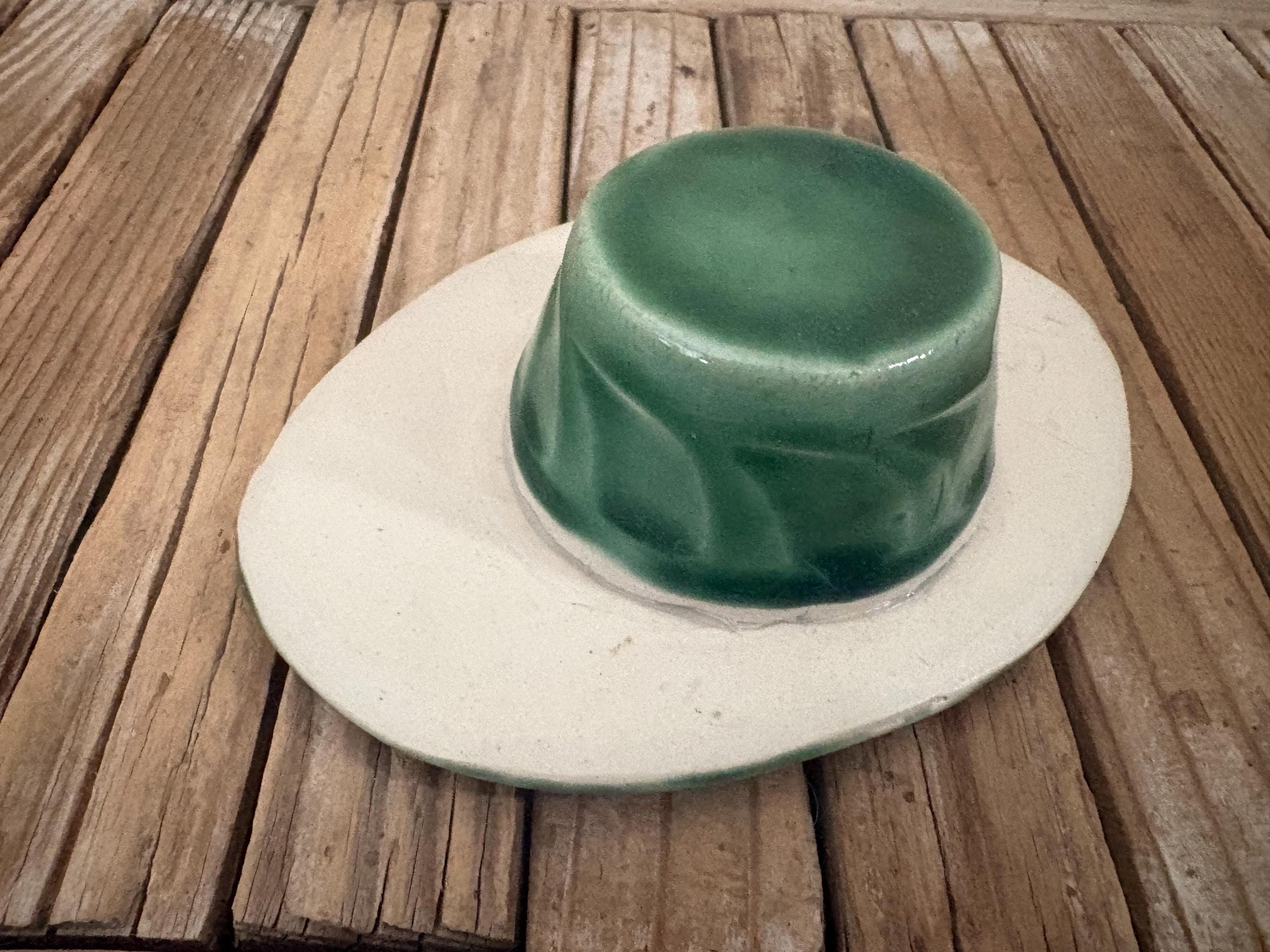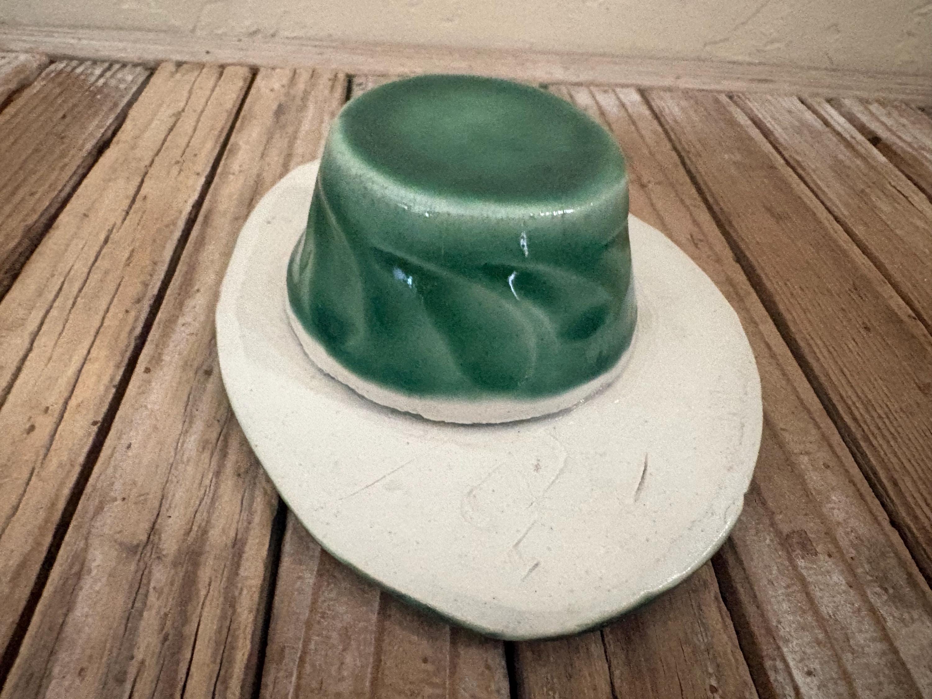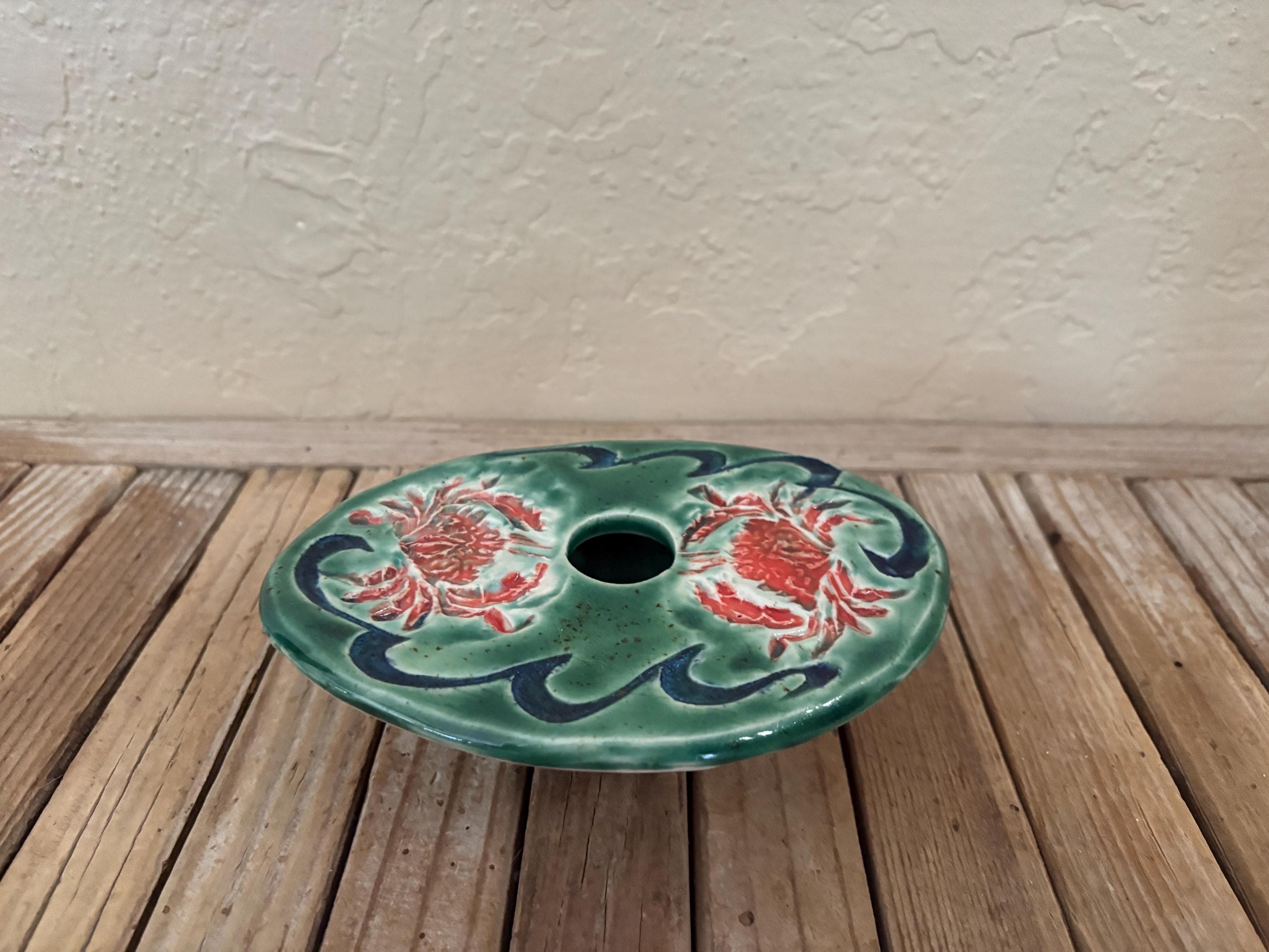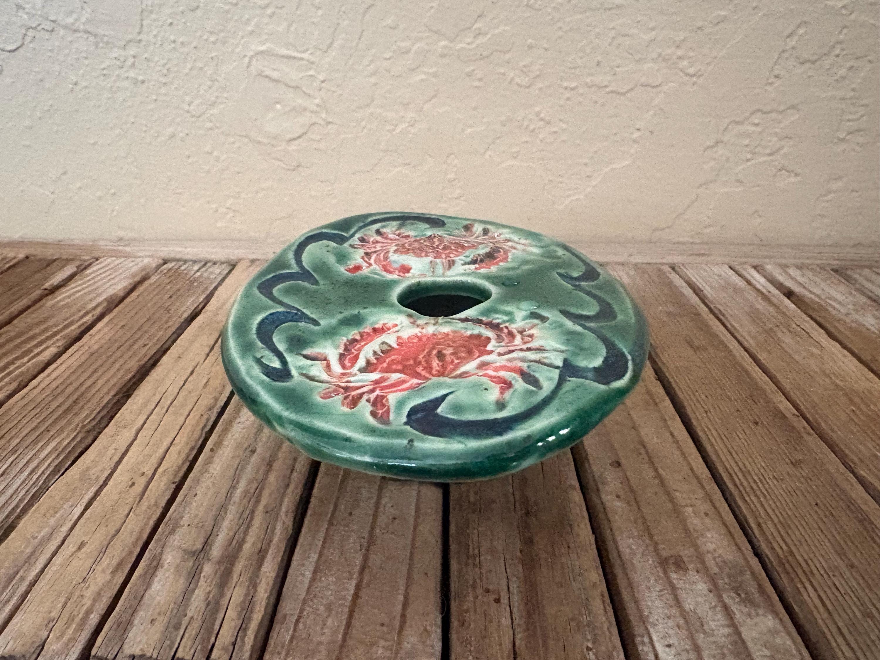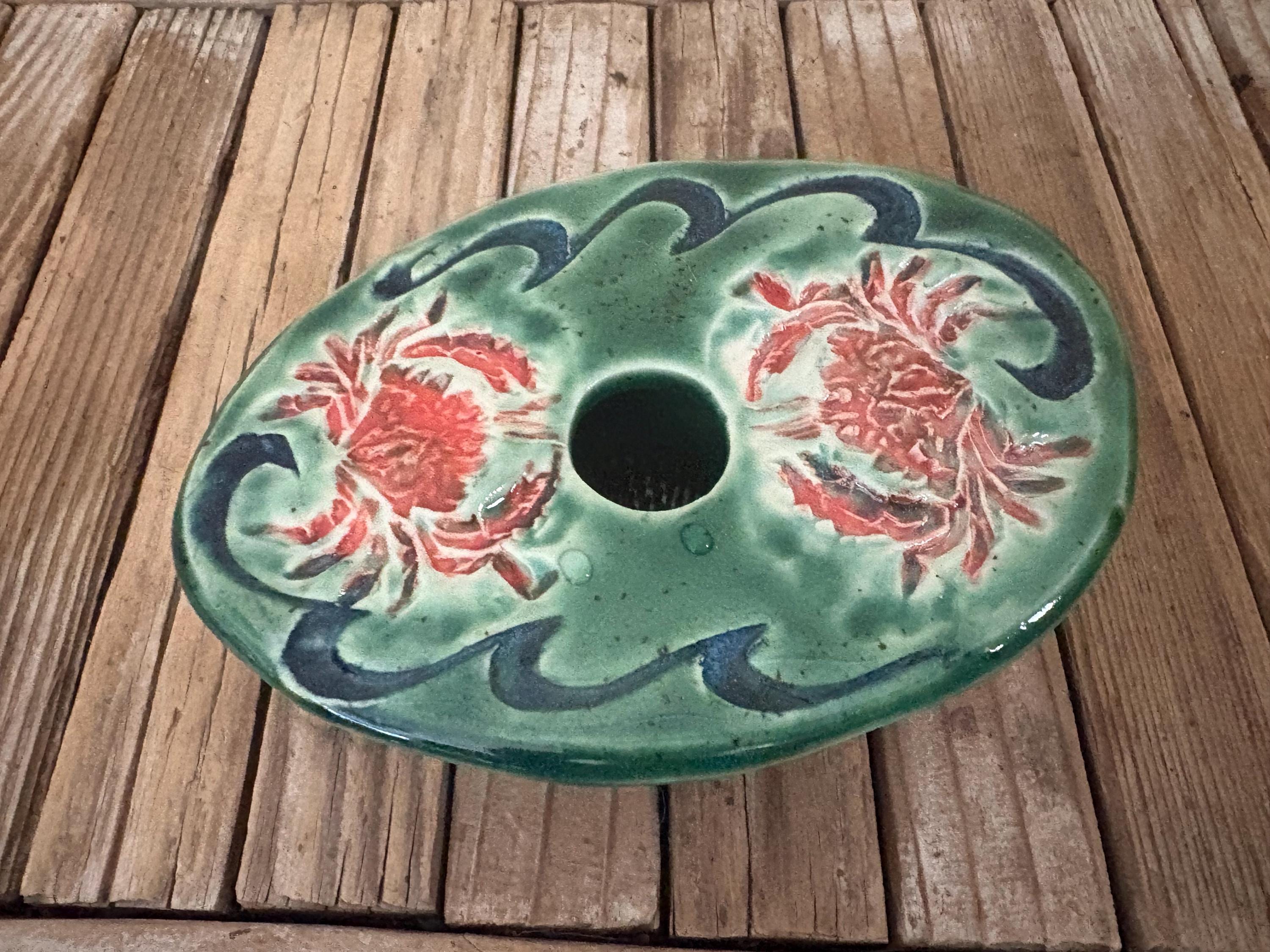 Vintage green and red floral art pottery with metal flower frog. In great vintage condition, normal wear due to age and use. The piece has no chips or cracks, please see pictures. A great unique piece to display special items.