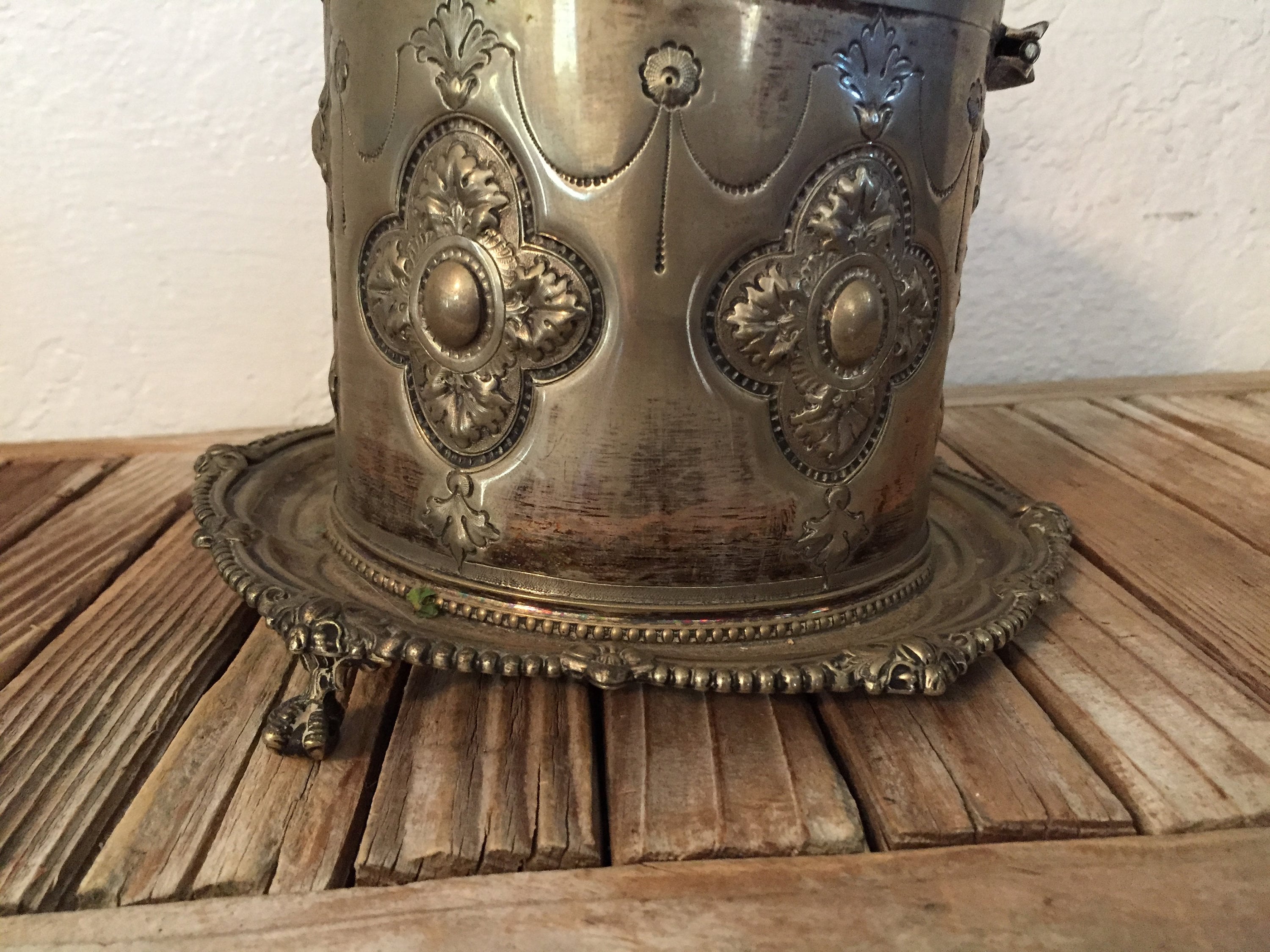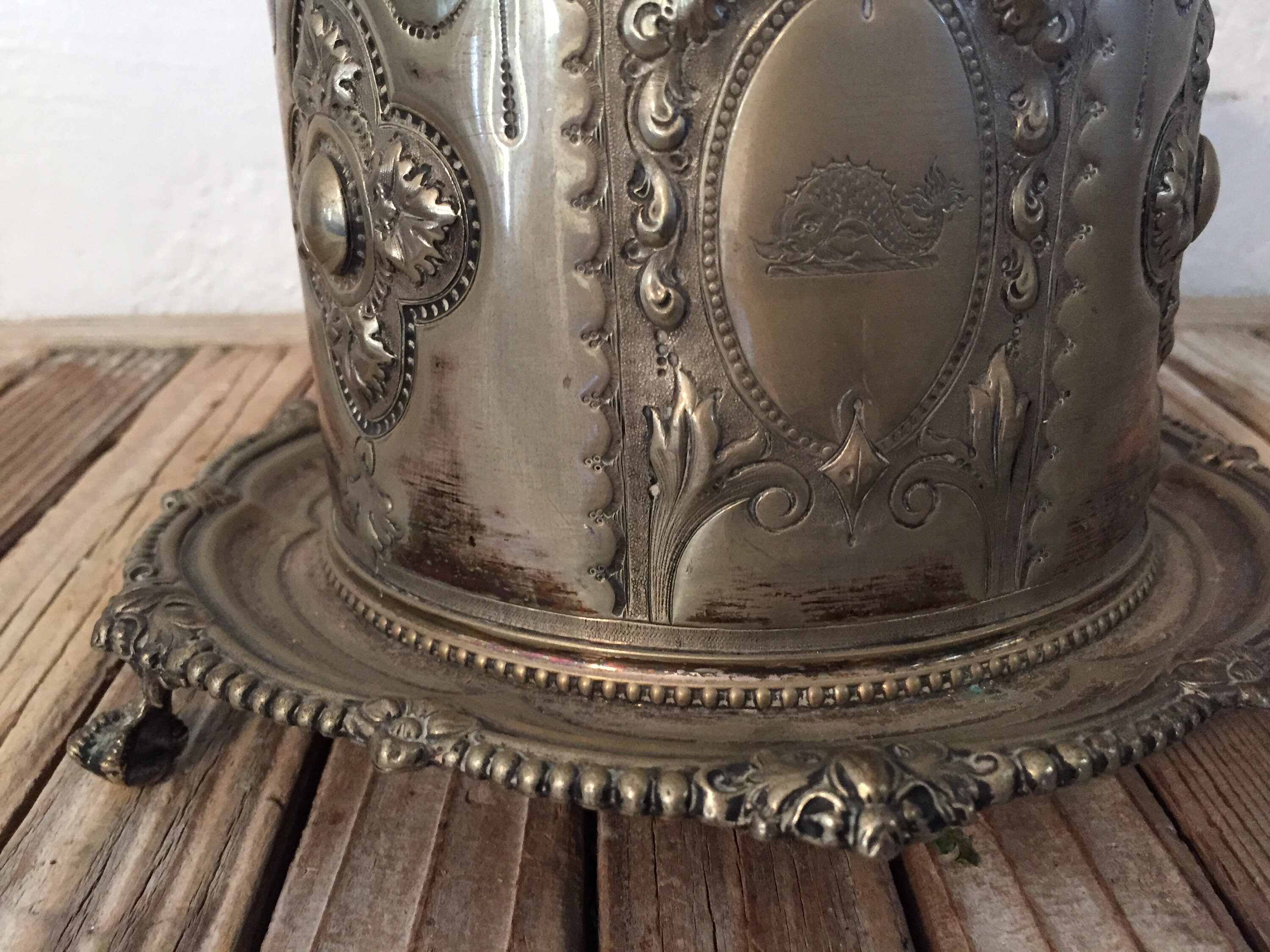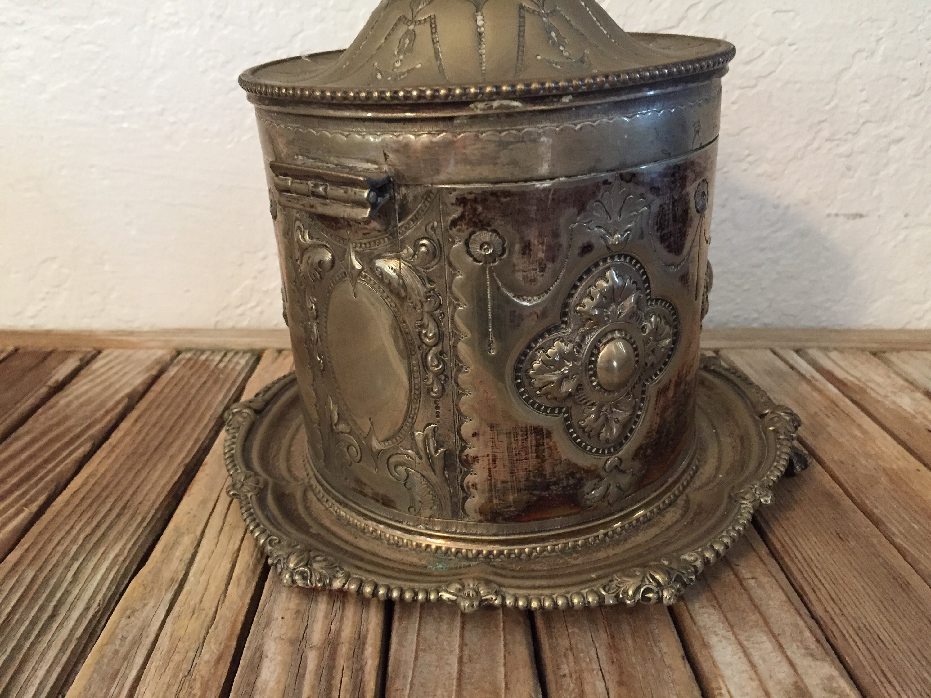 Antique silver embossed canister. In great aged condition, normal wear due to age and use. The piece has misc. scrapes, discolorations and aged patina to it, as well as some rust peaking through. The piece has ball and claw feet and one is missing, which puts it as an angle, please see pictures. A beautiful hard to find piece to add to any home or to give as a gift.