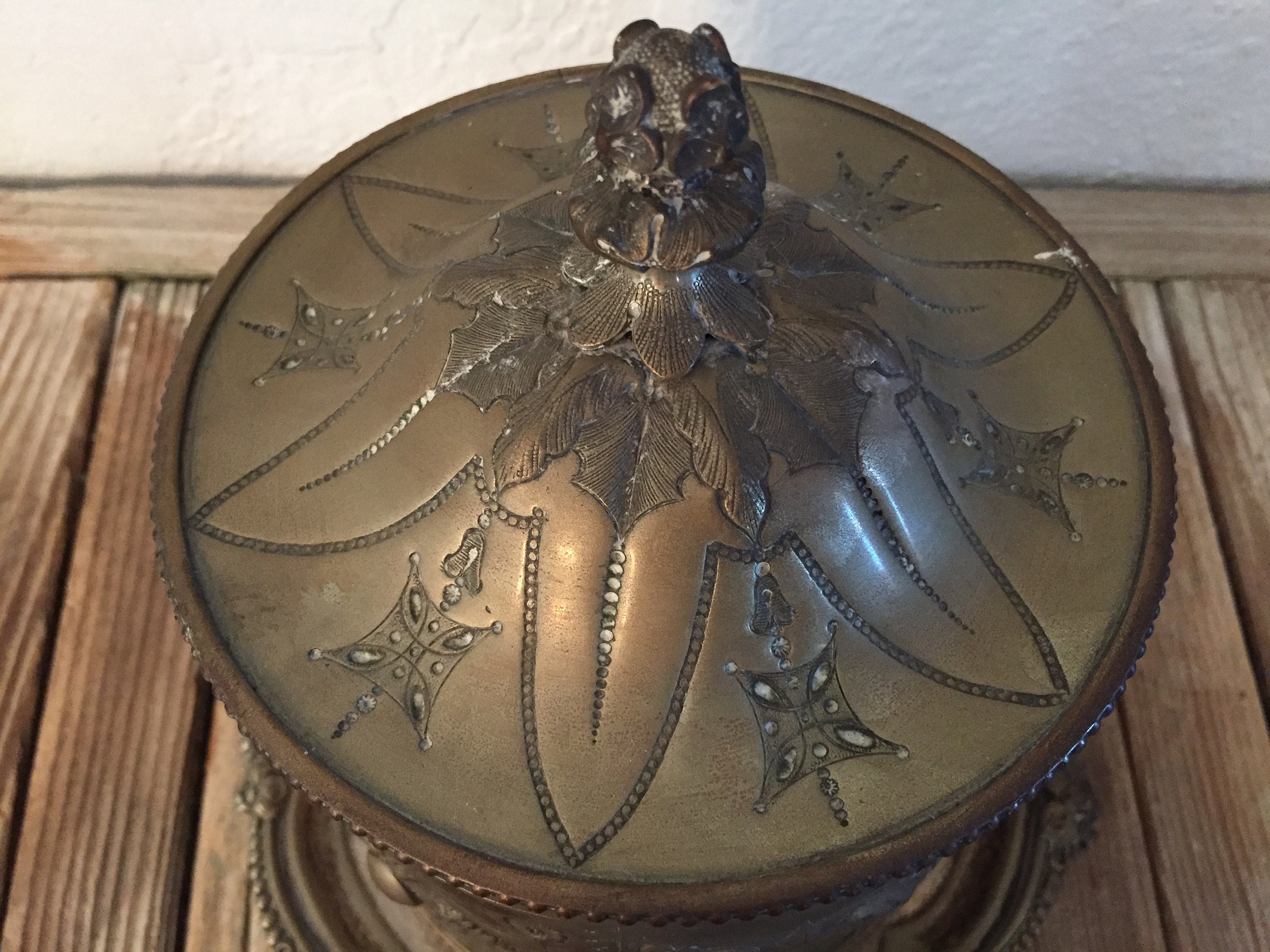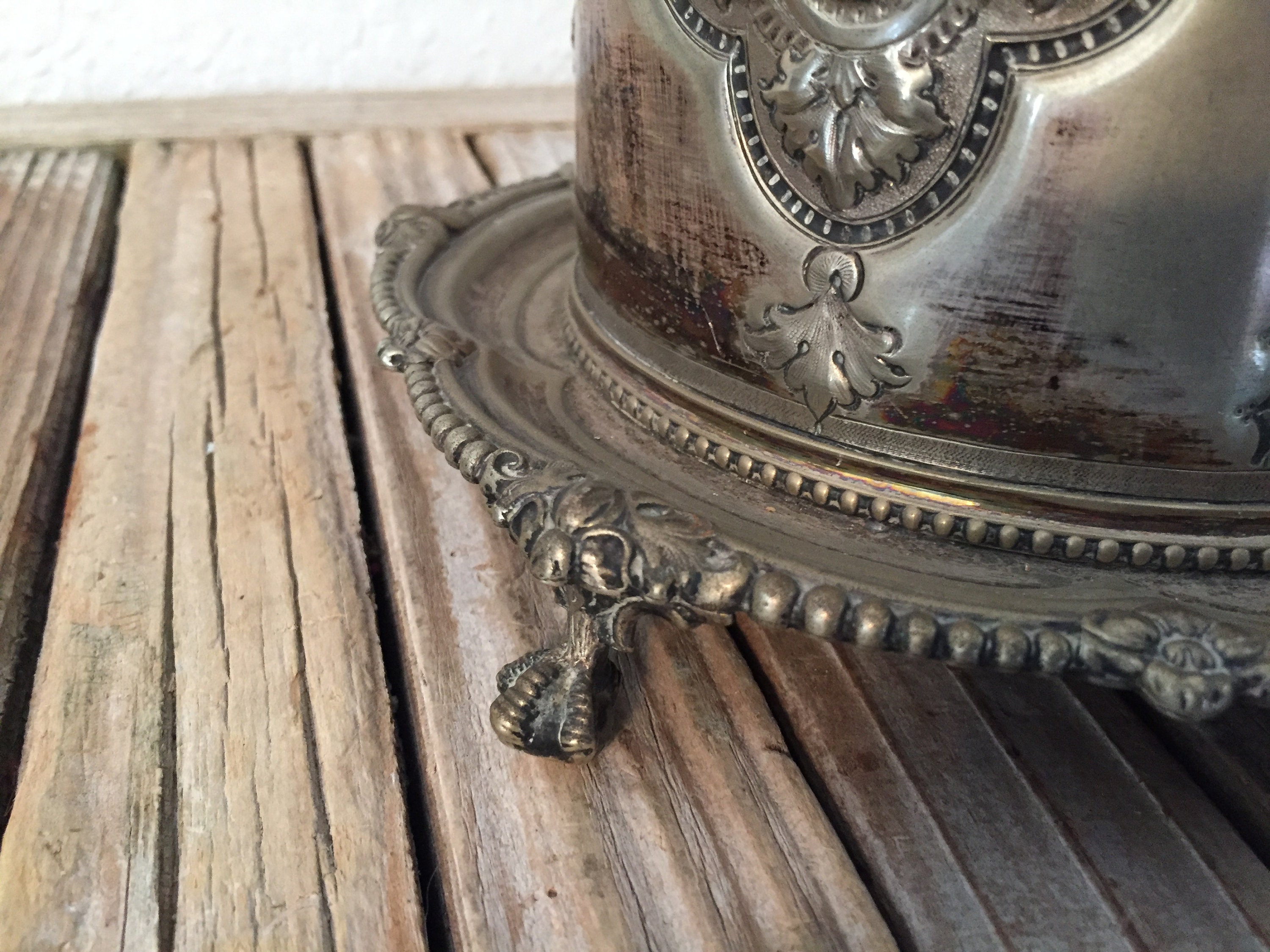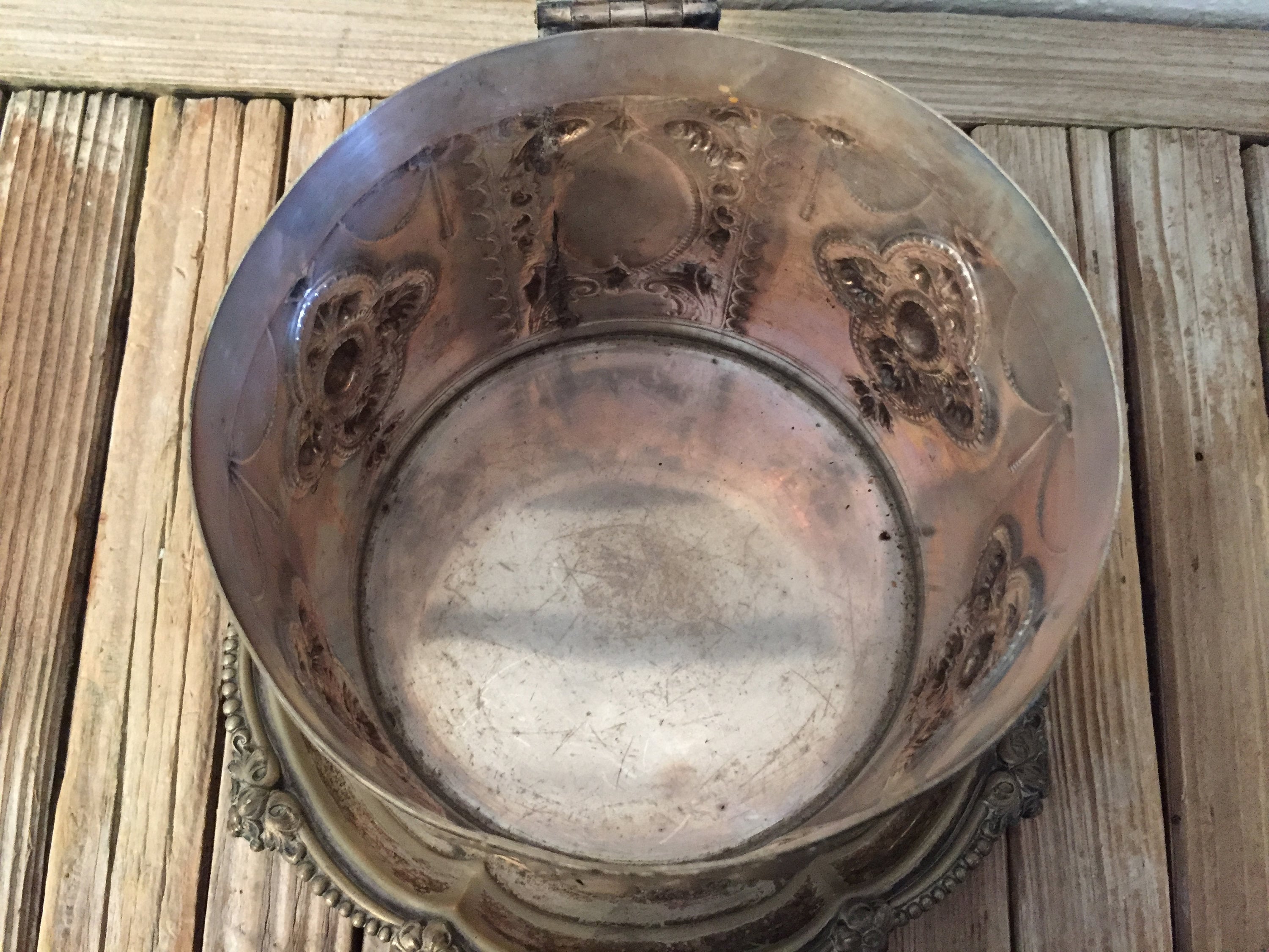 Antique silver embossed canister. In great aged condition, normal wear due to age and use. The piece has misc. scrapes, discolorations and aged patina to it, as well as some rust peaking through. The piece has ball and claw feet and one is missing, which puts it as an angle, please see pictures. A beautiful hard to find piece to add to any home or to give as a gift.