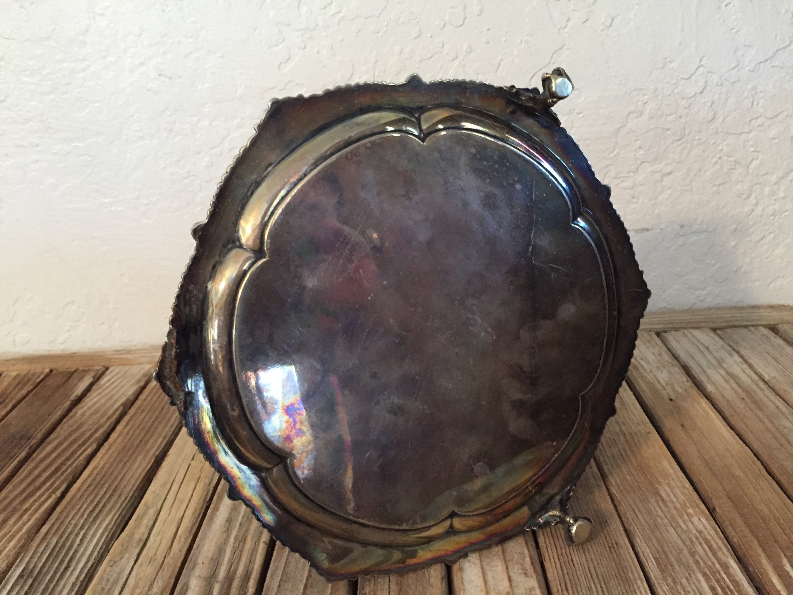 This piece is not marked and I'm not sure what the material. It appears to be silver or plate but looks brass in other areas.