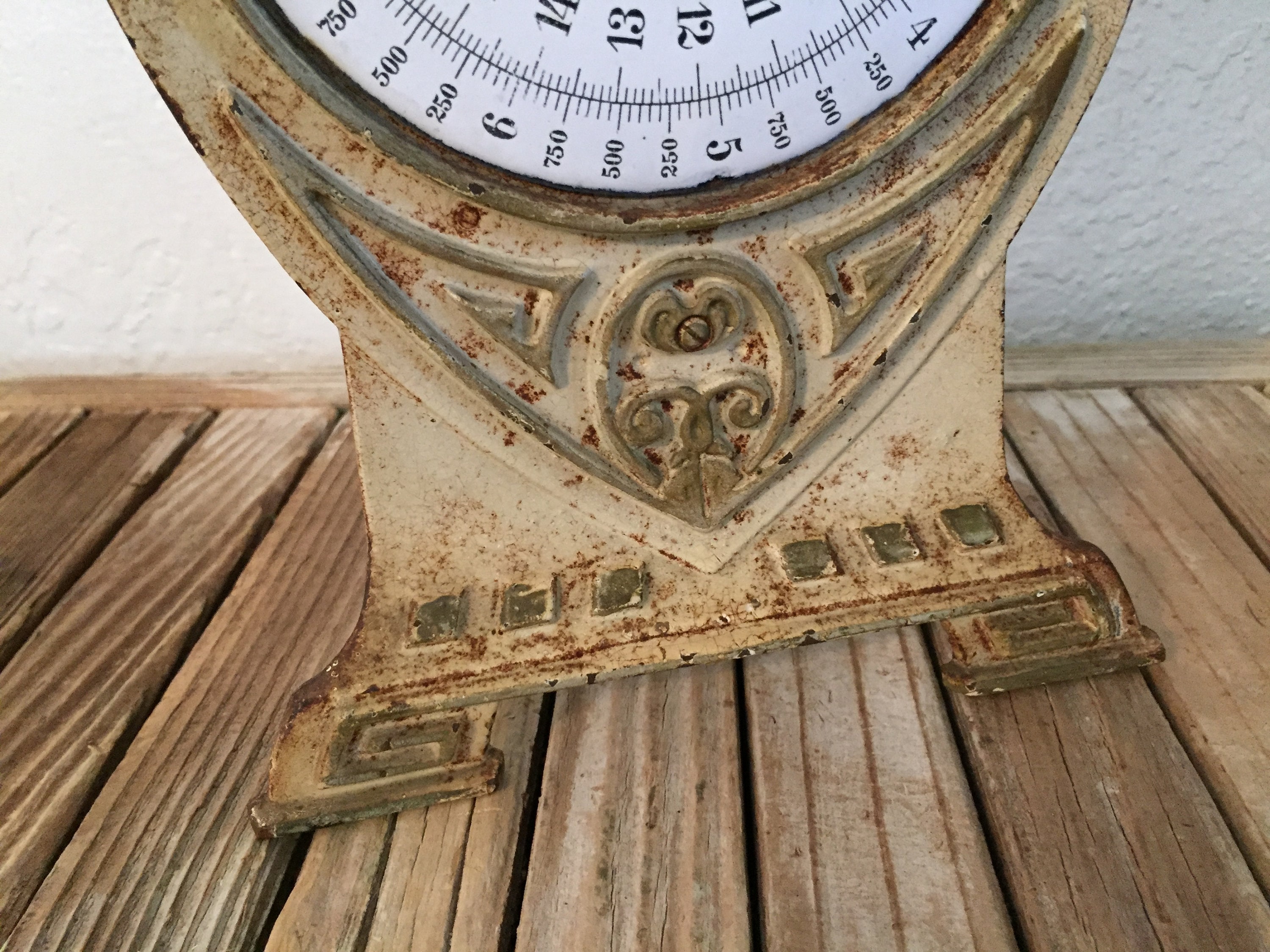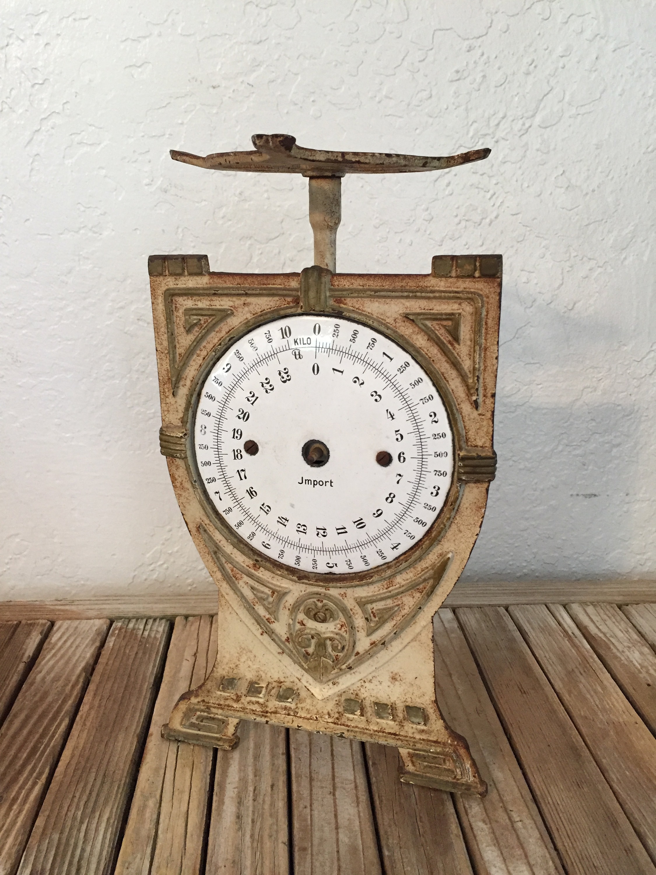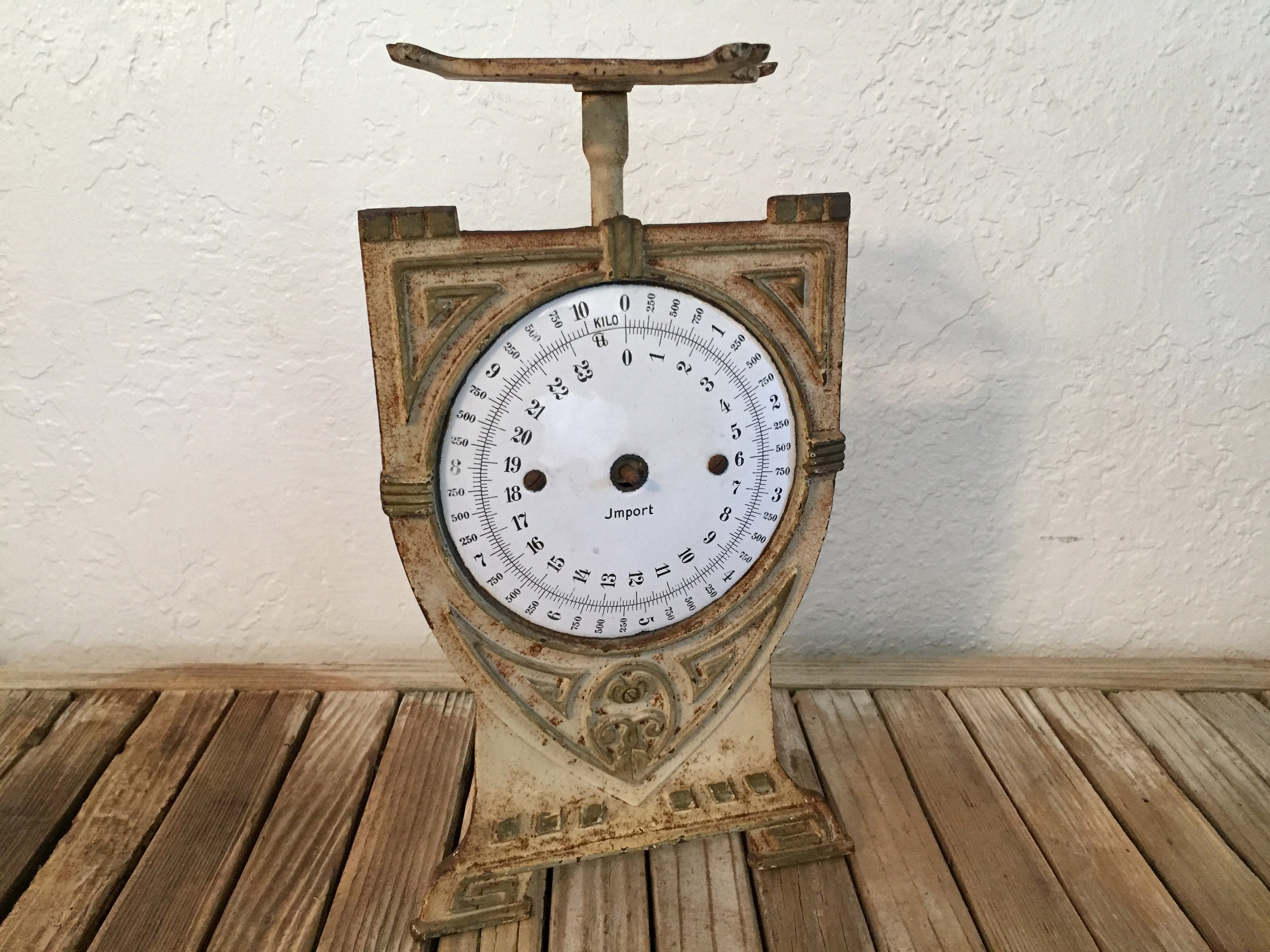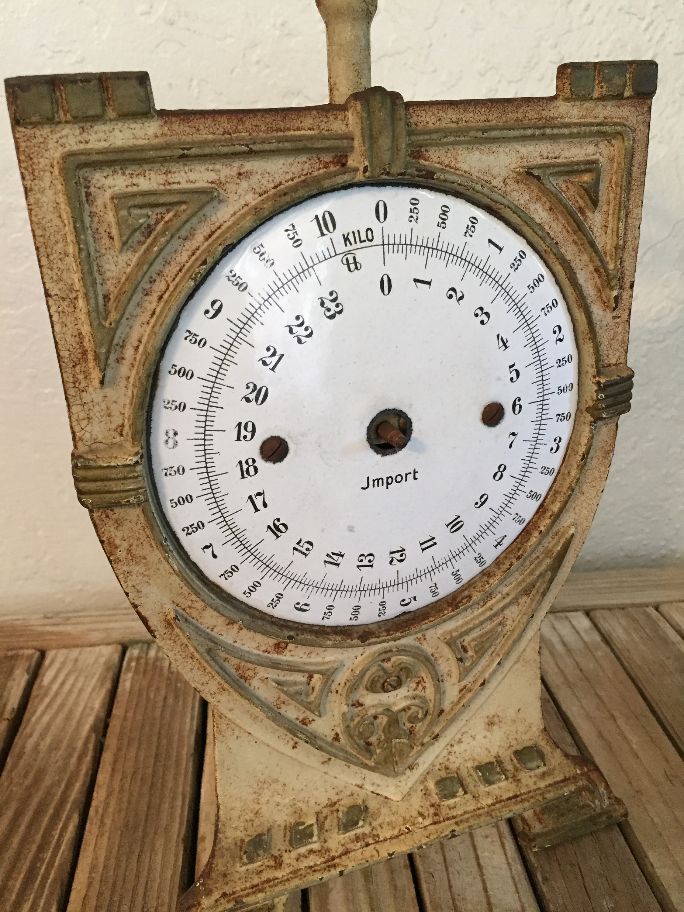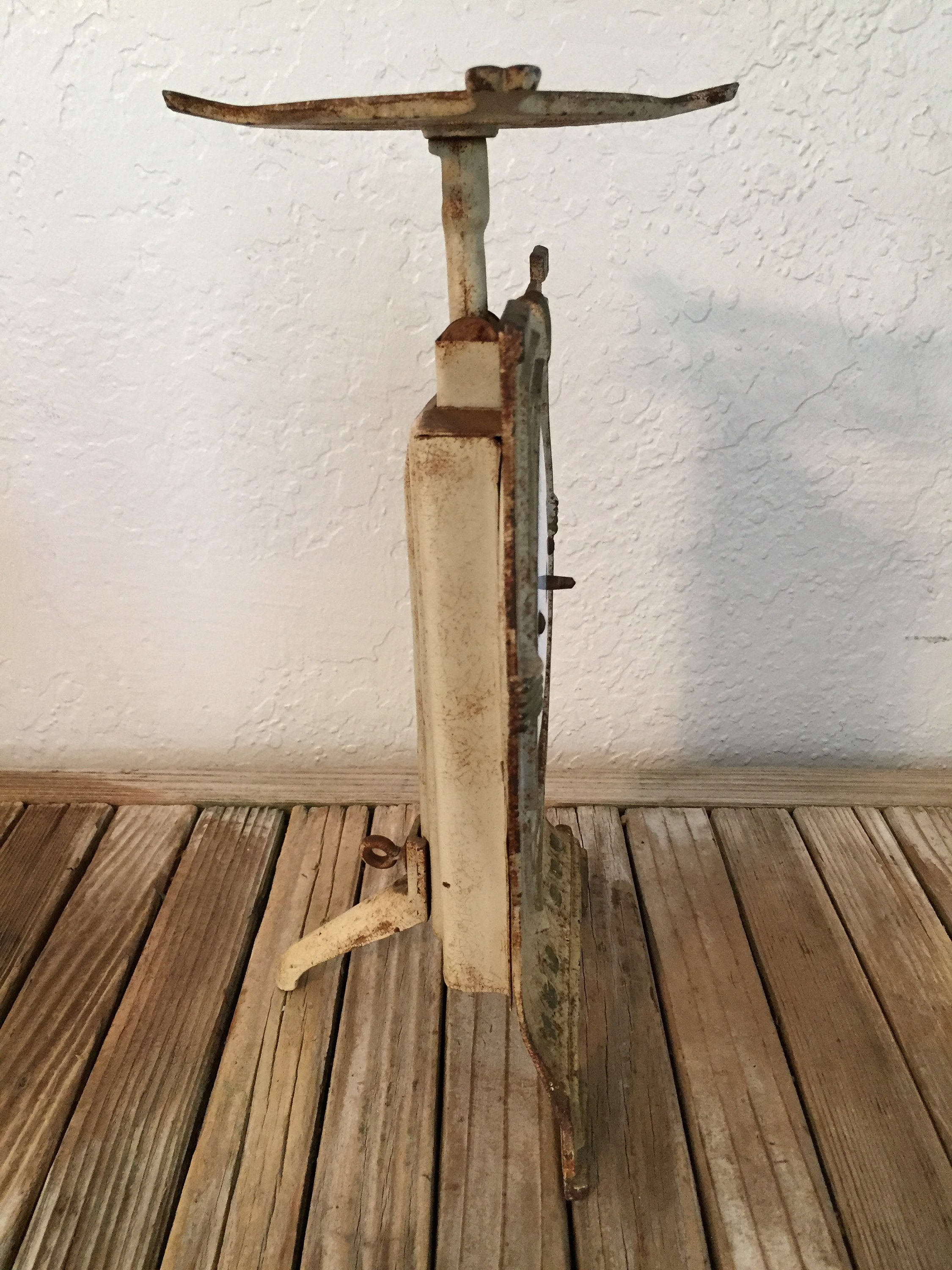 Antique metal scale. In great aged condition, normal wear due to age and use. The scale has surface scrapes, markings and discoloration throughout. The piece also shows rusting through the faded and chipped paint. The hands of the scale are missing and this has not been tested as functional, please see pictures. A beautiful, unique hard to find scale to add to any home for display or in a shop.