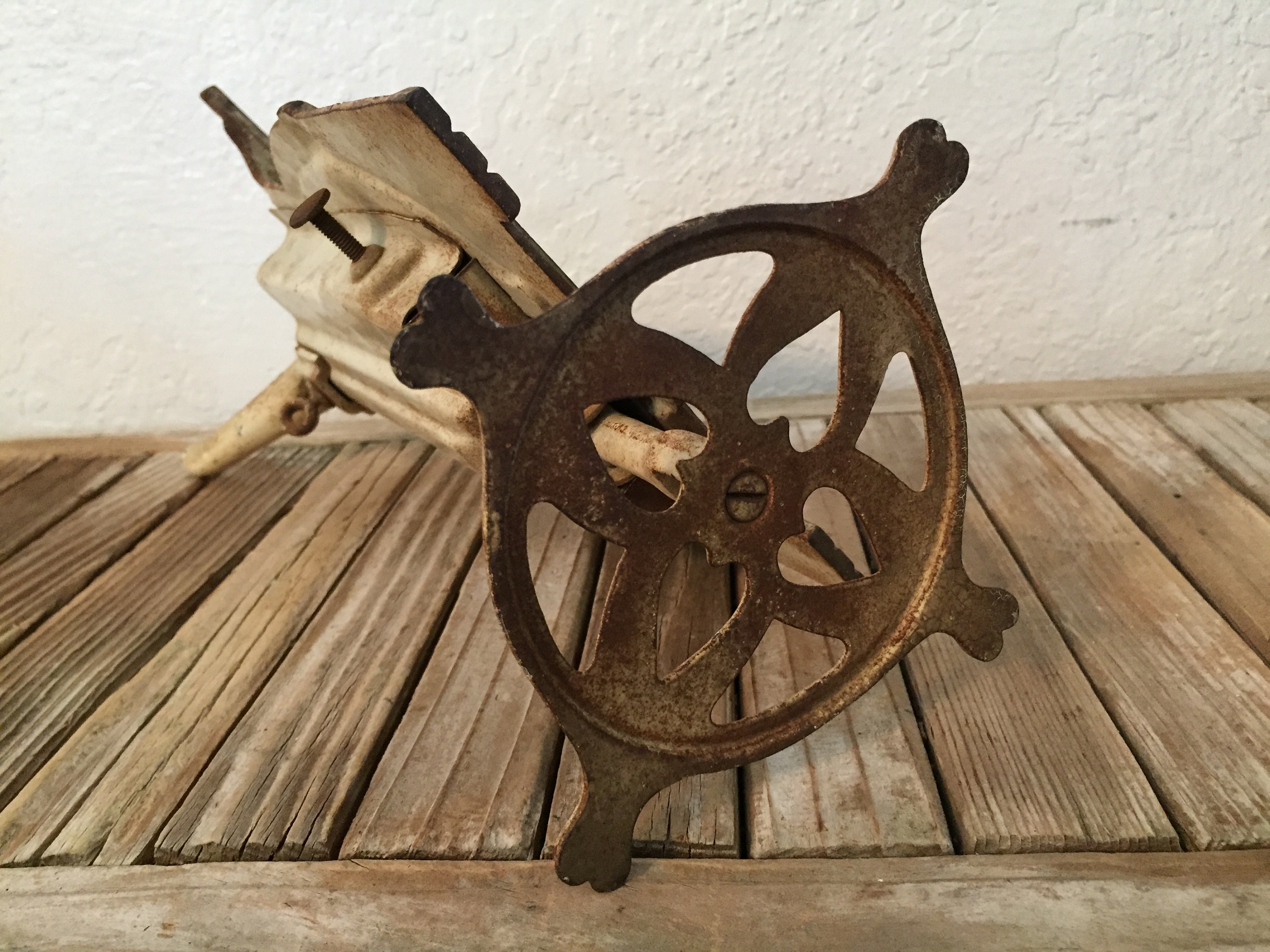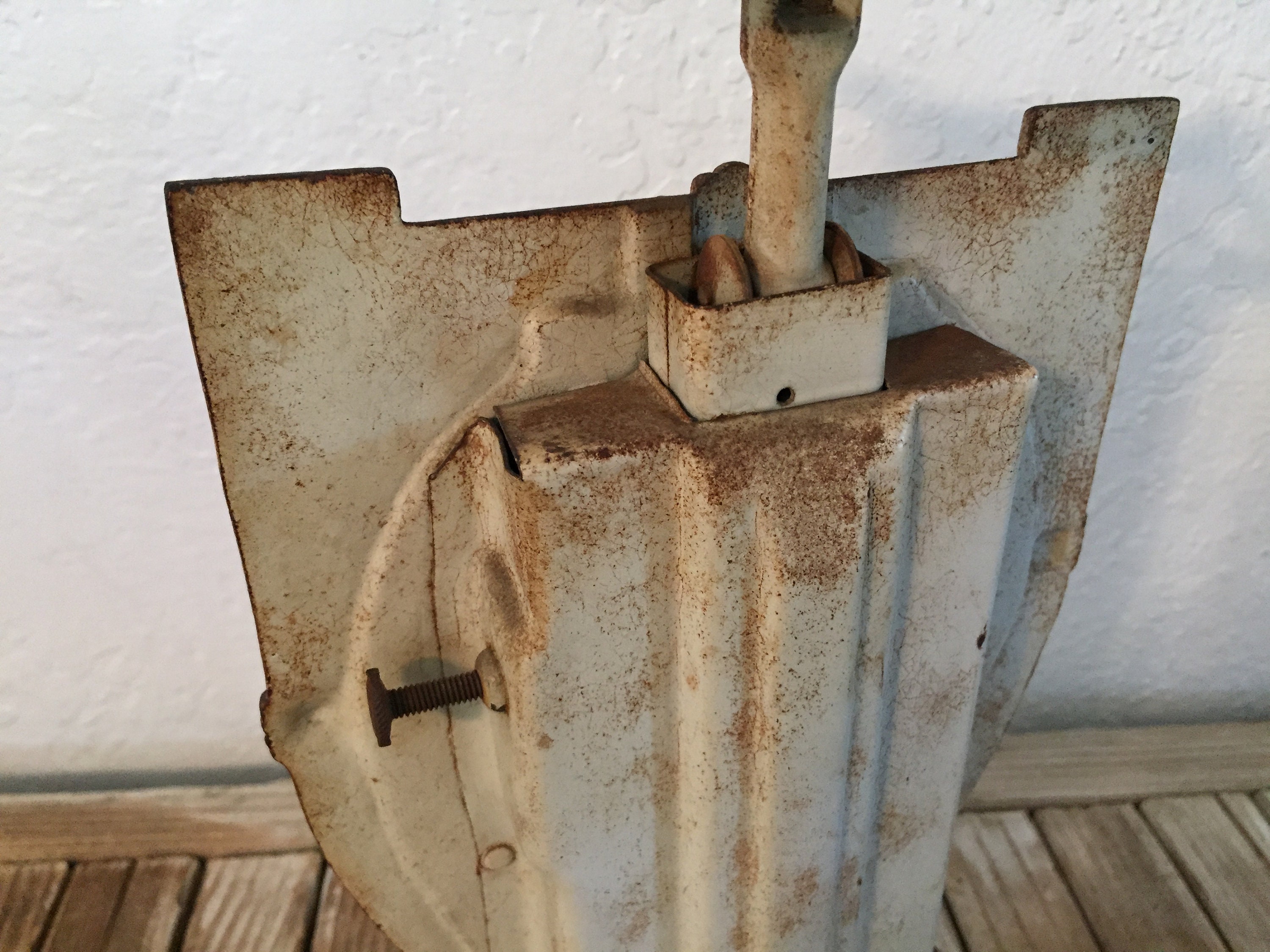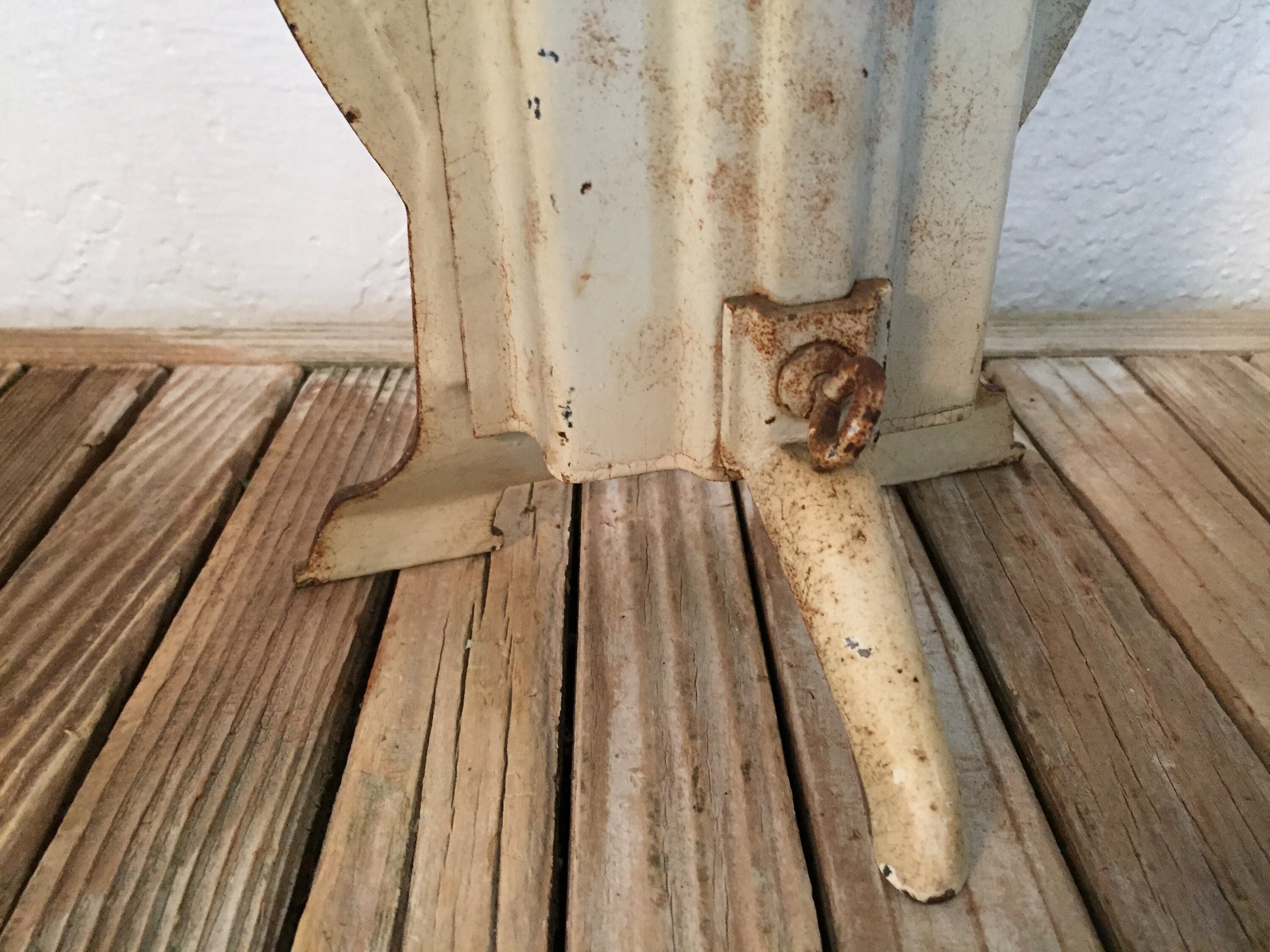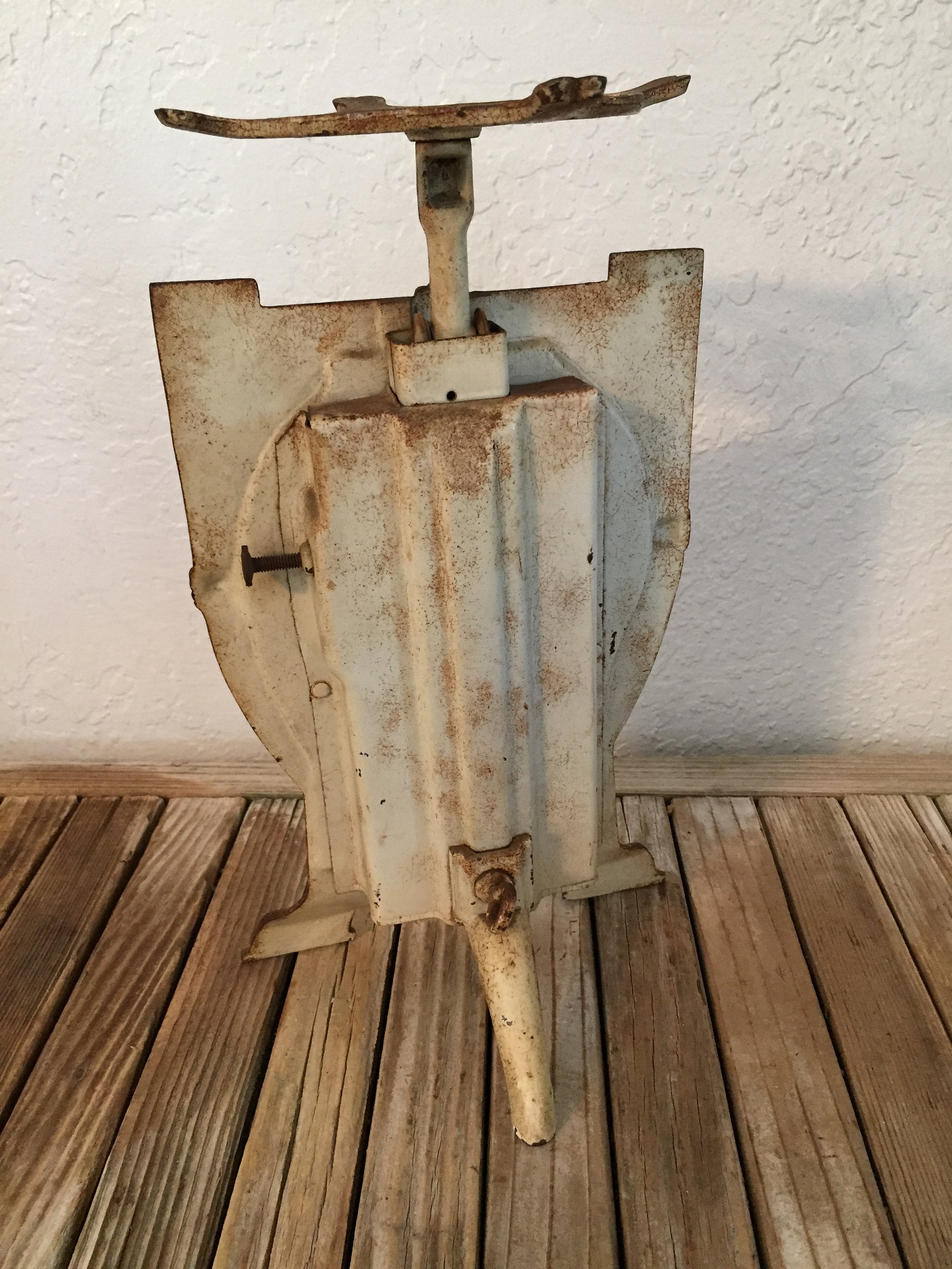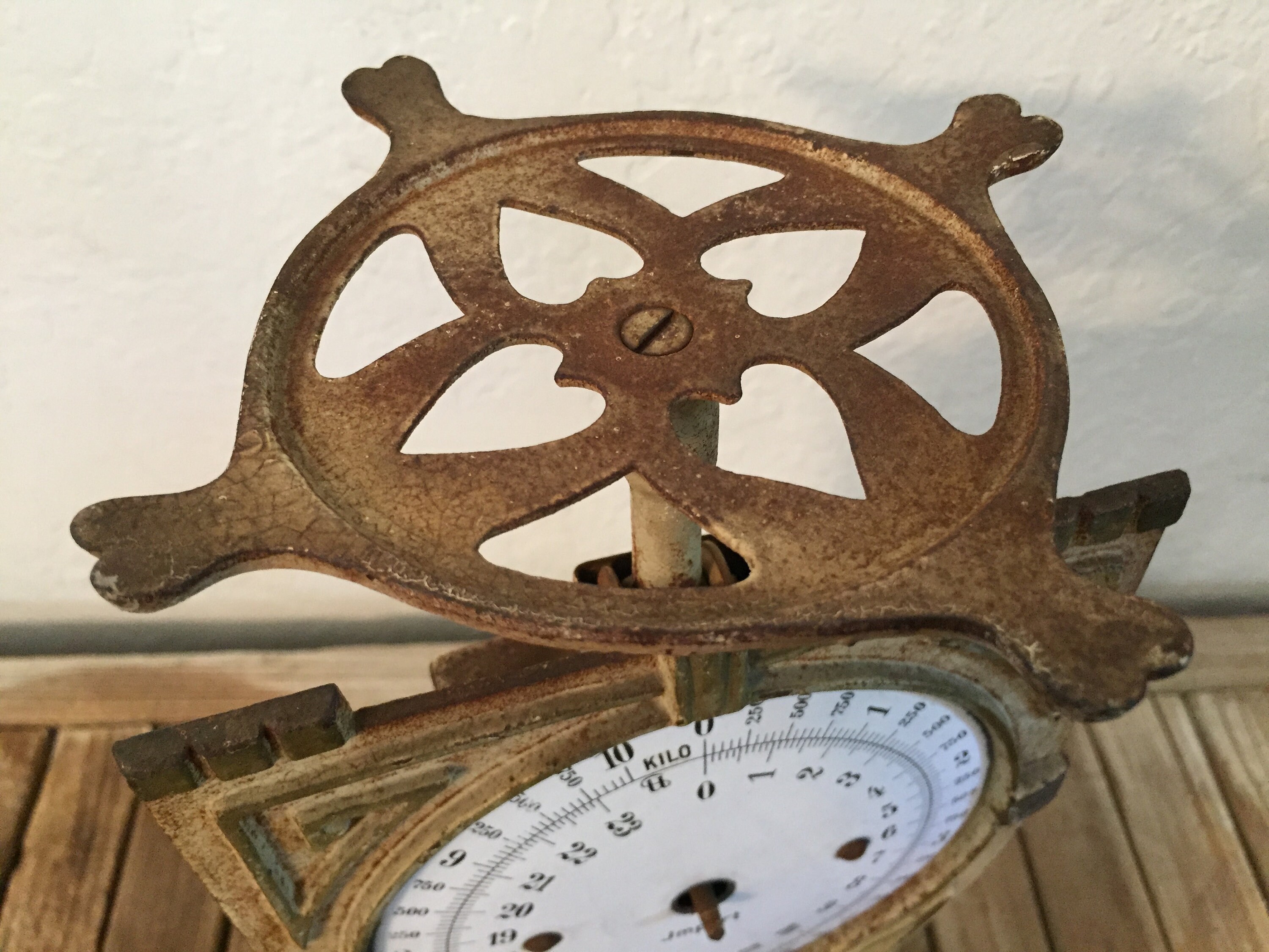 Antique metal scale. In great aged condition, normal wear due to age and use. The scale has surface scrapes, markings and discoloration throughout. The piece also shows rusting through the faded and chipped paint. The hands of the scale are missing and this has not been tested as functional, please see pictures. A beautiful, unique hard to find scale to add to any home for display or in a shop.